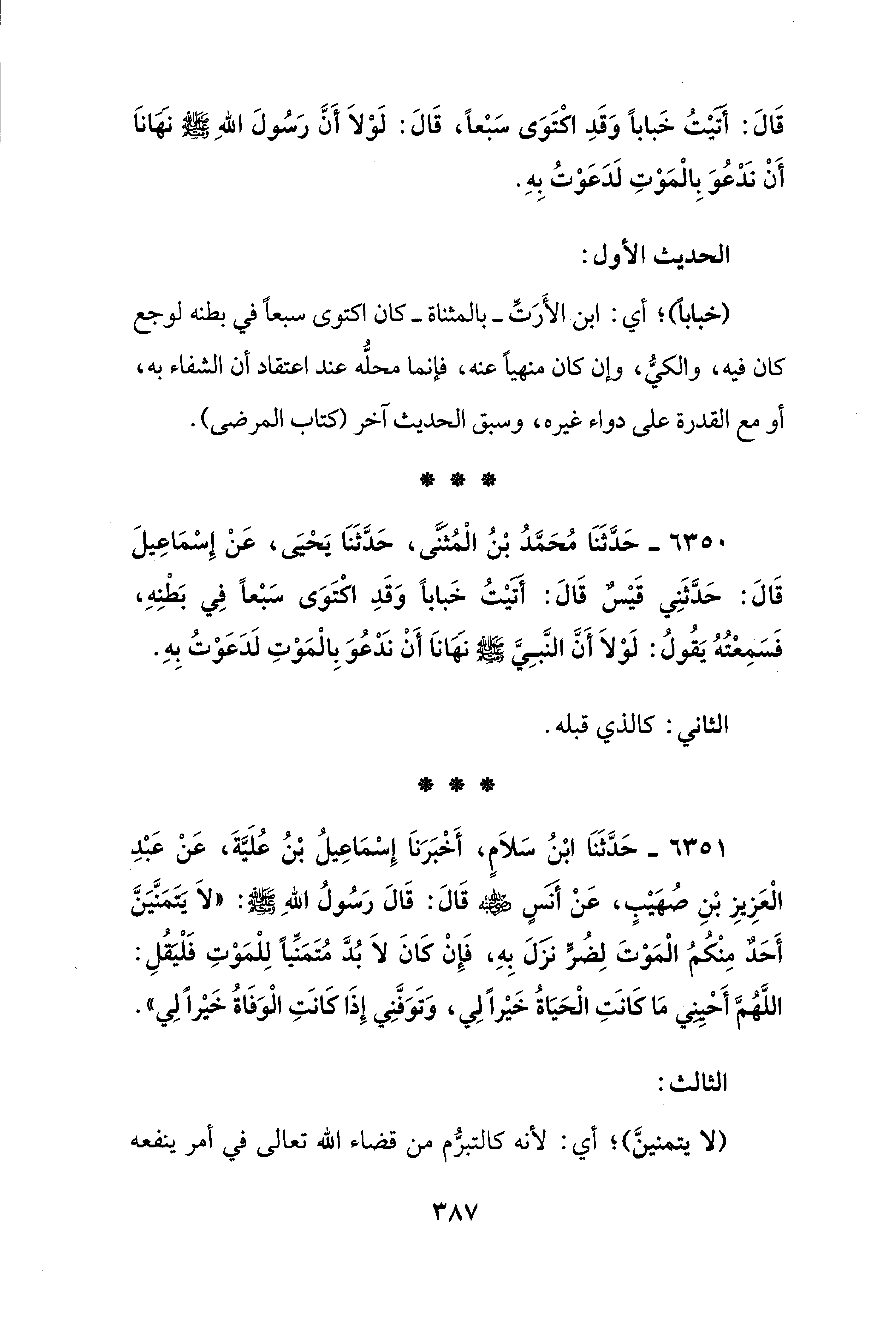 قَالَ: أتيْتُ خَبابًا وَقَدِ اكتَوَى سَبْعًا، قَالَ: لَوْلَا أَنَّ رَسُولَ اللهِ - صلى الله عليه وسلم - نهانَا أَنْ نَدْعُوَ بِالْمَوْتِ لَدَعَوْتُ بِهِ.