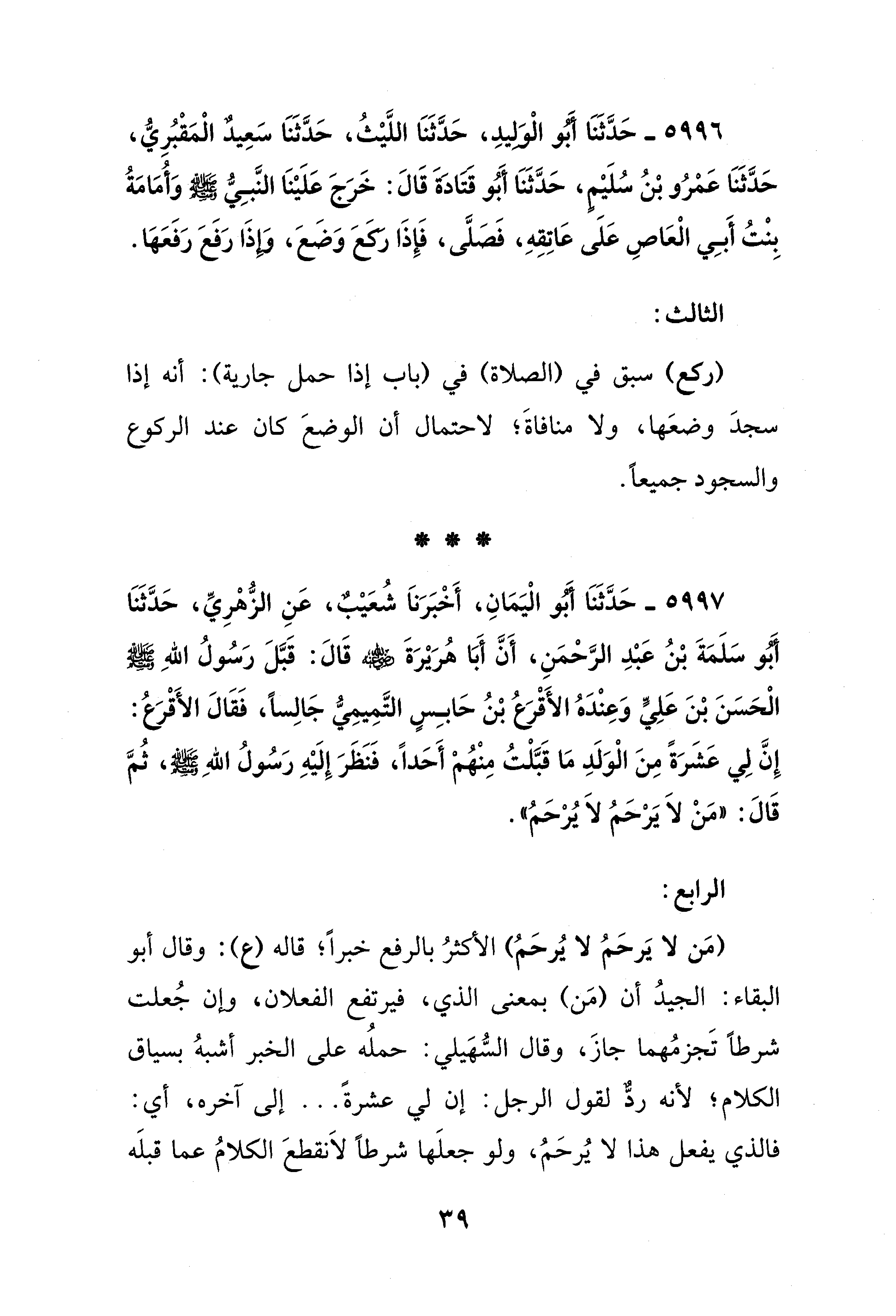 5997 - حَدَّثَنَا أَبُو الْيَمَانِ، أَخْبَرَنَا شُعَيْبٌ، عَنِ الزُّهْرِيِّ، حَدَّثَنَا أَبُو سَلَمَةَ بْنُ عَبْدِ الرَّحْمَنِ، أَنَّ أَبَا هُرَيْرَةَ - رضي الله عنه - قَالَ: قَبَّلَ رَسُولُ اللهِ - صلى الله عليه وسلم - الْحَسَنَ بْنَ عَلِيٍّ وَعِنْدَهُ الأَقْرَعُ بْنُ حَابِسٍ التَّمِيمِيُّ جَالِسًا، فَقَالَ الأَقْرَعُ: إِنَّ لِي عَشَرَةً مِنَ الْوَلَدِ مَا قَبَّلْتُ مِنْهُمْ أَحَدًا، فَنَظَرَ إِلَيْهِ رَسُولُ اللهِ - صلى الله عليه وسلم -، ثُمَّ قَالَ: "مَنْ لَا يَرْحَمُ لَا يُرْحَمُ".