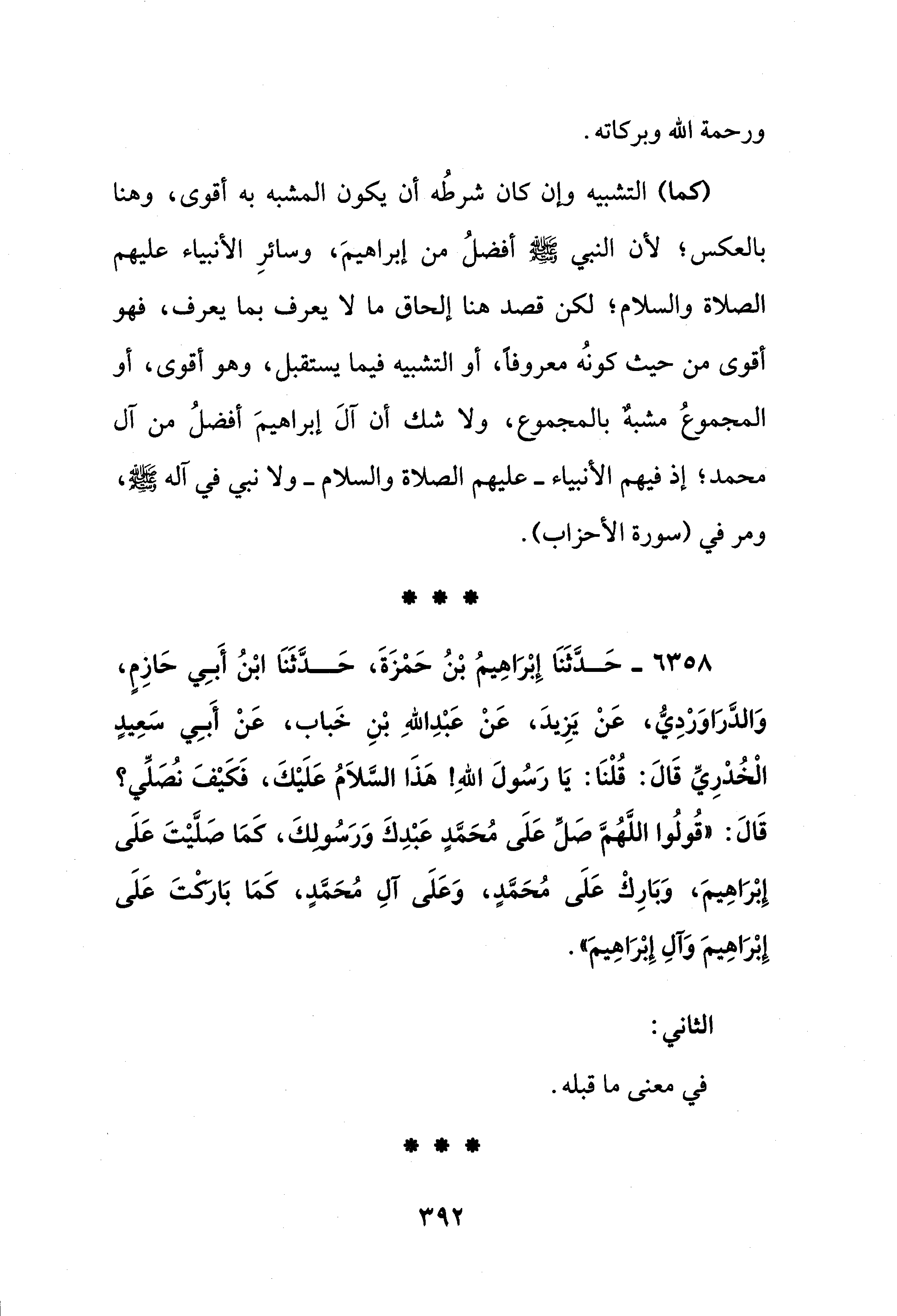 (كما) التشبيه وإن كان شرطُه أن يكون المشبه به أقوى، وهنا بالعكس؛ لأن النبي - صلى الله عليه وسلم - أفضلُ من إبراهيمَ، وسائرِ الأنبياء عليهم الصلاة والسلام؛ لكن قصد هنا إلحاق ما لا يعرف بما يعرف، فهو أقوى من حيث كونُه معروفًا، أو التشبيه فيما يستقبل، وهو أقوى، أو المجموعُ مشبهٌ بالمجموع، ولا شك أن آلَ إبراهيمَ أفضلُ من آل محمد؛ إذ فيهم الأنبياء -عليهم الصلاة والسلام- ولا نبي في آله - صلى الله عليه وسلم -، ومر في (سورة الأحزاب).