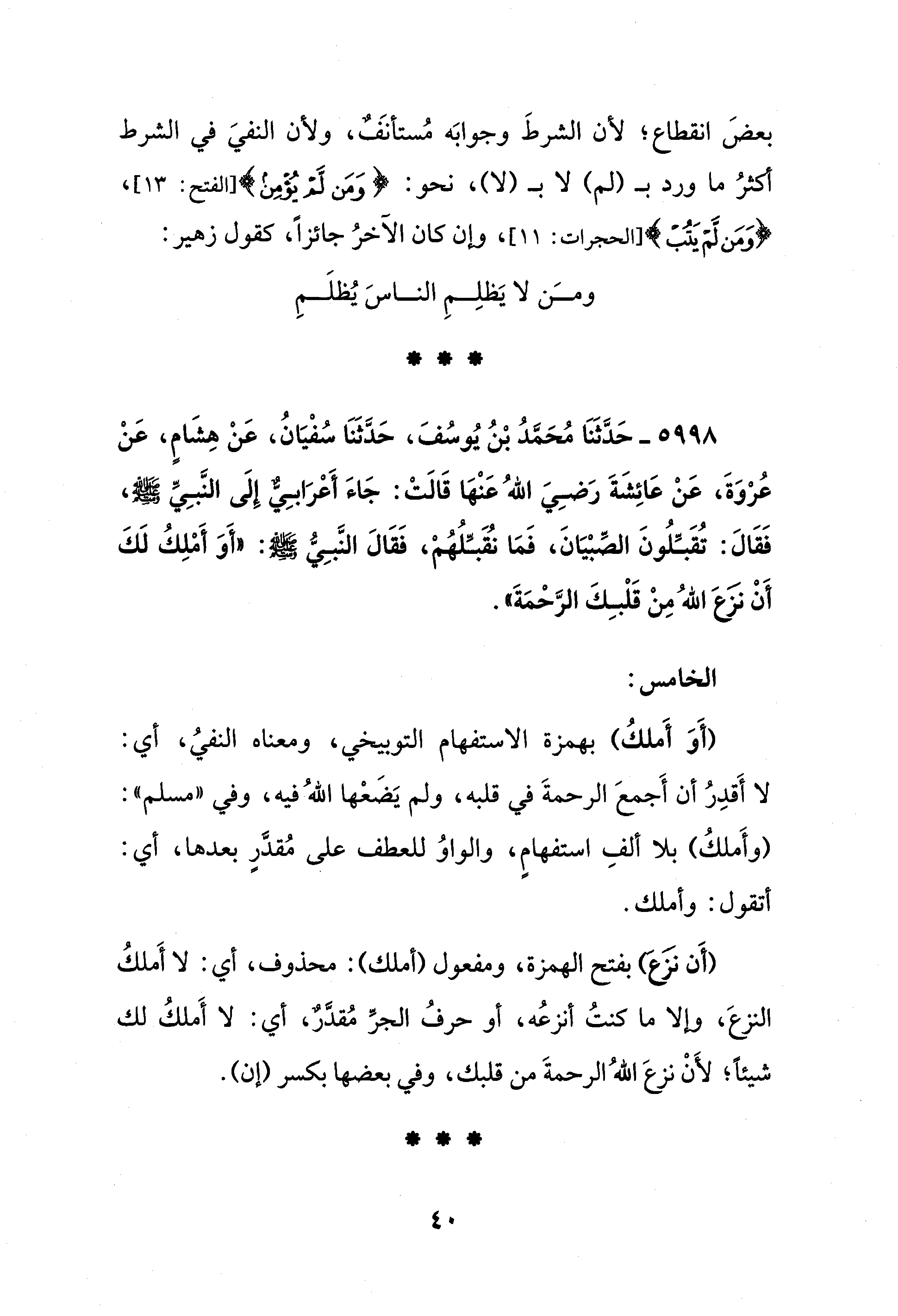 5998 - حَدَّثنا مُحَمَّدُ بْنُ يُوسُفَ، حَدَّثَنَا سُفْيَانُ، عَنْ هِشَامٍ، عَنْ عُرْوَةَ، عَنْ عَائِشَةَ رَضِيَ اللهُ عَنْهَا قَالَتْ: جَاءَ أَعْرَابِي إِلَى النَّبِيِّ - صلى الله عليه وسلم -، فَقَالَ: تُقَبِّلُونَ الصِّبْيَانَ، فَمَا نُقَبِّلُهُمْ، فَقَالَ النَّبِيُّ - صلى الله عليه وسلم -: "أَوَ أَمْلِكُ لَكَ أَنْ نزَعَ اللهُ مِنْ قَلْبِكَ الرَّحْمَةَ".
