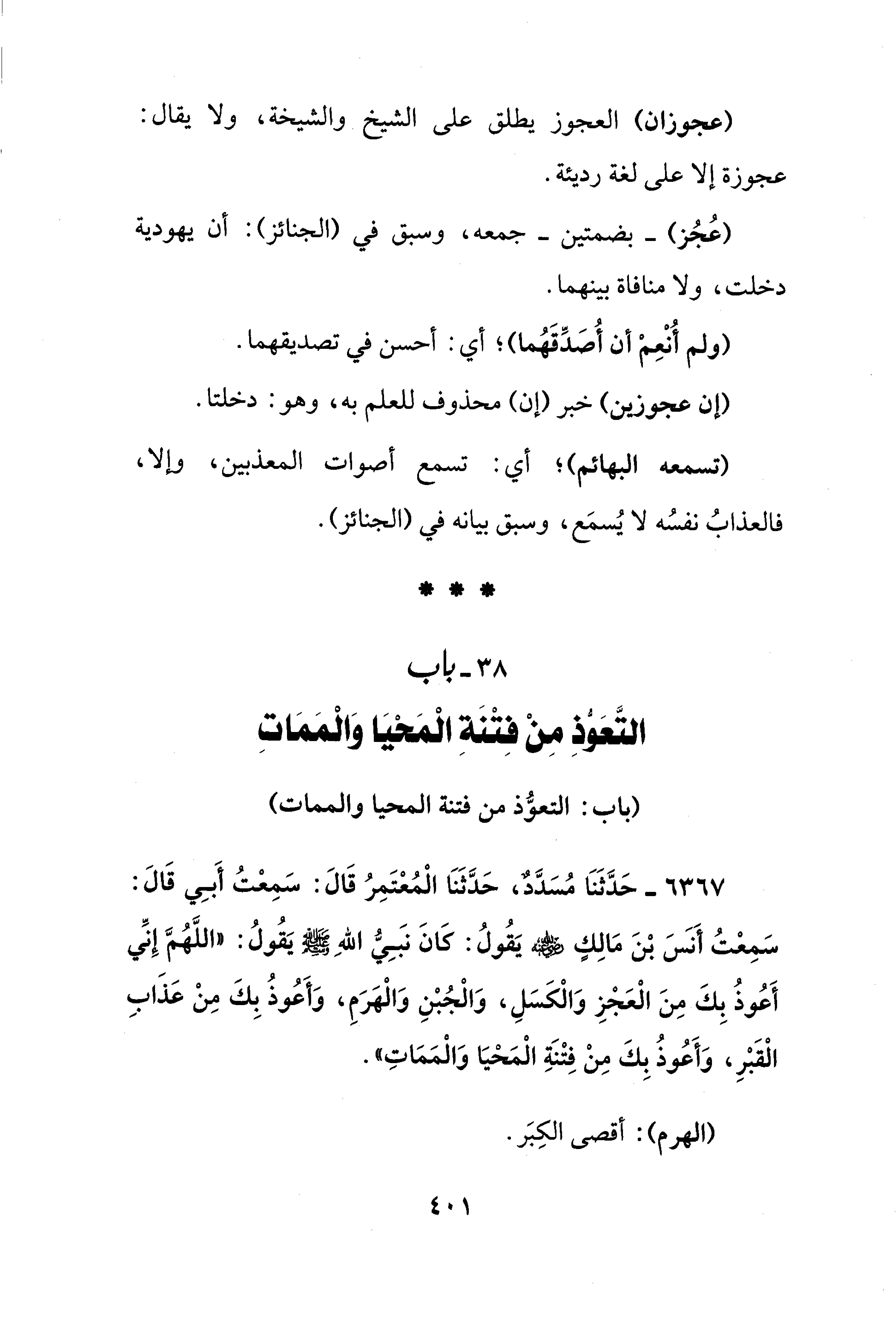 6367 - حَدَّثَنَا مُسَدَّدٌ، حَدَّثَنَا الْمُعْتَمِرُ قَالَ: سَمِعْتُ أَبِي قَالَ: سَمِعْتُ أَنس بْنَ مَالِكٍ - رضي الله عنه - يَقُولُ: كَانَ نبَيُّ اللهِ - صلى الله عليه وسلم - يَقُولُ: "اللَّهُمَّ إِنِّي أَعُوذُ بِكَ مِنَ الْعَجْزِ وَالْكَسَلِ، وَالْجُبْنِ وَالْهَرَمِ، وَأَعُوذُ بِكَ مِنْ عَذَابِ الْقَبْرِ، وَأَعُوذُ بِكَ مِنْ فِتْنَةِ الْمَحْيَا وَالْمَمَاتِ".