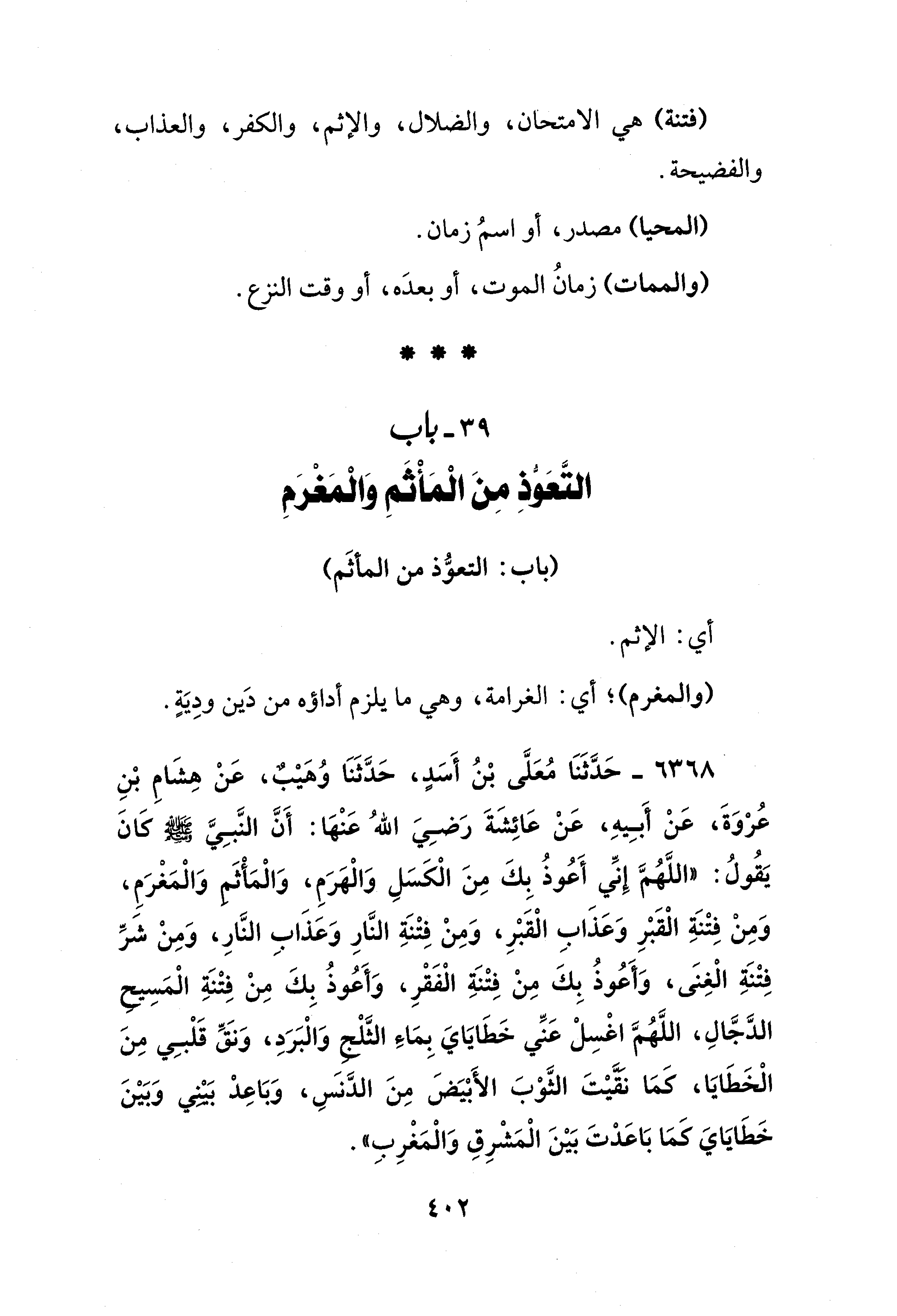 6368 - حَدَّثَنَا مُعَلَّى بْنُ أَسَدٍ، حَدَّثَنَا وُهَيْبٌ، عَنْ هِشَامِ بْنِ عُرْوَةَ، عَنْ أَبِيهِ، عَنْ عَائِشَةَ رَضِيَ اللهُ عَنْهَا: أَنَّ النَّبِيَّ - صلى الله عليه وسلم - كَانَ يَقُولُ: "اللَّهُمَّ إِنِّي أَعُوذُ بِكَ مِنَ الْكَسَلِ وَالْهَرَمِ، وَالْمَأْثَم وَالْمَغْرَمِ، وَمِنْ فِتْنَةِ الْقَبْرِ وَعَذَابِ الْقَبْرِ، وَمِنْ فِتْنَةِ النَّارِ وَعَذَابِ النَّارِ، وَمِنْ شَرِّ فِتْنَةِ الْغِنَى، وَأَعُوذُ بِكَ مِنْ فِتْنَةِ الْفَقْرِ، وَأَعُوذُ بِكَ مِنْ فِتْنَةِ الْمَسِيح الدَّجَّالِ، اللَّهُمَّ اغْسِلْ عَنِّي خَطَايَايَ بِمَاءِ الثَّلْجِ وَالْبَرَدِ، وَنَقِّ قَلْبِي مِنَ الْخَطَايَا، كَمَا نَقَّيْتَ الثَّوْبَ الأَبْيَضَ مِنَ الدَّنسِ، وَبَاعِدْ بَيْنِي وَبَيْنَ خَطَايَايَ كَمَا بَاعَدْتَ بَيْنَ الْمَشْرِقِ وَالْمَغْرِبِ".
