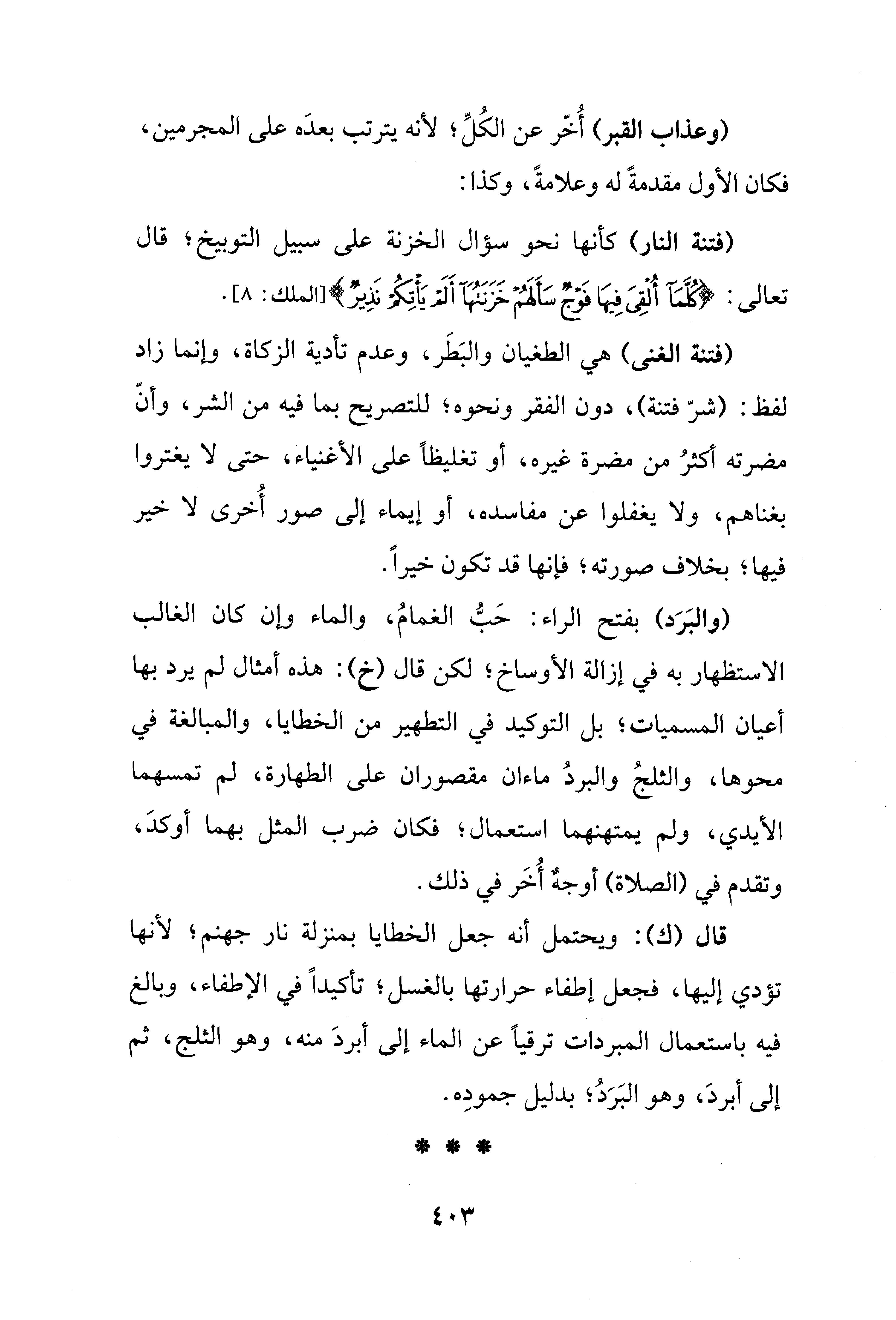(فتنة النار) كأنها نحو سؤال الخزنة على سبيل التوبيخ؛ قال تعالى: {كُلَّمَا أُلْقِيَ فِيهَا فَوْجٌ سَأَلَهُمْ خَزَنَتُهَا أَلَمْ يَأْتِكُمْ نَذِيرٌ} [الملك: 8].