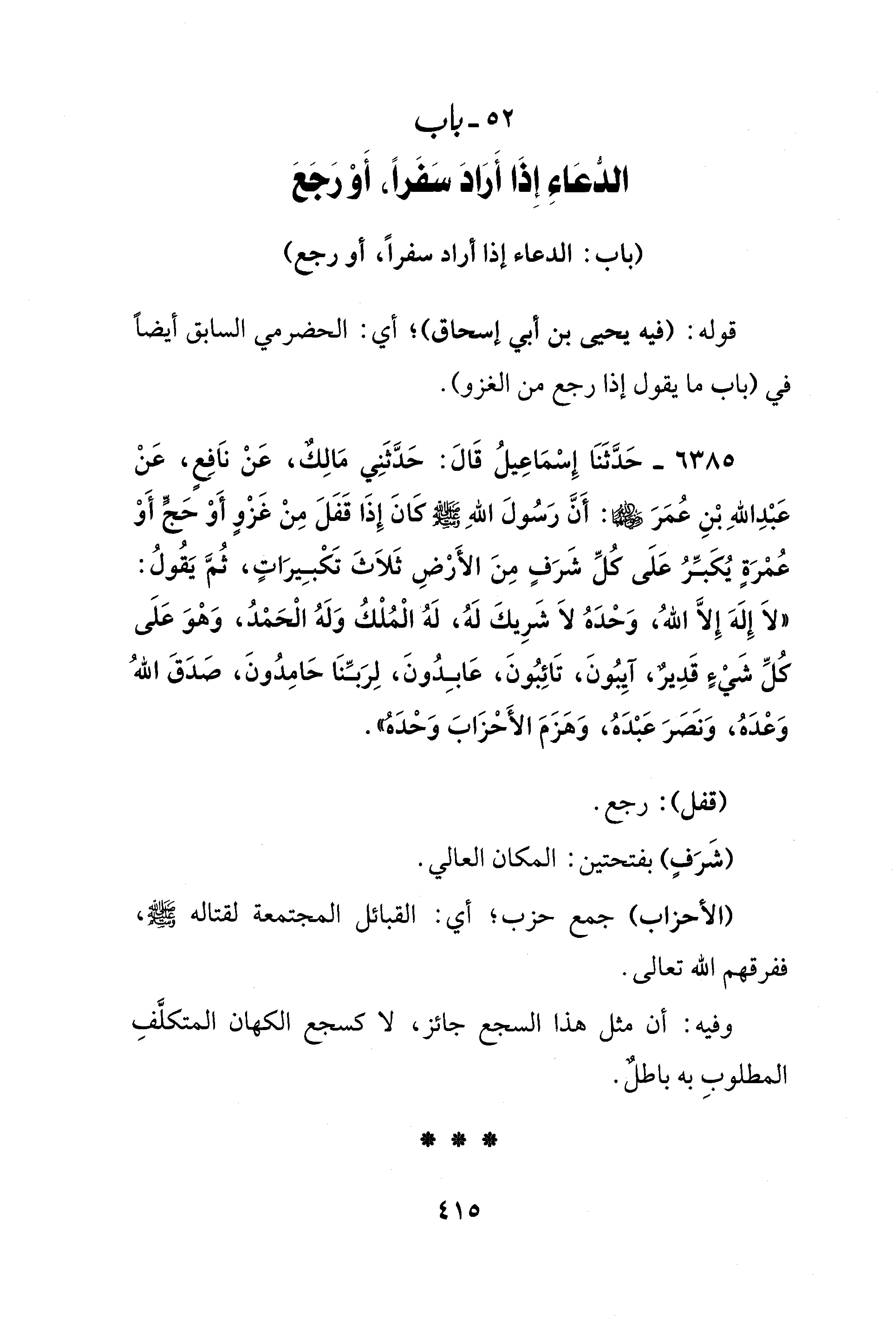 6385 - حَدَّثَنَا إِسْمَاعِيلُ قَالَ: حَدَّثَنِي مَالِكٌ، عَنْ نَافِعٍ، عَنْ عَبْدِ اللهِ بْنِ عُمَرَ - رضي الله عنهما -: أَنَّ رَسُولَ اللهِ - صلى الله عليه وسلم - كَانَ إِذَا قَفَلَ مِنْ غَزْوٍ أَوْ حَجٍّ أَوْ عُمْرَةٍ يُكَبِّرُ عَلَى كُلِّ شَرَفٍ مِنَ الأَرْضِ ثَلَاثَ تَكْبِيرَاتٍ، ثُمَّ يَقُولُ: "لَا إِلَهَ إلا اللهُ، وَحْدَهُ لَا شَرِيكَ لَهُ، لَهُ الْمُلْكُ وَلَهُ الْحَمْدُ، وَهْوَ عَلَى كُلِّ شَيْءٍ قَدِيرٌ، آيِبُونَ، تَائِبُونَ، عَابِدُونَ، لِرَبِّنَا حَامِدُونَ، صَدَقَ اللهُ وَعْدَهُ، وَنَصَرَ عَبْدَهُ، وَهَزَمَ الأَحْزَابَ وَحْدَهُ".