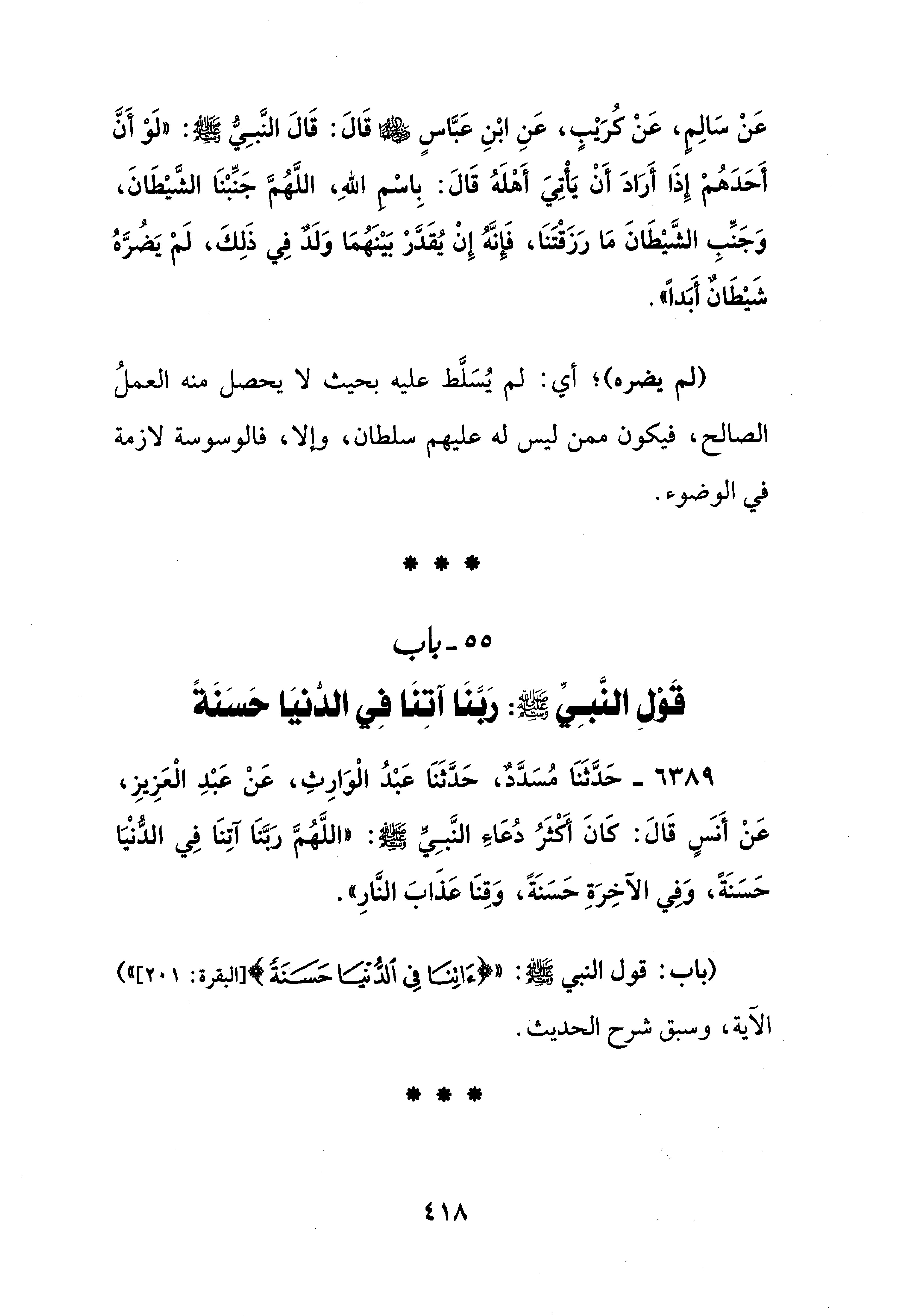 عَنْ سَالِمِ، عَنْ كُرَيْبٍ، عَنِ ابْنِ عَبَّاسٍ - رضي الله عنهما - قَالَ: قَالَ النَّبِيُّ - صلى الله عليه وسلم -: "لَوْ أَنَّ أَحَدَهُمْ إِذَا أَرَادَ أَنْ يَأْتِيَ أَهْلَهُ قَالَ: بِاسْمِ اللهِ، اللهُمَّ جَنِّبْنَا الشَّيْطَانَ، وَجَنِّبِ الشَّيْطَانَ مَا رَزَقْتَنَا، فَإِنَّهُ إِنْ يُقَدَّرْ بَيْنَهُمَا وَلَدٌ فِي ذَلِكَ، لَمْ يَضُرَّهُ شَيْطَانٌ أَبَدًا".