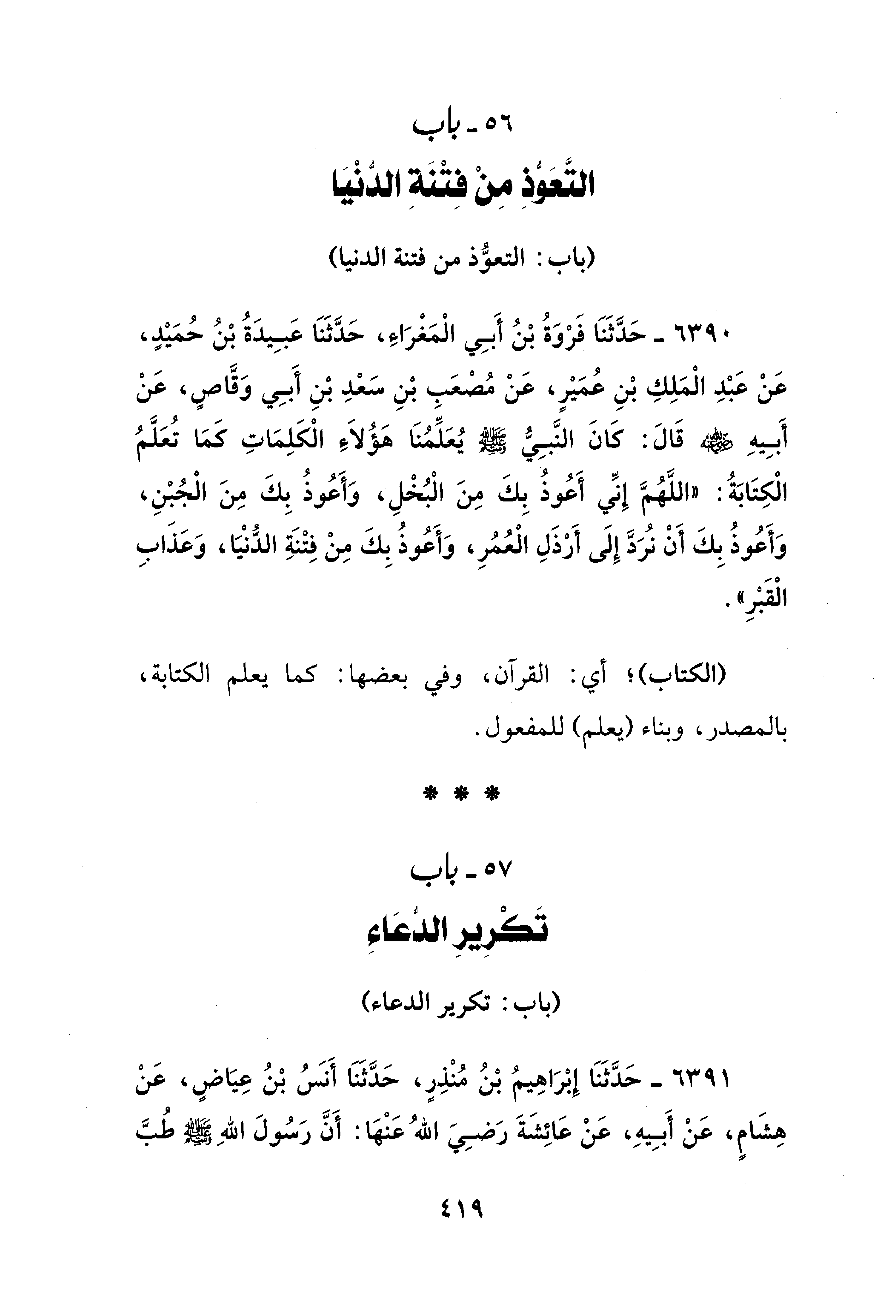 6390 - حَدَّثَنَا فَرْوَةُ بْنُ أَبِي الْمَغْرَاءِ، حَدَّثَنَا عَبِيدَةُ بْنُ حُمَيْدٍ، عَنْ عَبْدِ الْمَلِكِ بْنِ عُمَيْرٍ، عَنْ مُصْعَب بْنِ سَعْدِ بْنِ أَبِي وَقَّاصٍ، عَنْ أَبِيهِ - رضي الله عنه - قَالَ: كَانَ النَّبِيُّ - صلى الله عليه وسلم - يُعَلِّمُنَا هَؤُلَاءِ الْكَلِمَاتِ كَمَا تُعَلَّمُ الْكِتَابَةُ: "اللَّهُمَّ إِنِّي أَعُوذُ بِكَ مِنَ الْبُخْلِ، وَأَعُوذُ بِكَ مِنَ الْجُبْنِ، وَأَعُوذُ بِكَ أَنْ نُرَدَّ إِلَى أَرْذَلِ الْعُمُرِ، وَأَعُوذُ بِكَ مِنْ فِتْنَةِ الدُّنْيَا، وَعَذَابِ الْقَبْرِ".