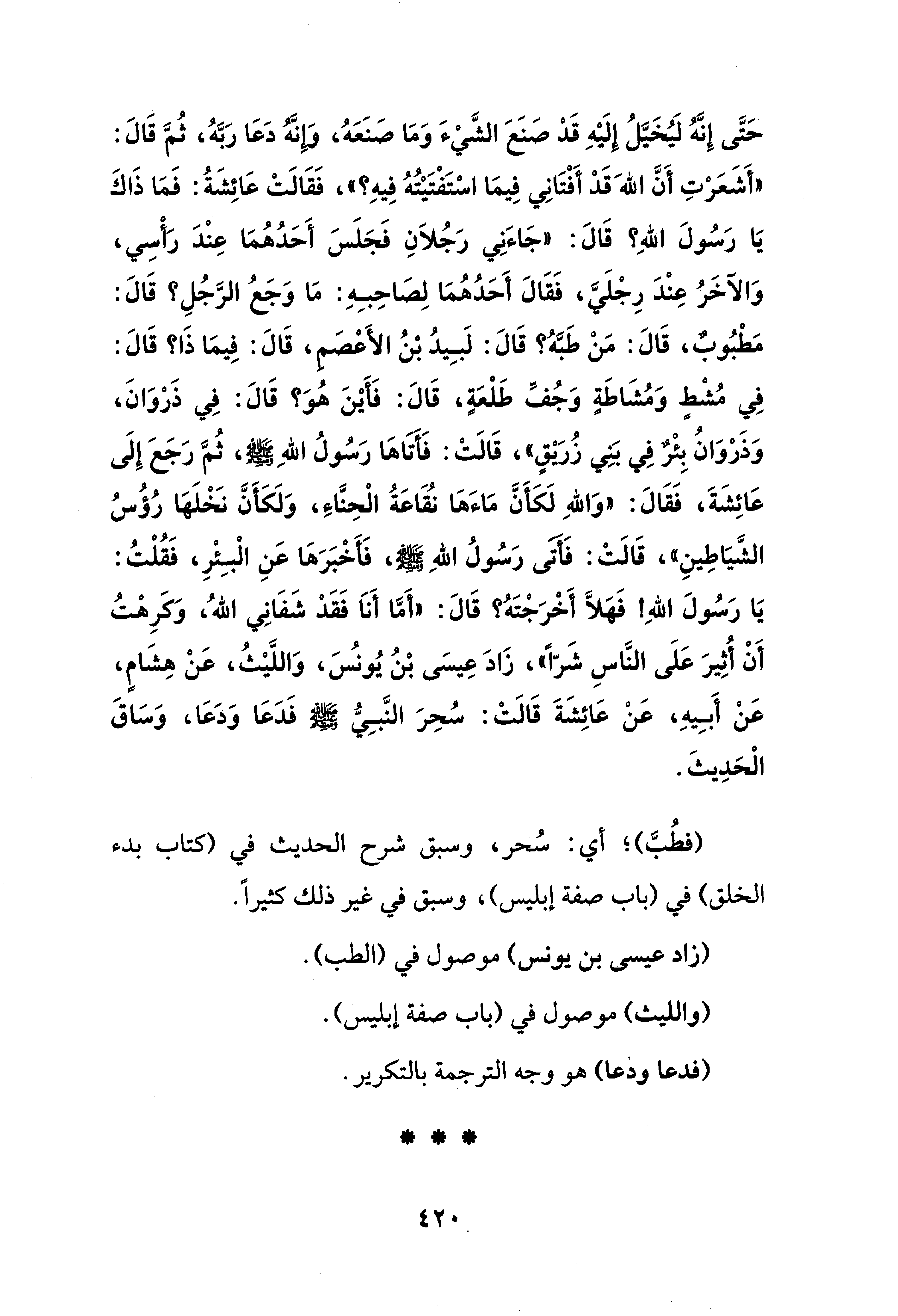حَتَّى إِنَّهُ لَيُخَيَّلُ إِلَيْهِ قَدْ صَنَعَ الشَّيْءَ وَمَا صَنَعَهُ، وَإِنَّهُ دَعَا رَبَّهُ، ثُمَّ قَالَ: "أَشَعَرْتِ أَنَّ اللهَ قَدْ أَفْتَانِي فِيمَا اسْتَفْتَيْتُهُ فِيهِ؟ "، فَقَالَتْ عَائِشَةُ: فَمَا ذَاكَ يَا رَسُولَ اللهِ؟ قَالَ: "جَاءَنِي رَجُلَانِ فَجَلَسَ أَحَدُهُمَا عِنْدَ رَأْسِي، وَالآخَرُ عِنْدَ رِجْلَيَّ، فَقَالَ أَحَدُهُمَا لِصَاحِبِهِ: مَا وَجَعُ الرَّجُلِ؟ قَالَ: مَطْبُوبٌ، قَالَ: مَنْ طَبَّهُ؟ قَالَ: لَبِيدُ بْنُ الأَعْصَمِ، قَالَ: فِيمَا ذَا؟ قَالَ: فِي مُشْطٍ وَمُشَاطَةٍ وَجُفِّ طَلْعَةٍ، قَالَ: فَأَيْنَ هُوَ؟ قَالَ: فِي ذَرْوَانَ، وَذَرْوَانُ بِئْرٌ فِي بَنِي زُريْقٍ"، قَالَتْ: فَأَتَاهَا رَسُولُ اللهِ - صلى الله عليه وسلم -، ثُمَّ رَجَعَ إِلَى عَائِشَةَ، فَقَالَ: "وَاللهِ لَكَأَنَّ مَاءَهَا نُقَاعَةُ الْحِنَّاءِ، وَلَكَأَنَّ نَخْلَهَا رُؤُسُ الشَّيَاطِينِ"، قَالَتْ: فَأَتَى رَسُولُ اللهِ - صلى الله عليه وسلم -، فَأَخْبَرَهَا عَنِ الْبِئْرِ، فَقُلْتُ: يَا رَسُولَ اللهِ! فَهَلَّا أَخْرَجْتَهُ؟ قَالَ: "أَمَّا أَنَا فَقَدْ شَفَانِي اللهُ، وَكَرِهْتُ أَنْ أُثِيرَ عَلَى النَّاسِ شَرًّا"، زَادَ عِيسَى بْنُ يُونس، وَاللَّيْثُ، عَنْ هِشَامٍ، عَنْ أَبِيهِ، عَنْ عَائِشَةَ قَالَتْ: سُحِرَ النَّبِيُّ - صلى الله عليه وسلم - فَدَعَا وَدَعَا، وَسَاقَ الْحَدِيثَ.
