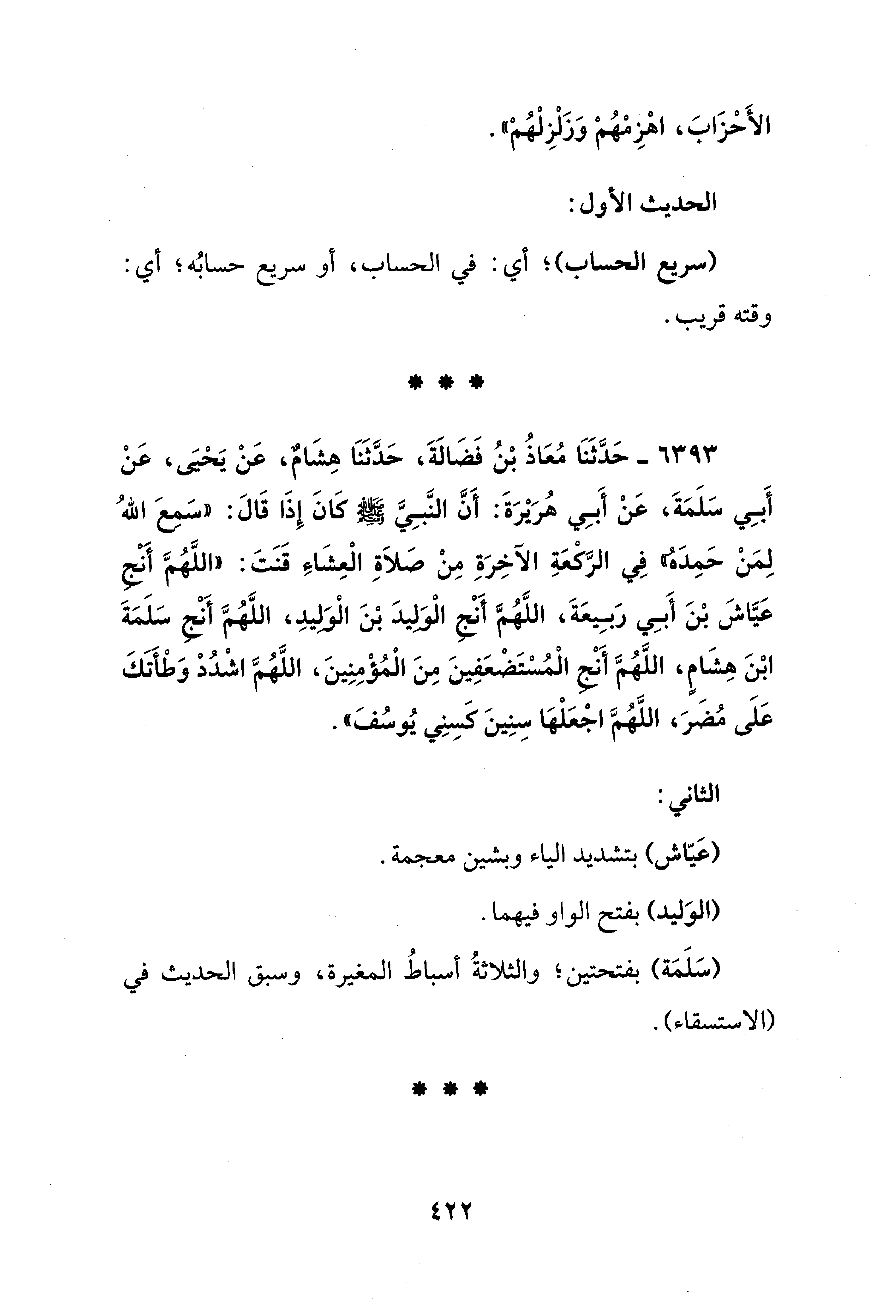 6393 - حَدَّثَنَا مُعَاذُ بْنُ فَضَالَةَ، حَدَّثَنَا هِشَامٌ، عَنْ يَحْيَى، عَنْ أَبِي سَلَمَةَ، عَنْ أَبِي هُرَيْرَةَ: أَنَّ النَّبِيَّ - صلى الله عليه وسلم - كَانَ إِذَا قَالَ: "سَمعَ اللهُ لِمَنْ حَمِدَهُ" فِي الرَّكْعَةِ الآخِرَةِ مِنْ صَلَاةِ الْعِشَاءِ قَنَتَ: "اللَّهُمَّ أَنجْ عَيَّاشَ بْنَ أَبِي رَبِيعَةَ، اللَّهُمَّ أَنْج الْوَلِيدَ بْنَ الْوَلِيدِ، اللَّهُمَّ أَنْجِ سَلَمَةَ بْنَ هِشَامٍ، اللَّهُمَّ أَنْجِ الْمُسْتَضْعَفِينَ مِنَ الْمُؤْمِنِينَ، اللَّهُمَّ اشْدُدْ وَطْأَتَكَ عَلَى مُضَرَ، اللَّهُمَّ اجْعَلْهَا سِنِينَ كَسِنِي يُوسُفَ".