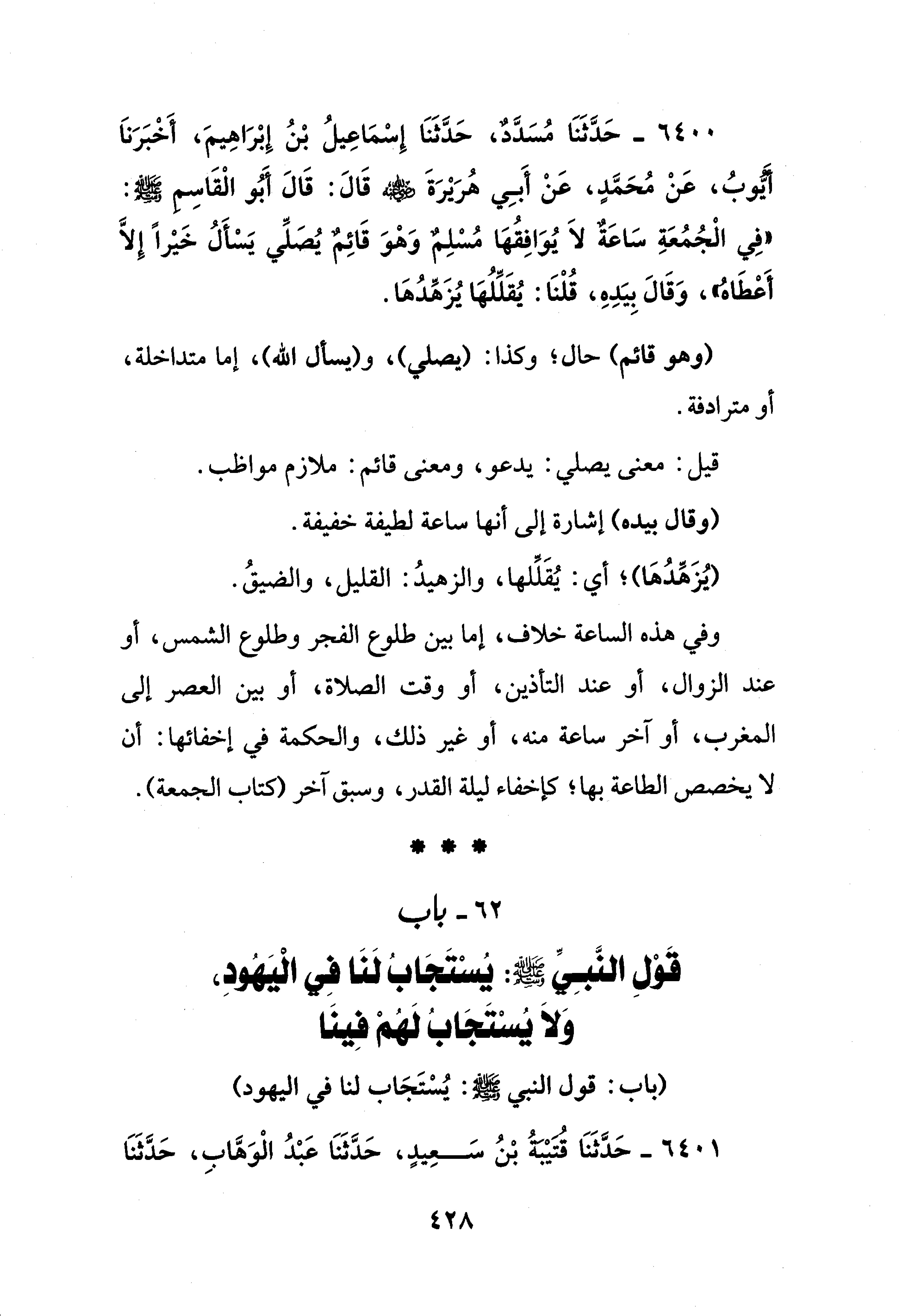 6400 - حَدَّثَنَا مُسَدَّدٌ، حَدَّثَنَا إِسْمَاعِيلُ بْنُ إِبْرَاهِيمَ، أَخْبَرَنَا أيُّوبُ، عَنْ مُحَمَّدٍ، عَنْ أَبِي هُرَيْرَةَ - رضي الله عنه - قَالَ: قَالَ أَبُو الْقَاسِمِ - صلى الله عليه وسلم -: "فِي الْجُمُعَةِ سَاعَةٌ لَا يُوَافِقُهَا مُسْلِمٌ وَهْوَ قَائِمٌ يُصَلِّي يَسْأَلُ خَيْرًا إلا أَعْطَاهُ"، وَقَالَ بِيَدِهِ، قُلْنَا: يُقَلِّلُهَا يُزَهِّدُهَا.
