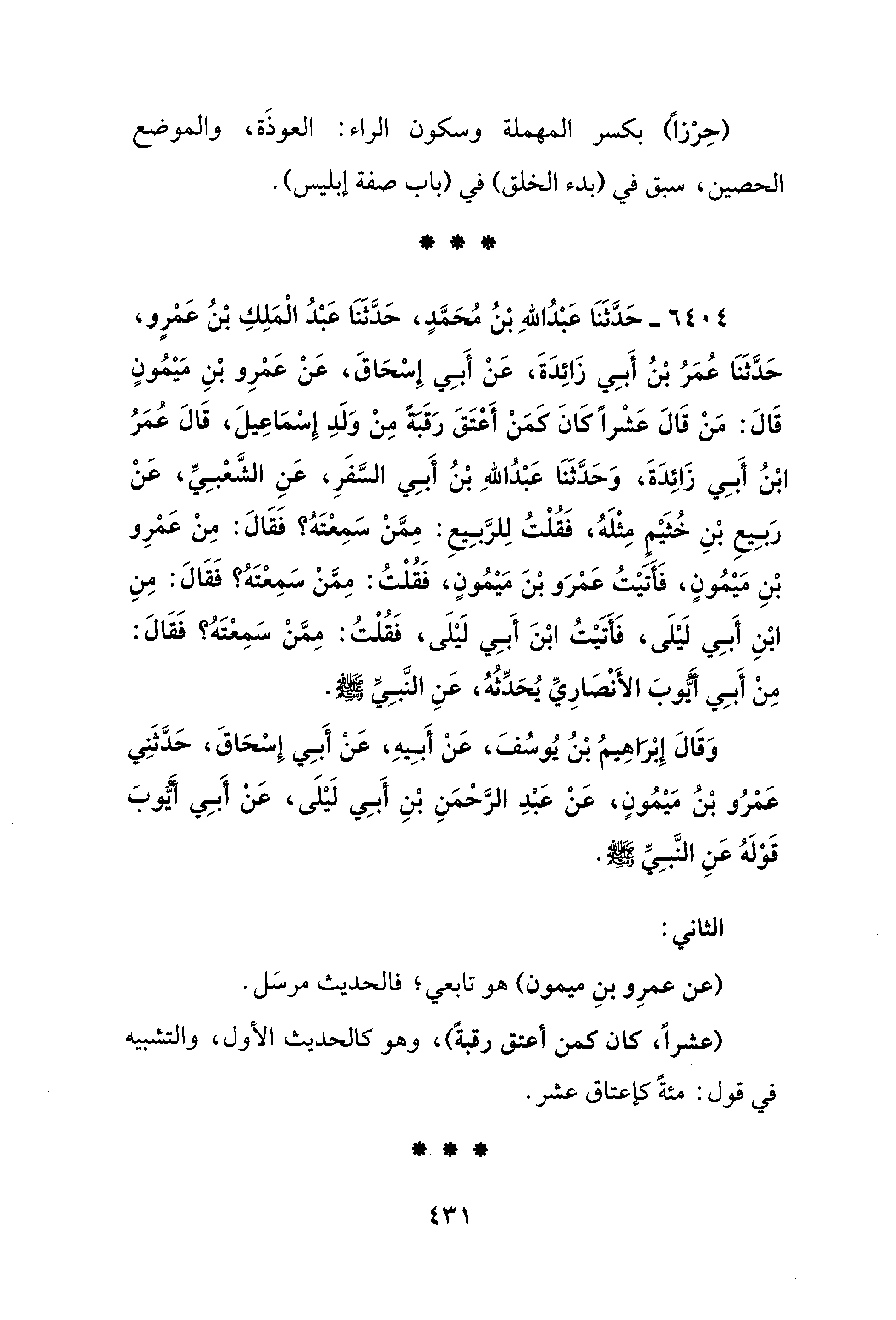 6404 - حَدَّثَنَا عَبْدُ اللهِ بْنُ مُحَمَّدٍ، حَدَّثَنَا عَبْدُ الْمَلِكِ بْنُ عَمْرٍو، حَدَّثَنَا عُمَرُ بْنُ أَبِي زَائِدَةَ، عَنْ أَبِي إِسْحَاقَ، عَنْ عَمْرِو بْنِ مَيْمُونٍ قَالَ: مَنْ قَالَ عَشْرًا كَانَ كَمَنْ أَعْتَقَ رَقَبةً مِنْ وَلَدِ إِسْمَاعِيلَ، قَالَ عُمَرُ بْنُ أَبِي زَائِدَةَ، وَحَدَّثَنَا عَبْدُ اللهِ بْنُ أَبِي السَّفَرِ، عَنِ الشَّعْبِيِّ، عَنْ رَبِيعِ بْنِ خُثَيْمِ مِثْلَهُ، فَقُلْتُ لِلرَّبِيعِ: مِمَّنْ سَمِعْتَهُ؟ فَقَالَ: مِنْ عَمْرِو بْنِ مَيْمُونٍ، فَأَتَيْتُ عَمْرَو بْنَ مَيْمُونٍ، فَقُلْتُ: مِمَّنْ سَمِعْتَهُ؟ فَقَالَ: مِنِ ابْنِ أَبِي لَيْلَى، فَأَتَيْتُ ابْنَ أَبِي لَيْلَى، فَقُلْتُ: مِمَّنْ سَمِعْتَهُ؟ فَقَالَ: مِنْ أَبِي أَيُّوبَ الأَنْصَارِيِّ يُحَدِّثُهُ، عَنِ النَّبِيِّ - صلى الله عليه وسلم -.