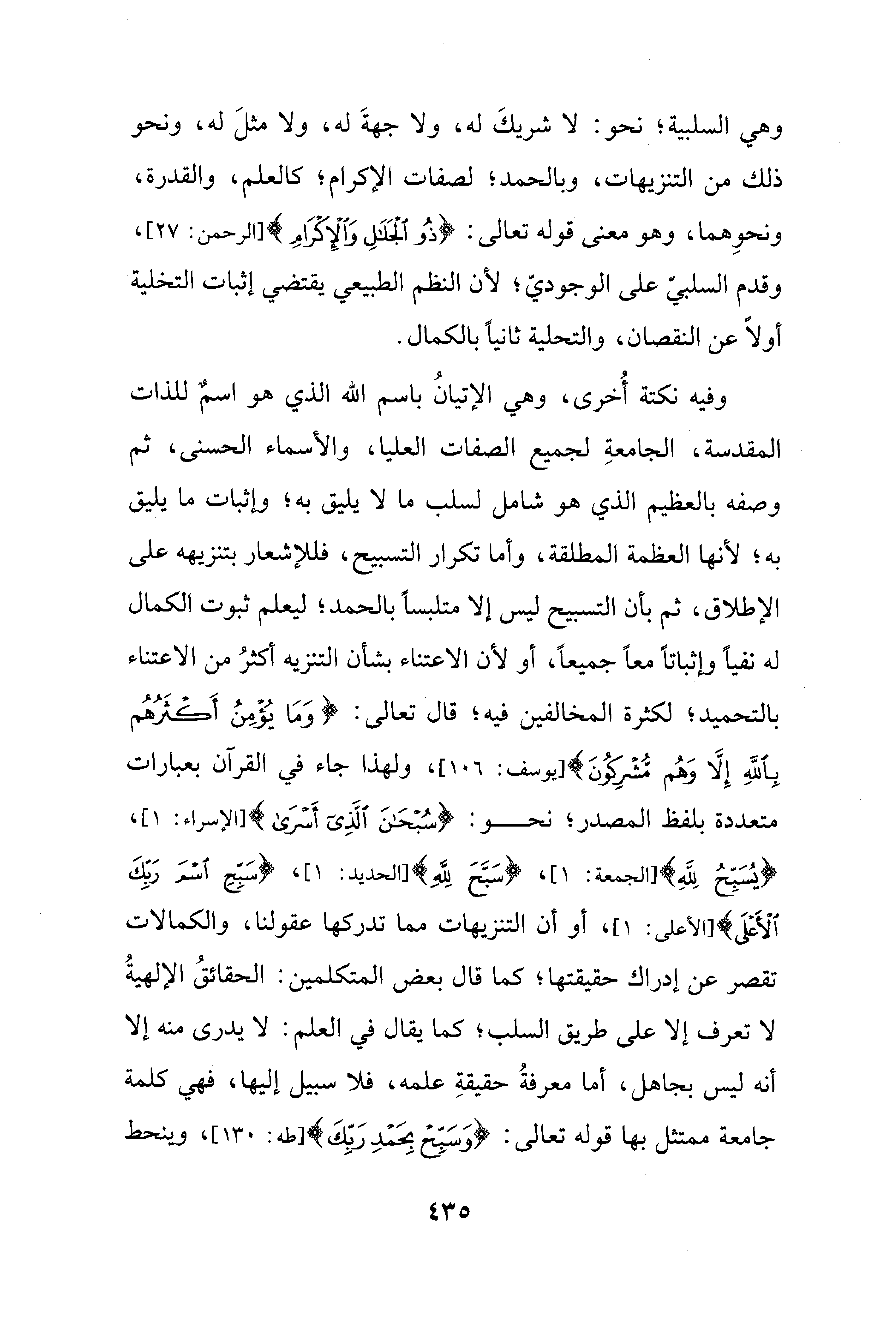 وهي السلبية؛ نحو: لا شريكَ له، ولا جهةَ له، ولا مثلَ له، ونحو ذلك من التنزيهات، وبالحمد؛ لصفات الإكرام؛ كالعلم، والقدرة، ونحوِهما، وهو معنى قوله تعالى: {ذُو الْجَلَالِ وَالْإِكْرَامِ} [الرحمن: 27]، وقدم السلبيّ على الوجوديّ؛ لأن النظم الطبيعي يقتضي إثبات التخلية أولًا عن النقصان، والتحلية ثانيًا بالكمال.
