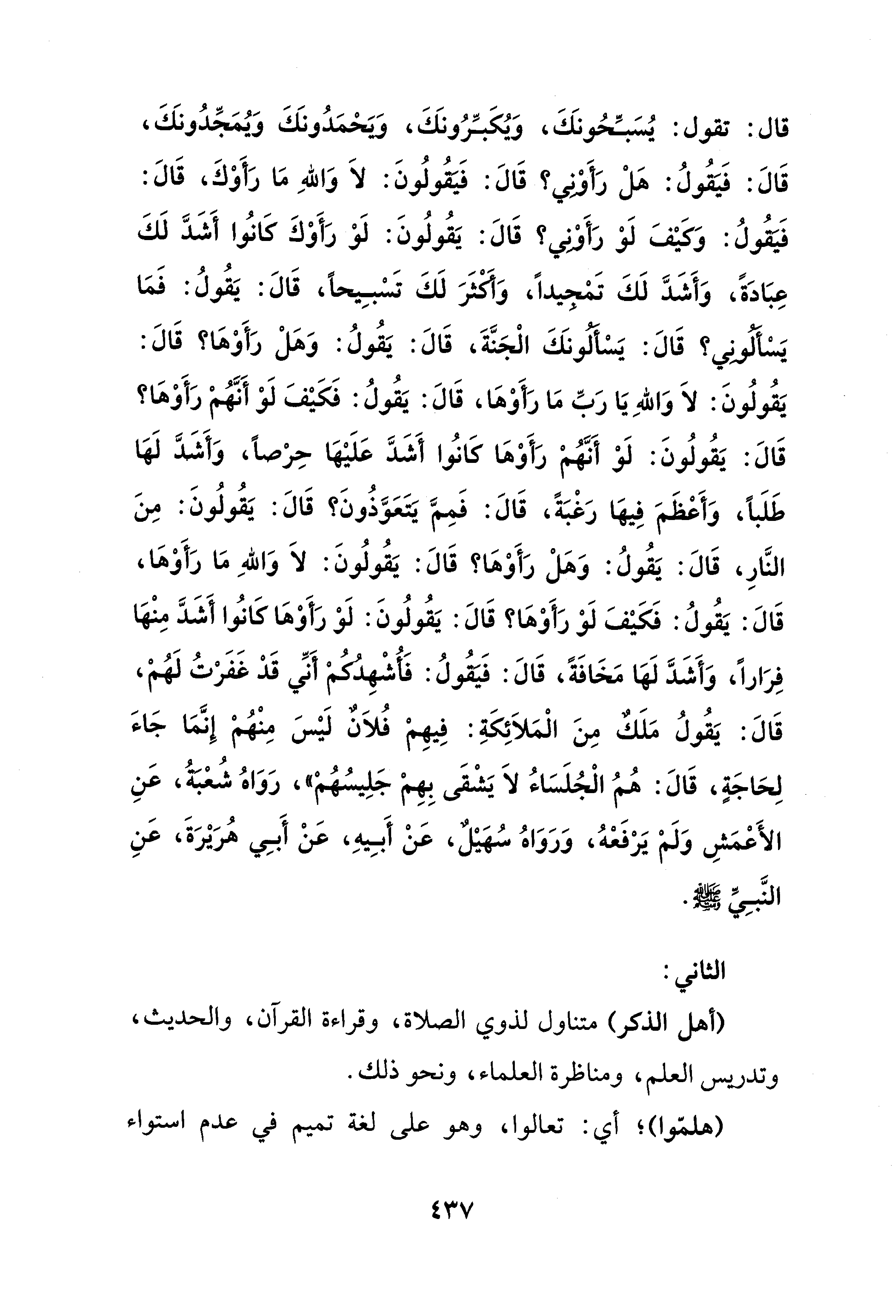 قال: تقول: يُسَبِّحُونَكَ، وَيُكَبِّرُونَكَ، وَيَحْمَدُونَكَ وَيُمَجِّدُونَكَ، قَالَ: فَيَقُولُ: هَلْ رَأَوْنِي؟ قَالَ: فَيَقُولُونَ: لَا وَاللهِ مَا رَأَوْكَ، قَالَ: فَيَقُولُ: وَكَيْفَ لَوْ رَأَوْنِي؟ قَالَ: يَقُولُونَ: لَوْ رَأَوْكَ كَانُوا أَشَدَّ لَكَ عِبَادَةً، وَأَشَدَّ لَكَ تَمْجيدًا، وَأَكْثَرَ لَكَ تَسْبِيحًا، قَالَ: يَقُولُ: فَمَا يَسْأَلُونِي؟ قَالَ: يَسْأَلُونَكَ الْجَنَّةَ، قَالَ: يَقُولُ: وَهَلْ رَأَوْهَا؟ قَالَ: يَقُولُونَ: لَا وَاللهِ يَا رَبِّ مَا رَأَوْهَا، قَالَ: يَقُولُ: فَكَيْفَ لَوْ أَنَّهُمْ رَأَوْهَا؟ قَالَ: يَقُولُونَ: لَوْ أَنَّهُمْ رَأَوْهَا كَانُوا أَشَدَّ عَلَيْهَا حِرْصًا، وَأَشَدَّ لَهَا طَلَبًا، وَأَعْظَمَ فِيهَا رَغْبَةً، قَالَ: فَمِمَّ يَتَعَوَّذُونَ؟ قَالَ: يَقُولُونَ: مِنَ النَّارِ، قَالَ: يَقُولُ: وَهَلْ رَأَوْهَا؟ قَالَ: يَقُولُونَ: لَا وَاللهِ مَا رَأَوْهَا، قَالَ: يَقُولُ: فَكَيْفَ لَوْ رَأَوْهَا؟ قَالَ: يَقُولُونَ: لَوْ رَأَوْهَا كَانُوا أَشَدَّ مِنْهَا فِرَارًا، وَأَشَدَّ لَهَا مَخَافَةً، قَالَ: فَيَقُولُ: فَأُشْهِدِكُمْ أَنِّي قَدْ غَفَرْتُ لَهُمْ، قَالَ: يَقُولُ مَلَكٌ مِنَ الْمَلَائِكَةِ: فِيهِمْ فُلَانٌ لَيْسَ مِنْهُمْ إِنَّمَا جَاءَ لِحَاجَةٍ، قَالَ: هُمُ الْجُلَسَاءُ لَا يَشْقَى بِهِمْ جَلِيسُهُمْ"، رَوَاهُ شُعْبَةُ، عَنِ الأَعْمَشِ وَلَمْ يَرْفَعْهُ، وَرَوَاهُ سُهَيْلٌ، عَنْ أَبِيهِ، عَنْ أَبِي هُرَيْرَةَ، عَنِ النَّبِيِّ - صلى الله عليه وسلم -.