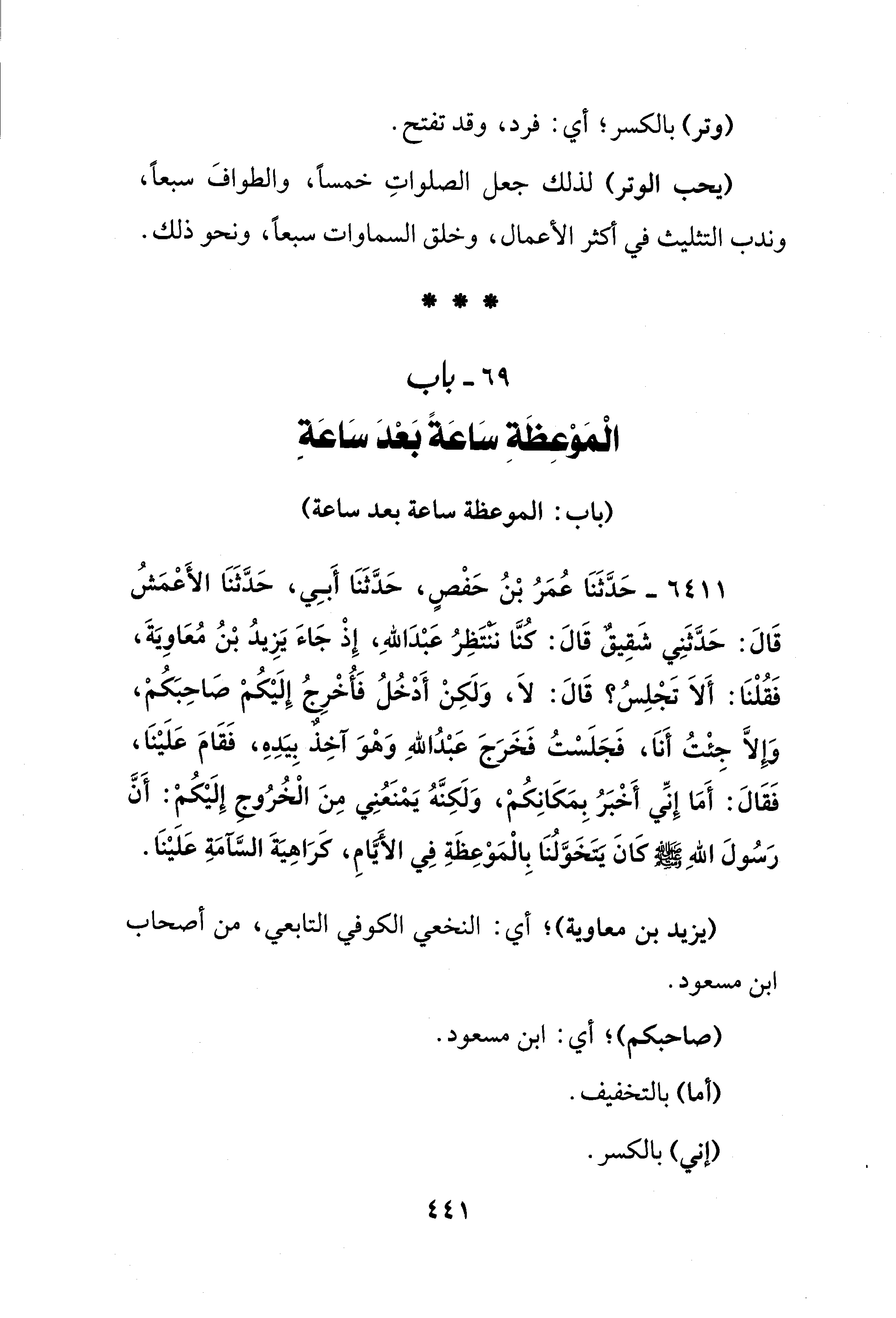 6411 - حَدَّثَنَا عُمَرُ بْنُ حَفْصٍ، حَدَّثَنَا أَبِي، حَدَّثَنَا الأَعْمَشُ قَالَ: حَدَّثَنِي شَقِيقٌ قَالَ: كُنَّا نَنْتَظِرُ عَبْدَ اللهِ، إِذْ جَاءَ يَزِيدُ بْنُ مُعَاوِيَةَ، فَقُلْنَا: أَلَا تَجْلِسُ؟ قَالَ: لَا، وَلَكِنْ أَدْخُلُ فَأُخْرِجُ إِلَيْكُمْ صَاحِبَكُمْ، وَإِلَّا جِئْتُ أَنَا، فَجَلَسْتُ فَخَرَجَ عَبْدُ اللهِ وَهْوَ آخِذٌ بِيَدِهِ، فَقَامَ عَلَيْنَا، فَقَالَ: أَمَا إِنِّي أَخْبَرُ بِمَكَانِكُمْ، وَلَكِنَّهُ يَمْنَعُنِي مِنَ الْخُرُوج إِلَيْكُمْ: أَنَّ رَسُولَ اللهِ - صلى الله عليه وسلم - كَانَ يَتَخَوَّلُنَا بِالْمَوْعِظَةِ فِي الأيَّامِ، كَرَاهِيَةَ السَّآمَةِ عَلَيْنَا.