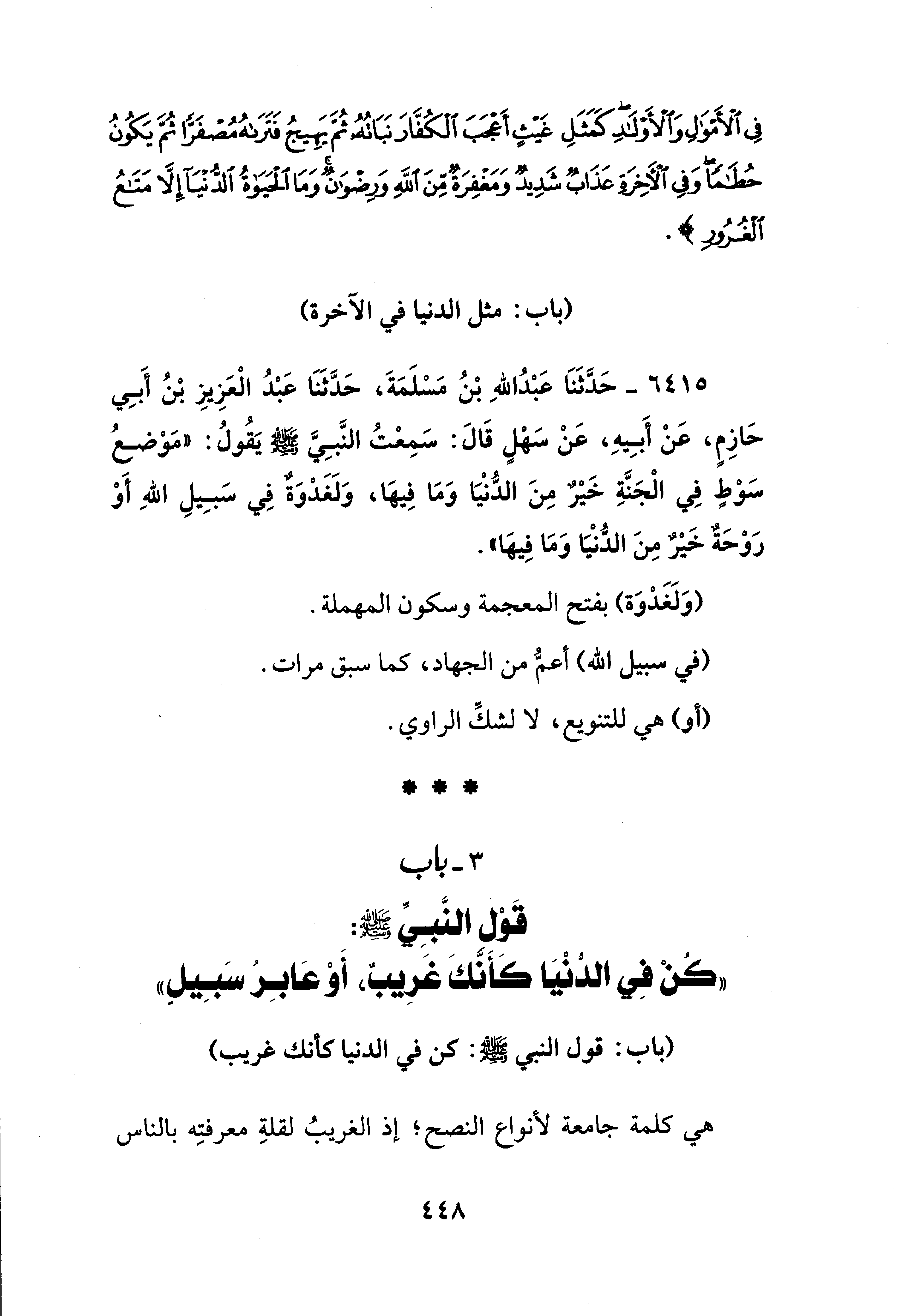 3 - باب قَوْل النَّبِيِّ - صلى الله عليه وسلم -: "كُنْ فِي الدُّنْيَا كَأَنَّكَ غَرِيِبٌ، أَوْ عَابِرُ سَبِيلٍ"