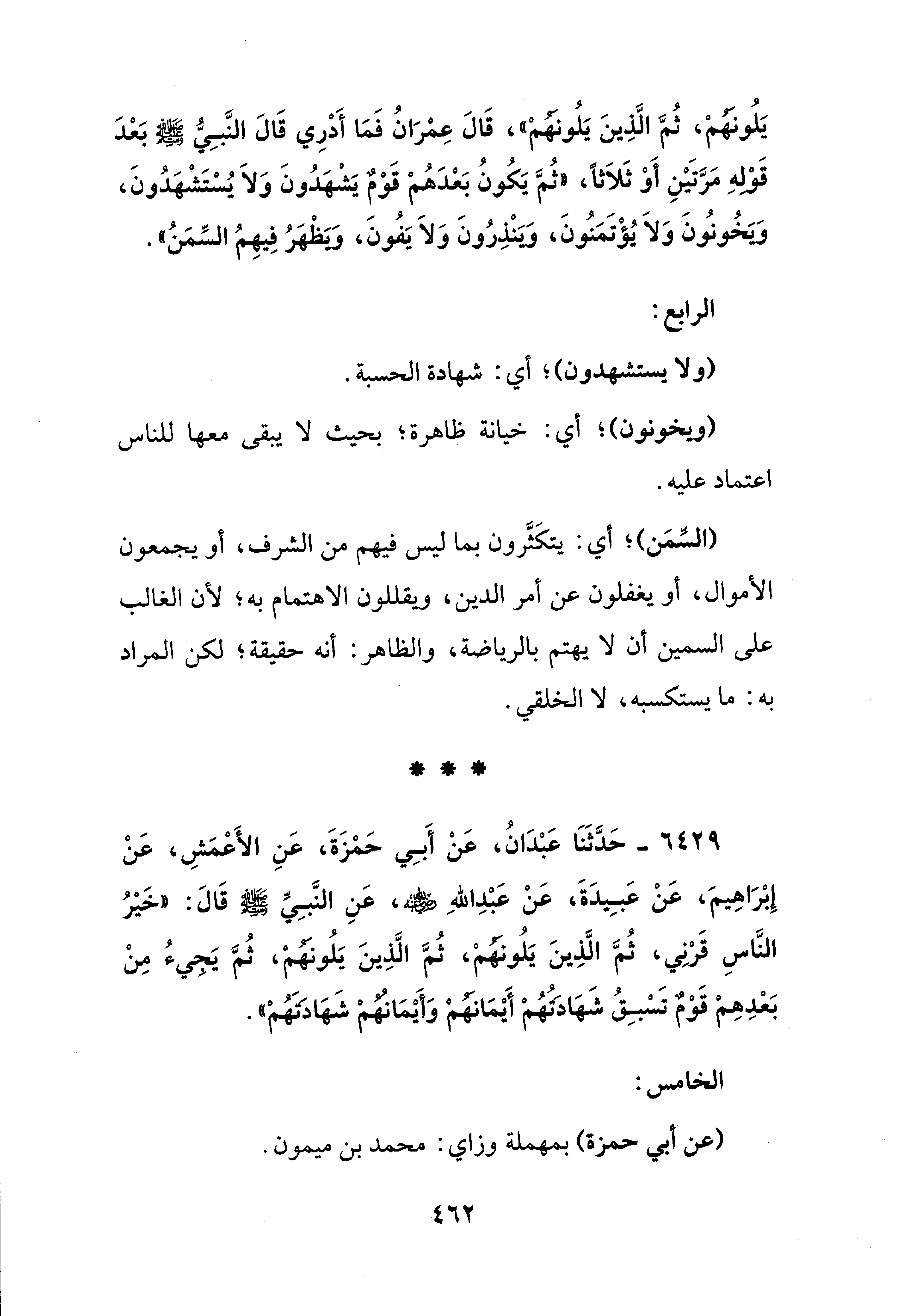 يَلُونَهُمْ، ثُمَّ الَّذِينَ يَلُونَهُمْ"، قَالَ عِمْرَانُ فَمَا أَدْرِي قَالَ النَّبِيُّ - صلى الله عليه وسلم - بَعْدَ قَوْلهِ مَرَّتَيْنِ أَوْ ثَلَاثًا، "ثُمَّ يَكُونُ بَعْدَهُمْ قَوْمٌ يَشْهَدُونَ وَلَا يُسْتَشْهَدُونَ، وَيَخُونُونَ وَلَا يُؤْتَمَنُونَ، وَيَنْذِرُونَ وَلَا يَفُونَ، وَيَظْهَرُ فِيهِمُ السِّمَنُ".