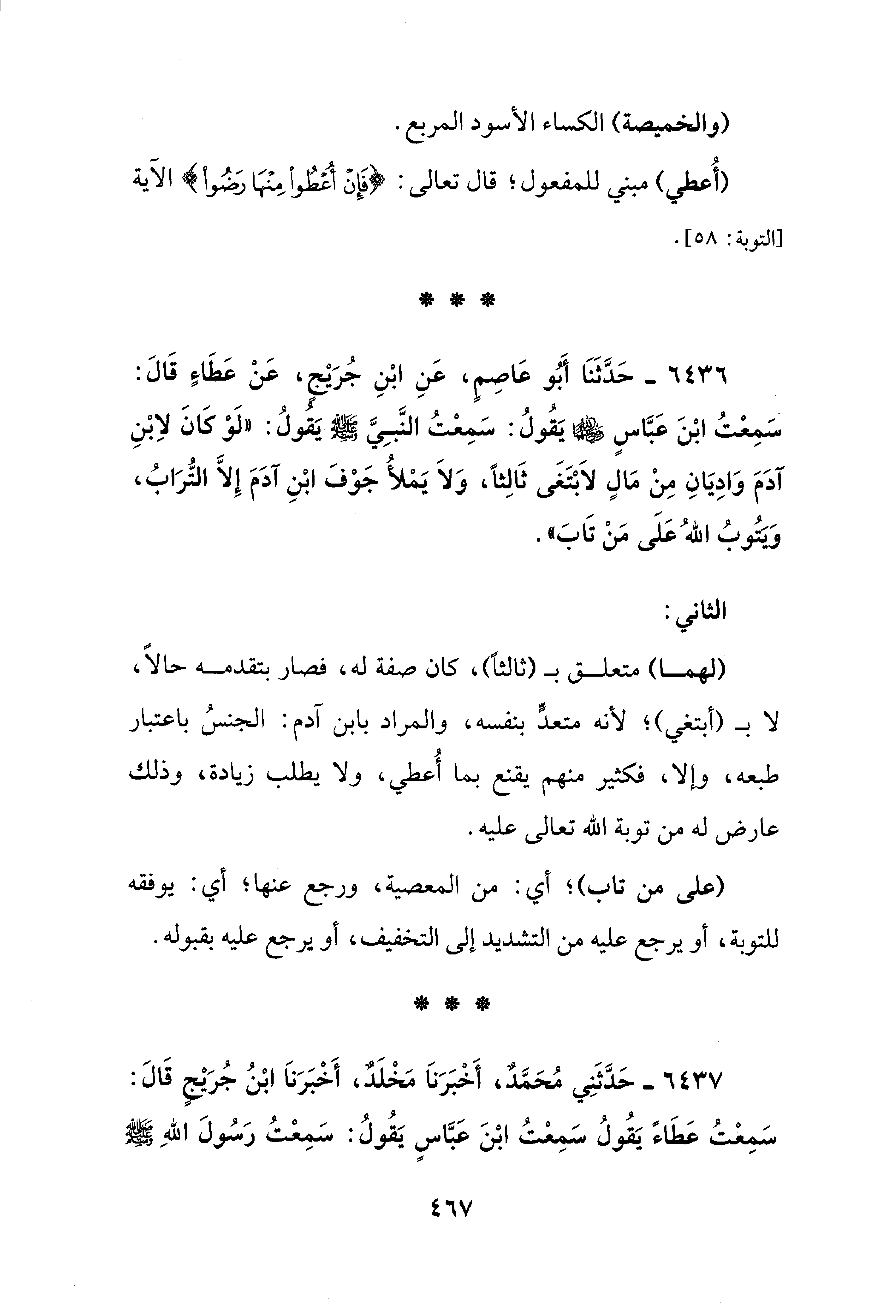 6436 - حَدَّثَنَا أَبُو عَاصِمٍ، عَنِ ابْنِ جُرَيْجٍ، عَنْ عَطَاءِ قَالَ: سَمِعْتُ ابْنَ عَبَّاسٍ - رضي الله عنهما - يَقُولُ: سَمِعْتُ النَّبِيَّ - صلى الله عليه وسلم - يَقولُ: "لَوْ كَانَ لاِبْنِ آدَمَ وَادِيَانِ مِنْ مَالٍ لَابْتَغَى ثَالِثًا، وَلَا يَمْلأُ جَوْفَ ابْنِ آدَمَ إلا التُّرَابُ، وَيتُوبُ اللهُ عَلَى مَنْ تَابَ".