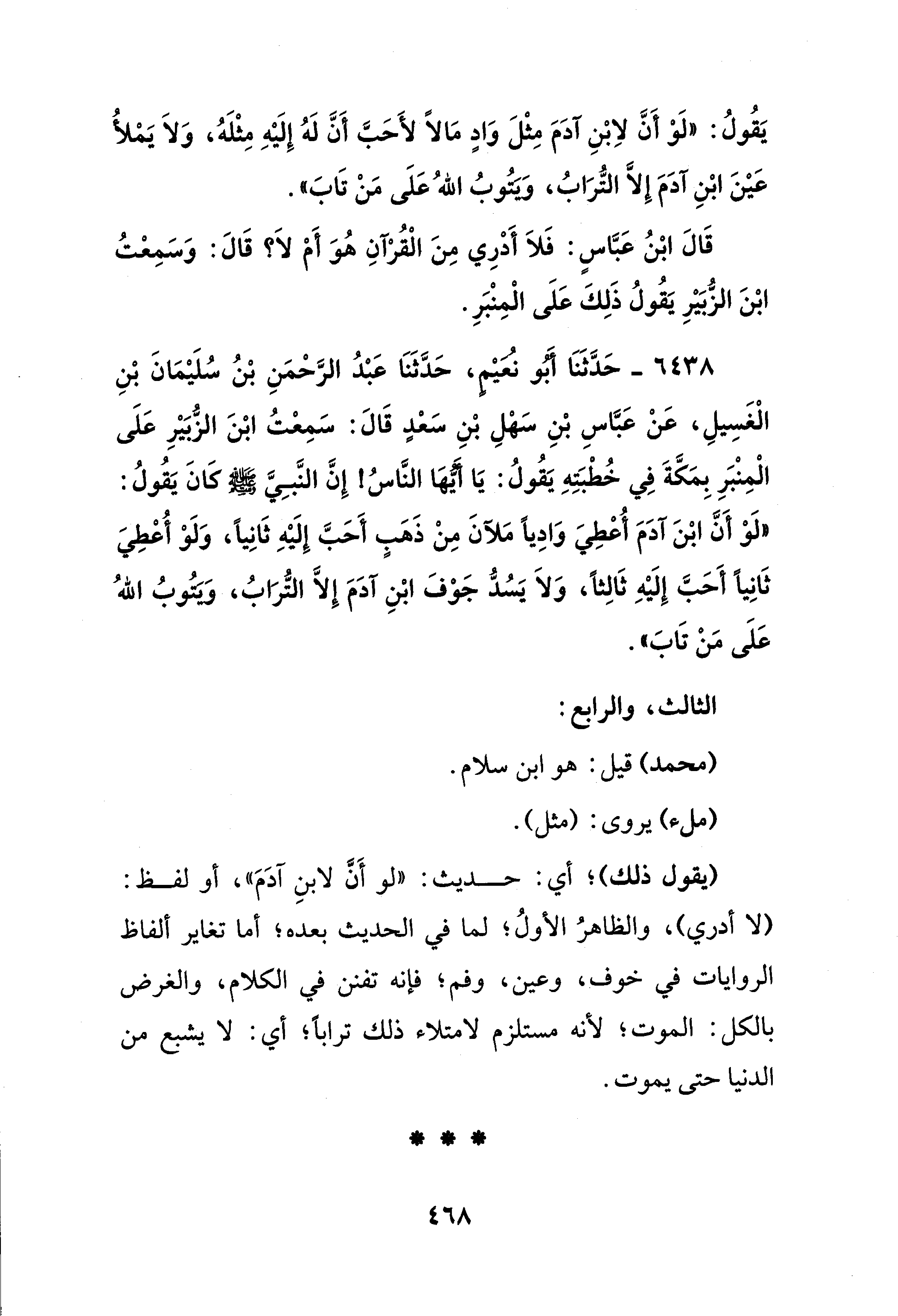 6438 - حَدَّثَنَا أَبُو نُعَيْمٍ، حَدَّثَنَا عَبْدُ الرَّحْمَنِ بْنُ سُلَيْمَانَ بْنِ الْغَسِيلِ، عَنْ عَبَّاسِ بْنِ سَهْلِ بْنِ سَعْدٍ قَالَ: سَمِعْتُ ابْنَ الزُّبَيْرِ عَلَى الْمِنْبَرِ بِمَكَّةَ فِي خُطْبَتِهِ يَقُولُ: يَا أَيُّهَا النَّاسُ! إِنَّ النَّبِيِّ - صلى الله عليه وسلم - كَانَ يَقُولُ: "لَوْ أَنَّ ابْنَ آدَمَ أُعْطِيَ وَادِيًا مَلَآنَ مِنْ ذَهَبٍ أَحَبَّ إِلَيْهِ ثَانِيًا، وَلَوْ أُعْطِيَ ثَانِيًا أَحَبَّ إِلَيْهِ ثَالِثًا، وَلَا يَسُدُّ جَوْفَ ابْنِ آدَمَ إلا التُّرَابُ، وَيَتُوبُ اللهُ عَلَى مَنْ تَابَ".