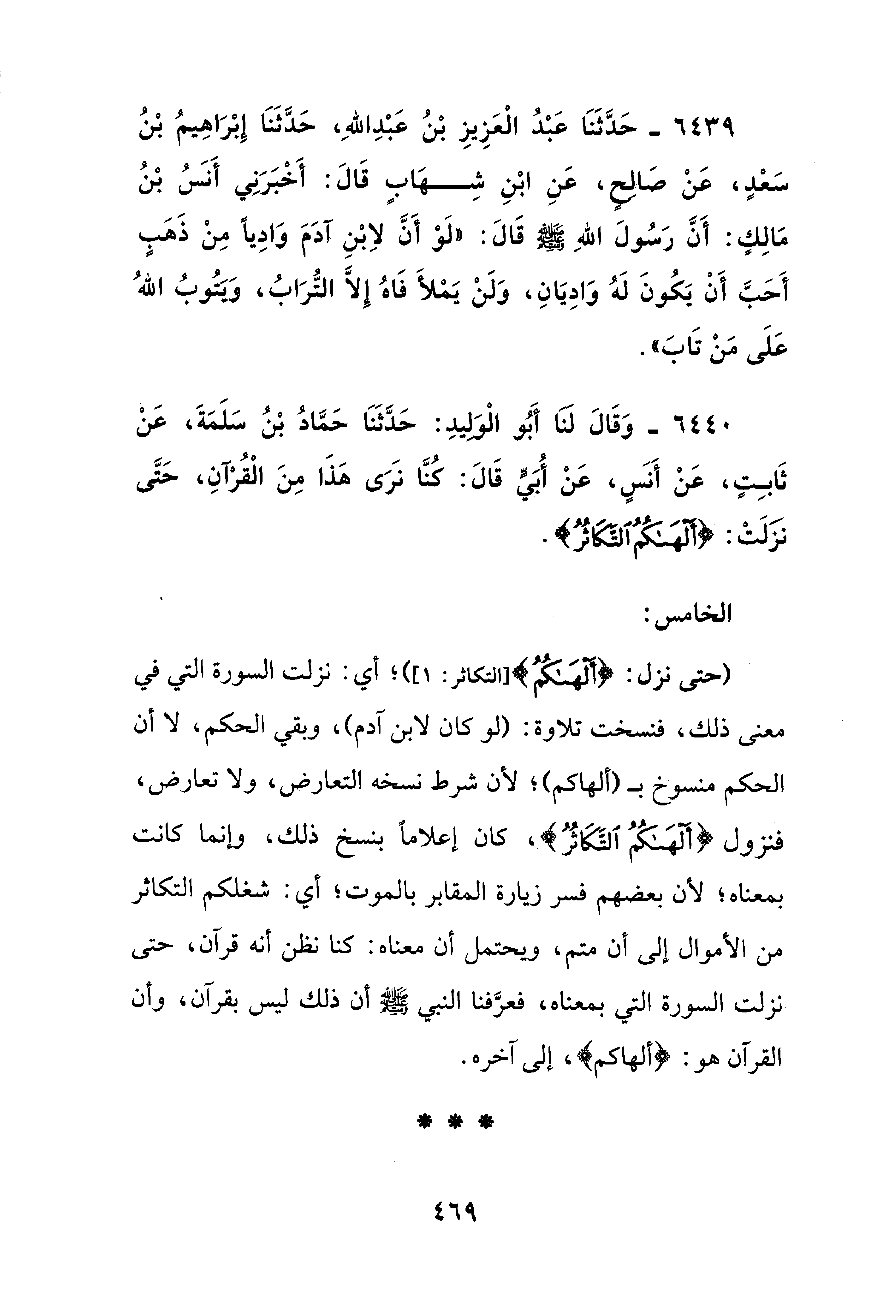 6440 - وَقَالَ لَنَا أَبُو الْوَلِيدِ: حَدَّثَنَا حَمَّادُ بْنُ سَلَمَةَ، عَنْ ثَابِتٍ، عَنْ أَنسٍ، عَنْ أُبَيٍّ قَالَ: كُنَّا نَرَى هَذَا مِنَ الْقُرْآنِ، حَتَّى نزَلَتْ: {أَلْهَاكُمُ التَّكَاثُرُ}.