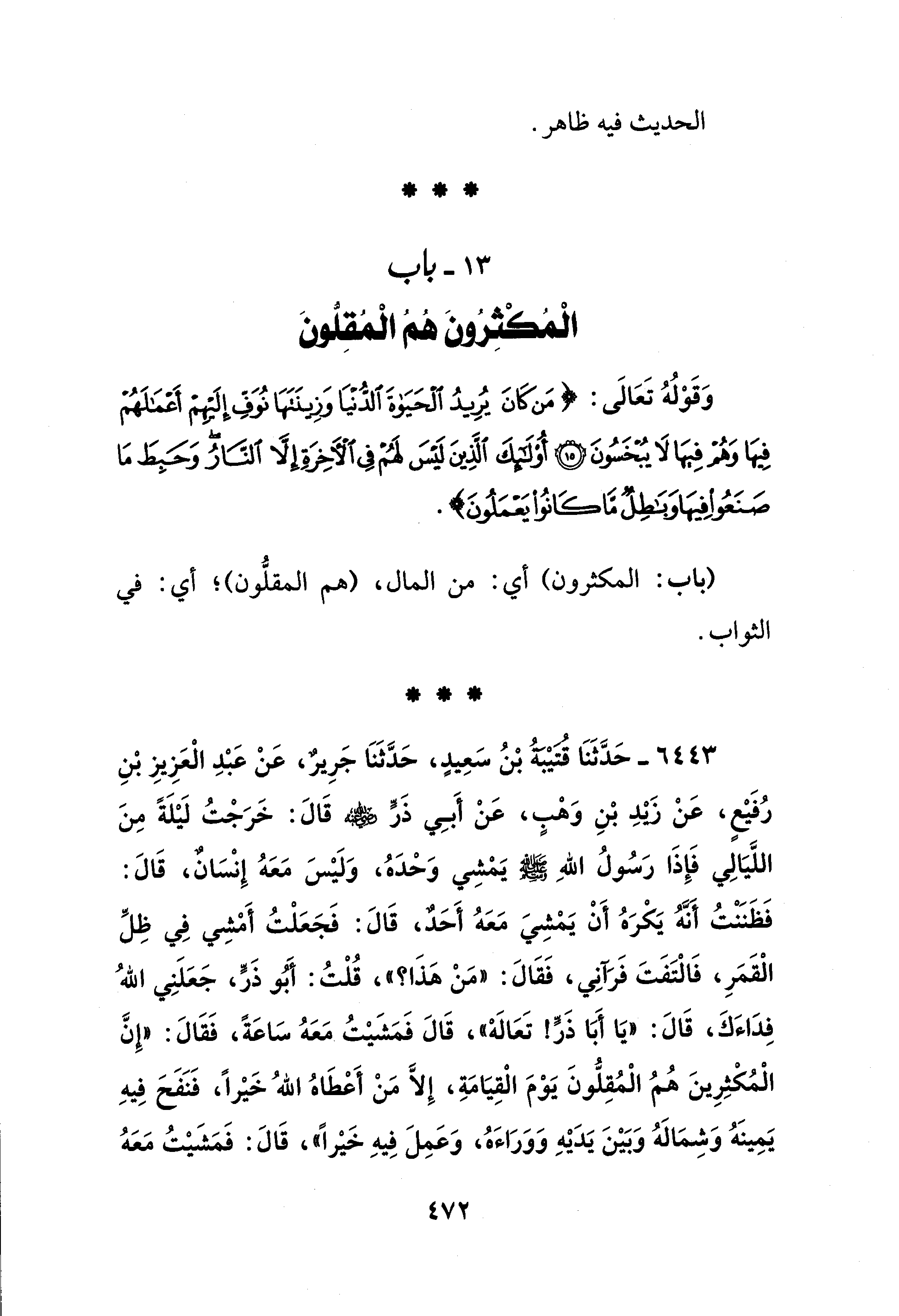 6443 - حَدَّثَنَا قُتَيْبَةُ بْنُ سَعِيدٍ، حَدَّثَنَا جَرِيرٌ، عَنْ عَبْدِ الْعَزِيزِ بْنِ رُفَيع، عَنْ زيدِ بْنِ وَهْبٍ، عَنْ أَبِي ذَرٍّ - رضي الله عنه - قَالَ: خَرَجْتُ لَيْلَةً مِنَ اللَّيَالِي فَإِذَا رَسُولُ اللهِ - صلى الله عليه وسلم - يَمْشِي وَحْدَهُ، وَلَيْسَ مَعَهُ إِنْسَانٌ، قَالَ: فَظَنَنْتُ أَنَّهُ يَكْرَهُ أَنْ يَمْشِيَ مَعَهُ أَحَدٌ، قَالَ: فَجَعَلْتُ أَمْشِي فِي ظِلِّ الْقَمَرِ، فَالْتَفَتَ فَرَآنِي، فَقَالَ: "مَنْ هَذَا؟ "، قُلْتُ: أَبُو ذَرٍّ، جَعَلَنِي اللهُ فِدَاءَكَ، قَالَ: "يَا أَبَا ذَرٍّ! تَعَالَهْ"، قَالَ فَمَشَيْتُ مَعَهُ سَاعَةً، فَقَالَ: "إِنَّ الْمُكْثِرِينَ هُمُ الْمُقِلُّونَ يَوْمَ الْقِيَامَةِ، إلا مَنْ أَعْطَاهُ اللهُ خَيْرًا، فَنَفَحَ فِيهِ يَمِينَهُ وَشِمَالَهُ وَبَيْنَ يَدَيْهِ وَوَرَاءَهُ، وَعَمِلَ فِيهِ خَيْرًا"، قَالَ: فَمَشَيْتُ مَعَهُ