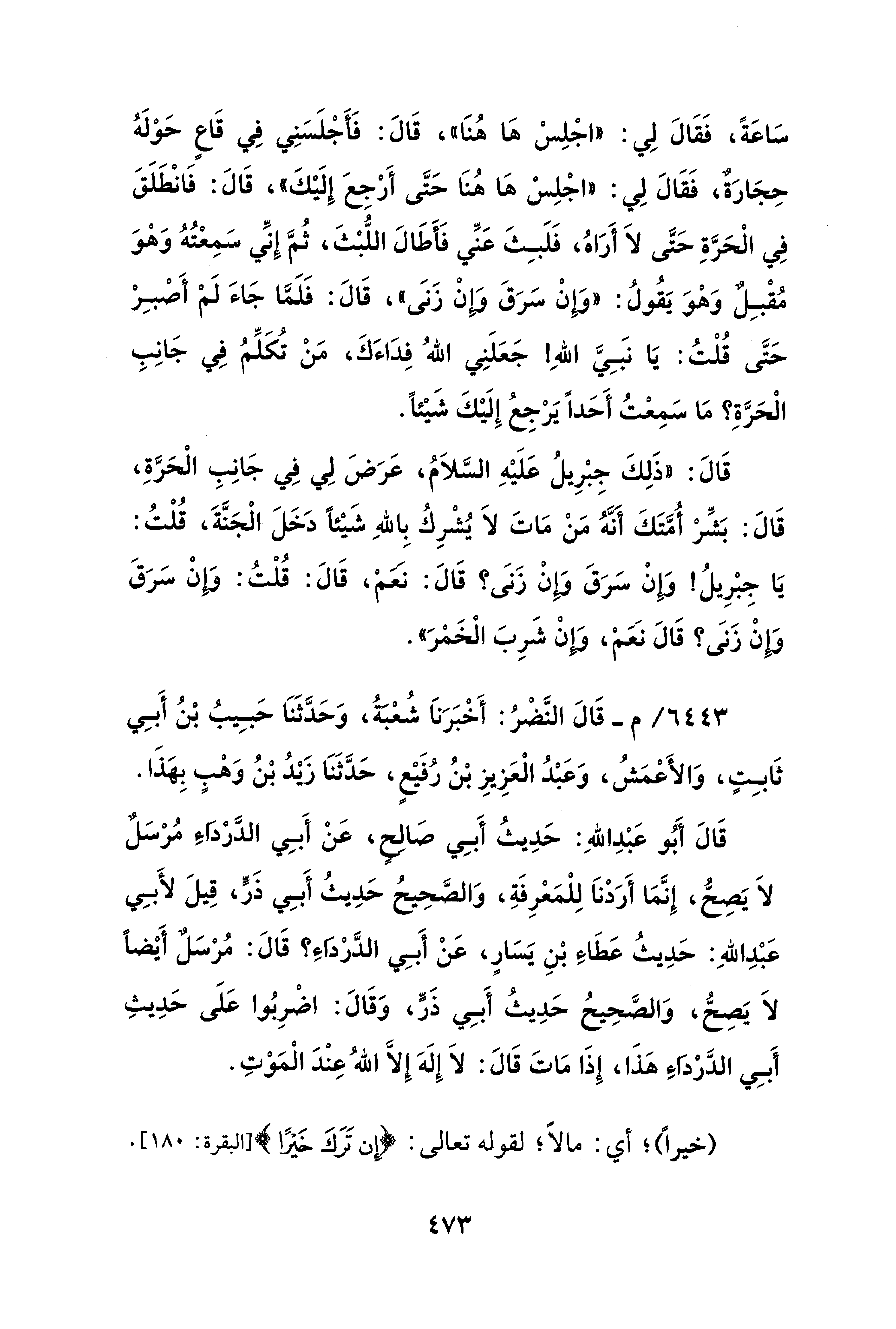 قَالَ: "ذَلِكَ جِبْرِيلُ عَلَيْهِ السَّلَامُ، عَرَضَ لِي فِي جَانِبِ الْحَرَّةِ، قَالَ: بَشِّرْ أُمَّتَكَ أَنَّهُ مَنْ مَاتَ لَا يُشْرِكُ بِاللهِ شَيْئًا دَخَلَ الْجَنَّةَ، قُلْتُ: يَا جِبْرِيلُ! وَإِنْ سَرَقَ وَإِنْ زَنىَ؟ قَالَ: نعمْ، قَالَ: قُلْتُ: وَإِنْ سَرَقَ وَإِنْ زَنَى؟ قَالَ نعمْ، وَإِنْ شَرِبَ الْخَمْرَ".