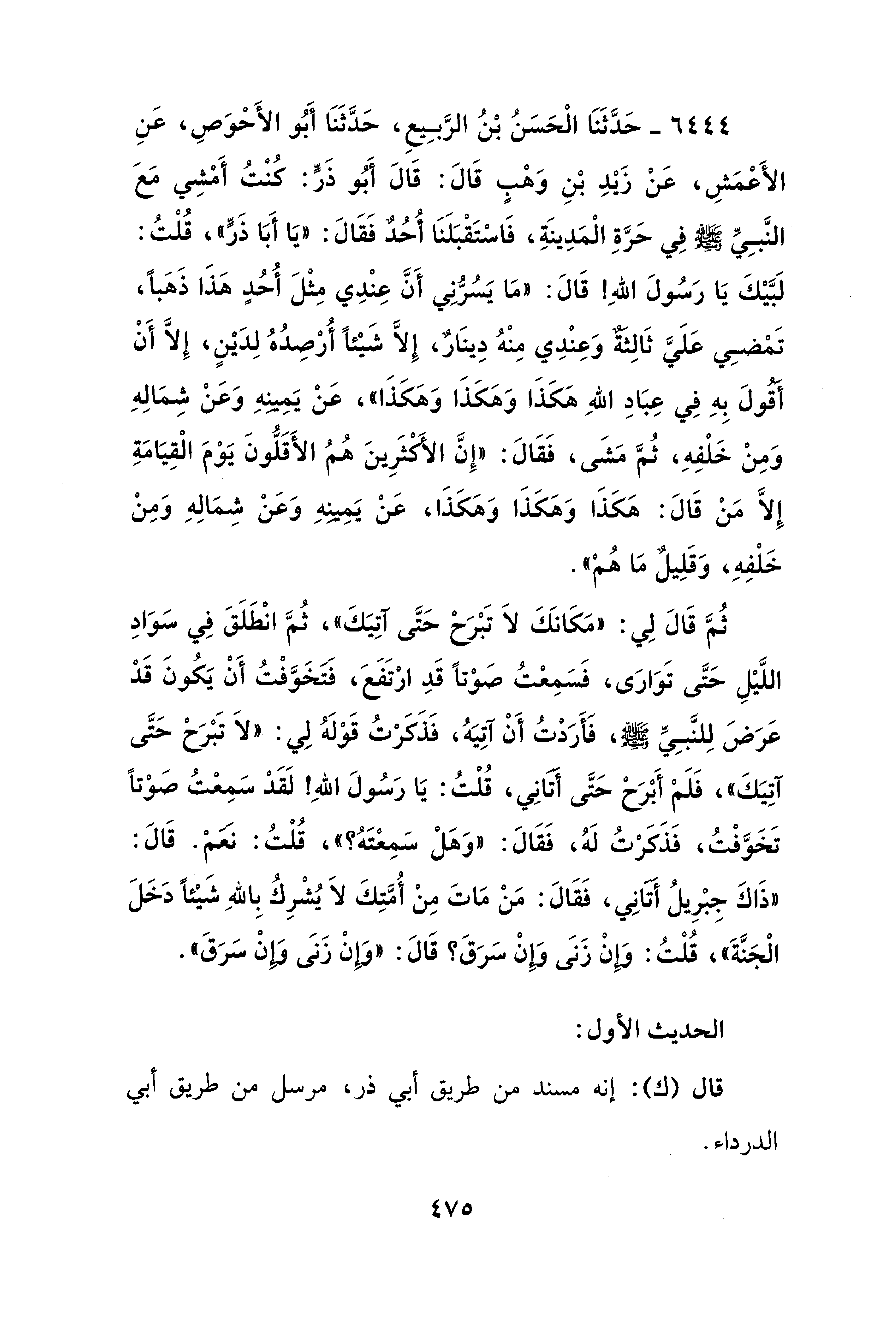 6444 - حَدَّثَنَا الْحَسَنُ بْنُ الرَّبِيعِ، حَدَّثَنَا أَبُو الأَحْوَصِ، عَنِ الأَعْمَشِ، عَنْ زَيْدِ بْنِ وَهْبٍ قَالَ: قَالَ أَبُو ذَرٍّ: كُنْتُ أَمْشِي مَعَ النَّبِيِّ - صلى الله عليه وسلم - فِي حَرَّةِ الْمَدِينَةِ، فَاسْتَقْبَلَنَا أُحُدٌ فَقَالَ: "يَا أَبَا ذَرٍّ"، قُلْتُ: لَبَّيْكَ يَا رَسُولَ اللهِ! قَالَ: "مَا يَسُرُّنِي أَنَّ عِنْدِي مِثْلَ أحُدٍ هَذَا ذَهَبًا، تَمْضِي عَلَيَّ ثَالِثَةٌ وَعِنْدِي مِنْهُ دِينَارٌ، إلا شَيْئًا أُرْصِدُهُ لِدَيْنٍ، إلا أَنْ أقولَ بِهِ فِي عِبَادِ اللهِ هَكَذَا وَهَكَذَا وَهَكَذَا"، عَنْ يَمِينِهِ وَعَنْ شِمَالِهِ وَمِنْ خَلْفِهِ، ثُمَّ مَشَى، فَقَالَ: "إِنَّ الأَكثَرِينَ هُمُ الأَقَلُّونَ يَوْمَ الْقِيَامَةِ إلا مَنْ قَالَ: هَكَذَا وَهَكَذَا وَهَكَذَا، عَنْ يَمِينِهِ وَعَنْ شِمَالِهِ وَمِنْ خَلْفِهِ، وَقَلِيلٌ مَا هُمْ".
