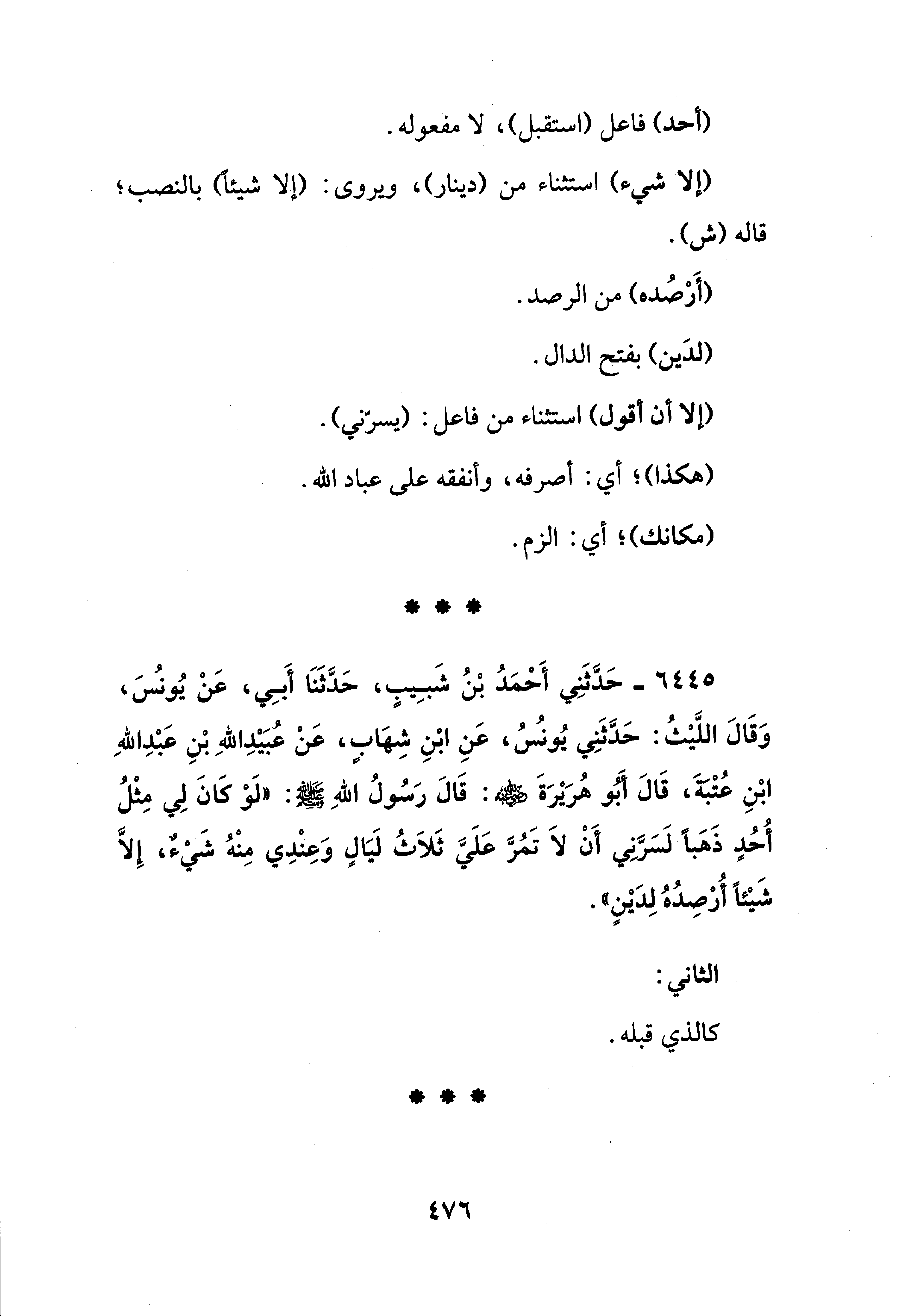 6445 - حَدَّثَنِي أَحْمَدُ بْنُ شَبِيبٍ، حَدَّثَنَا أَبِي، عَنْ يُونُسَ، وَقَالَ اللَّيْثُ: حَدَّثَنِي يُونس، عَنِ ابْنِ شِهَابٍ، عَنْ عُبَيْدِ اللهِ بْنِ عَبْدِ اللهِ بْنِ عُتْبَةَ، قَالَ أَبُو هُرَيْرَةَ - رضي الله عنه -: قَالَ رَسُولُ اللهِ - صلى الله عليه وسلم -: "لَوْ كَانَ لِي مِثْلُ أحُدٍ ذَهَبًا لَسَرَّني أَنْ لَا تَمُرَّ عَلَيَّ ثَلَاثُ لَيَالٍ وَعِنْدِي مِنْهُ شَيْءٌ، إلا شَيْئًا أُرْصِدُهُ لِدَيْنٍ".