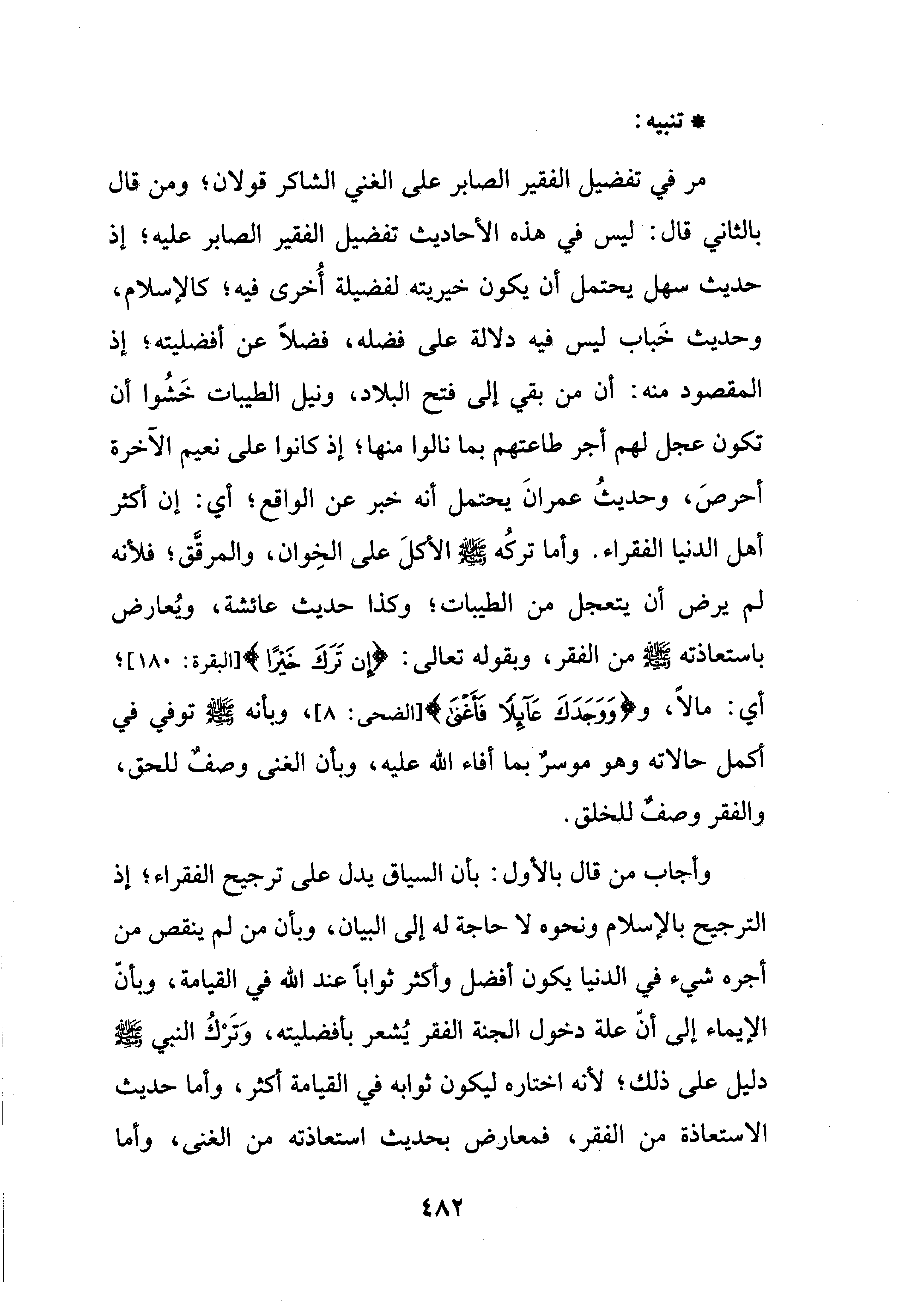 مر في تفضيل الفقير الصابر على الغني الشاكر قولان؛ ومن قال بالثّاني قال: ليس في هذه الأحاديث تفضيل الفقير الصابر عليه؛ إذ حديث سهل يحتمل أن يكون خيريته لفضيلة أُخرى فيه؛ كالإسلام، وحديث خَباب ليس فيه دلالة على فضله، فضلًا عن أفضليته؛ إذ المقصود منه: أن من بقي إلى فتح البلاد، ونيل الطَّيِّبات خَشُوا أن تكون عجل لهم أجر طاعتهم بما نالوا منها؛ إذ كانوا على نعيم الآخرَة أحرصَ، وحديثُ عمرانَ يحتمل أنه خبر عن الواقع؛ أي: إن أكثر أهل الدنيا الفقراء. وأمّا تركُه - صلى الله عليه وسلم - الأكلَ على الخِوان، والمرقَّق؛ فلأنه لم يرض أن يتعجل من الطَّيِّبات؛ وكذا حديث عائشة، ويُعارض باستعاذته - صلى الله عليه وسلم - من الفقر، وبقوله تعالى: {إِنْ تَرَكَ خَيْرًا} [البقرة: 180]؛ أي: مالًا، {وَوَجَدَكَ عَائِلًا فَأَغْنَى} [الضحى: 8]، وبأنه - صلى الله عليه وسلم - توفي في أكمل حالاته وهو موسرٌ بما أفاء الله عليه، وبأن الغنى وصفٌ للحق، والفقر وصفٌ للخلق.