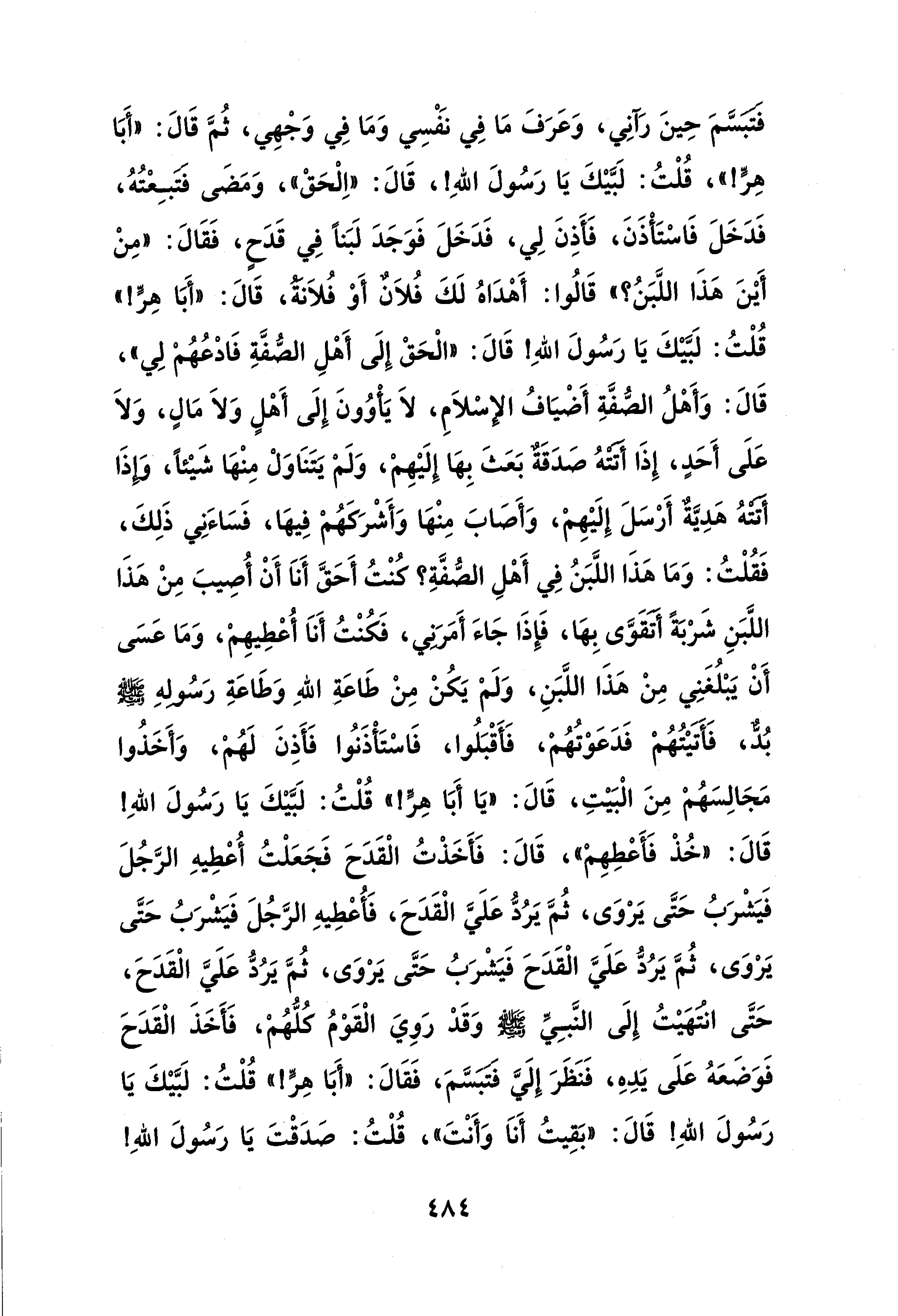فَتَبَسَّمَ حِينَ رَآنِي، وَعَرَفَ مَا فِي نفسِي وَمَا فِي وَجْهي، ثُمَّ قَالَ: "أَبَا هِرٍّ! "، قلْتُ: لَبَّيْكَ يَا رَسُولَ اللهِ!، قَالَ: "اِلْحَقْ"، وَمَضَى فَتَبِعْتُهُ، فَدَخَلَ فَاسْتَأْذَنَ، فَأَذِنَ لِي، فَدَخَلَ فَوَجَدَ لَبَنًا فِي قَدَحٍ، فَقَالَ: "مِنْ أَينَ هَذَا اللَّبَنُ؟ "، قَالُوا: أَهْدَاهُ لَكَ فُلَانٌ أَؤ فُلَانَةَ، قَالَ: "أَبَا هِرٍّ! "، قُلْتُ: لَبَّيْكَ يَا رَسُولَ اللهِ! قَالَ: "الْحَقْ إِلَى أَهْلِ الصُّفَّةِ فَادْعُهُمْ لِي"، قَالَ: وَأَهْلُ الصُّفَّةِ أَضْيَافُ الإِسْلَامِ، لَا يَأْوُونَ إِلَى أَهْلٍ وَلَا مَالٍ، وَلَا عَلَى أَحَدٍ، إِذَا أَتَتْهُ صَدَقَةٌ بَعَثَ بِهَا إِلَيْهِمْ، وَلَمْ يَتَنَاوَلْ مِنْهَا شَيْئًا، وَإِذَا أَتَتْهُ هَدِيَّةٌ أَرْسَلَ إِلَيْهِمْ، وَأَصَابَ مِنْهَا وَأَشْرَكَهُمْ فِيهَا، فَسَاءَنِي ذَلِكَ، فَقُلْتُ: وَمَا هَذَا اللَّبَنُ فِي أَهْلِ الصُّفَّةِ؟ كُنْتُ أَحَقَّ أَنَا أَنْ أُصِيبَ مِنْ هَذَا اللَّبَنِ شَرْبَةً أَتَقَوَّى بِهَا، فَإِذَا جَاءَ أَمَرَنِي، فَكُنْتُ أَنَا أُعْطِيهِمْ، وَمَا عَسَى أَنْ يَبْلُغَنِي مِنْ هَذَا اللَّبَنِ، وَلَمْ يَكُنْ مِنْ طَاعَةِ اللهِ وَطَاعَةِ رَسُولهِ - صلى الله عليه وسلم - بُدٌّ، فَأَتَيْتُهُمْ فَدَعَوْتُهُمْ، فَأَقْبَلُوا، فَاسْتَأْذَنُوا فَأَذِنَ لَهُمْ، وَأَخَذُوا مَجَالِسَهُمْ مِنَ الْبَيْتِ، قَالَ: "يَا أَبَا هِرٍّ! "، قُلْتُ: لَبَّيْكَ يَا رَسُولَ اللهِ - صلى الله عليه وسلم - قَالَ: "خُذْ فَأَعْطِهِمْ"، قَالَ: فَأَخَذْتُ الْقَدَحَ فَجَعَلْتُ أُعْطِيهِ الرَّجُلَ فَيَشْرَبُ حَتَّى يَرْوَى، ثُمَّ يَرُدُّ عَلَيَّ الْقَدَحَ، فَاُعْطِيهِ الرَّجُلَ فَيَشْرَبُ حَتَّى يَرْوَى، ثُمَّ يَرُدُّ عَلَيَّ الْقَدَحَ فَيَشْرَبُ حَتَّى يَرْوَى، ثُمَّ يَرُدُّ عَلَيَّ الْقَدَحَ، حَتَّى انْتَهَيْتُ إِلَى النَّبِيِّ - صلى الله عليه وسلم - وَقَدْ رَوِيَ الْقَوْمُ كلُّهُمْ، فَأَخَذَ الْقَدَحَ فَوَضَعَهُ عَلَى يَدِهِ، فَنَظَرَ إِلَيَّ فَتَبَسَّمَ، فَقَالَ: "أَبَا هِرٍّ! "، قُلْتُ: لَبَّيْكَ يَا رَسُولَ اللهِ! قَالَ: "بَقِيتُ أَنَا وَأَنْتَ"، قُلْتُ: صَدَقْتَ يَا رَسُولَ اللهِ!