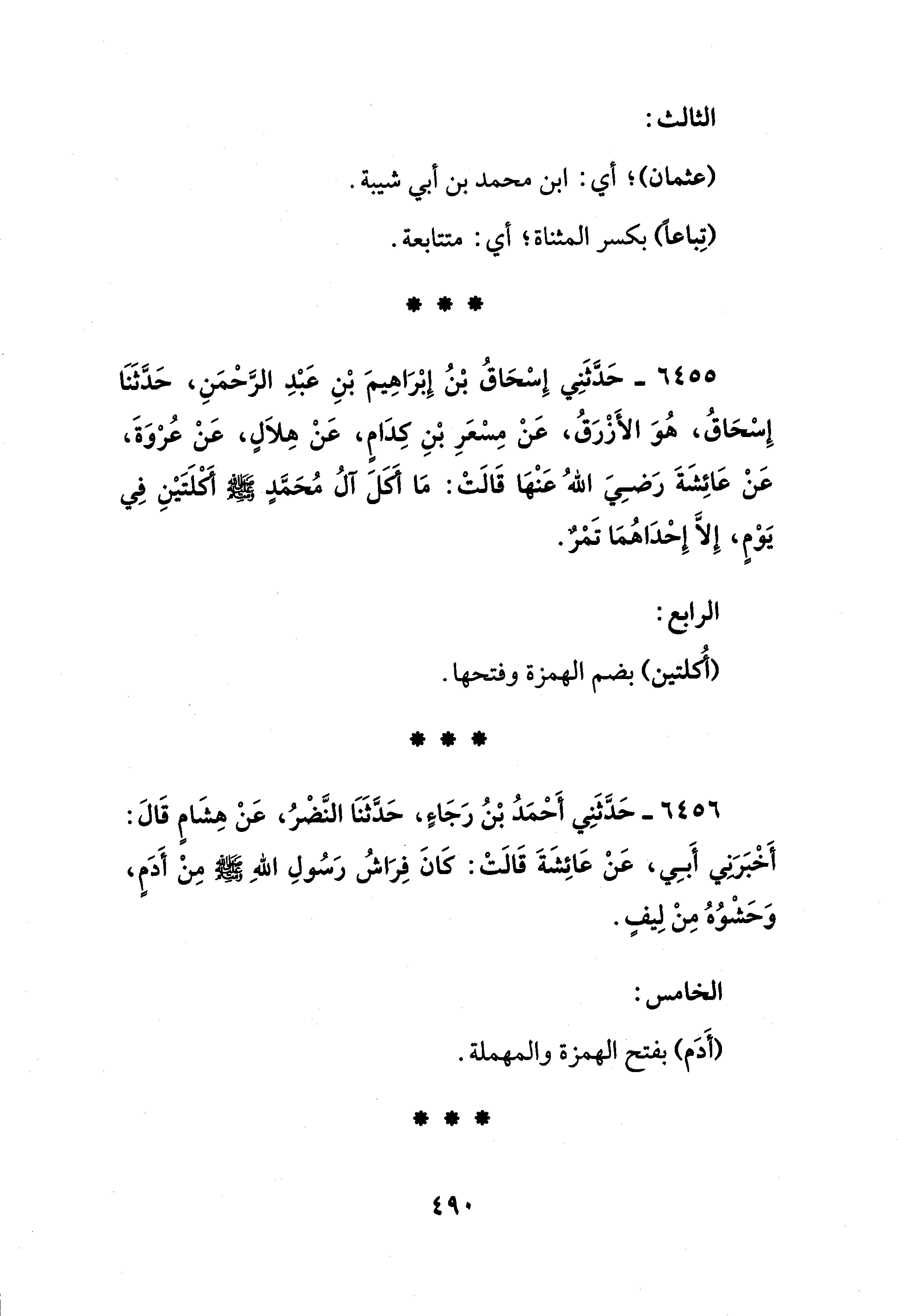 6455 - حَدَّثَنِي إِسْحَاقُ بْنُ إِبْرَاهِيمَ بْنِ عَبْدِ الرَّحْمَنِ، حَدَّثَنَا إِسْحَاقُ، هُوَ الأَزْرَقُ، عَنْ مِسْعَرِ بْنِ كِدَامٍ، عَنْ هِلَالٍ، عَنْ عُرْوَةَ، عَنْ عَائِشَةَ رَضِيَ اللهُ عَنْهَا قَالَتْ: مَا أَكَلَ آلُ مُحَمَّدٍ - صلى الله عليه وسلم - أَكْلَتَيْنِ فِي يَوْمٍ، إلا إِحْدَاهُمَا تَمْرٌ.