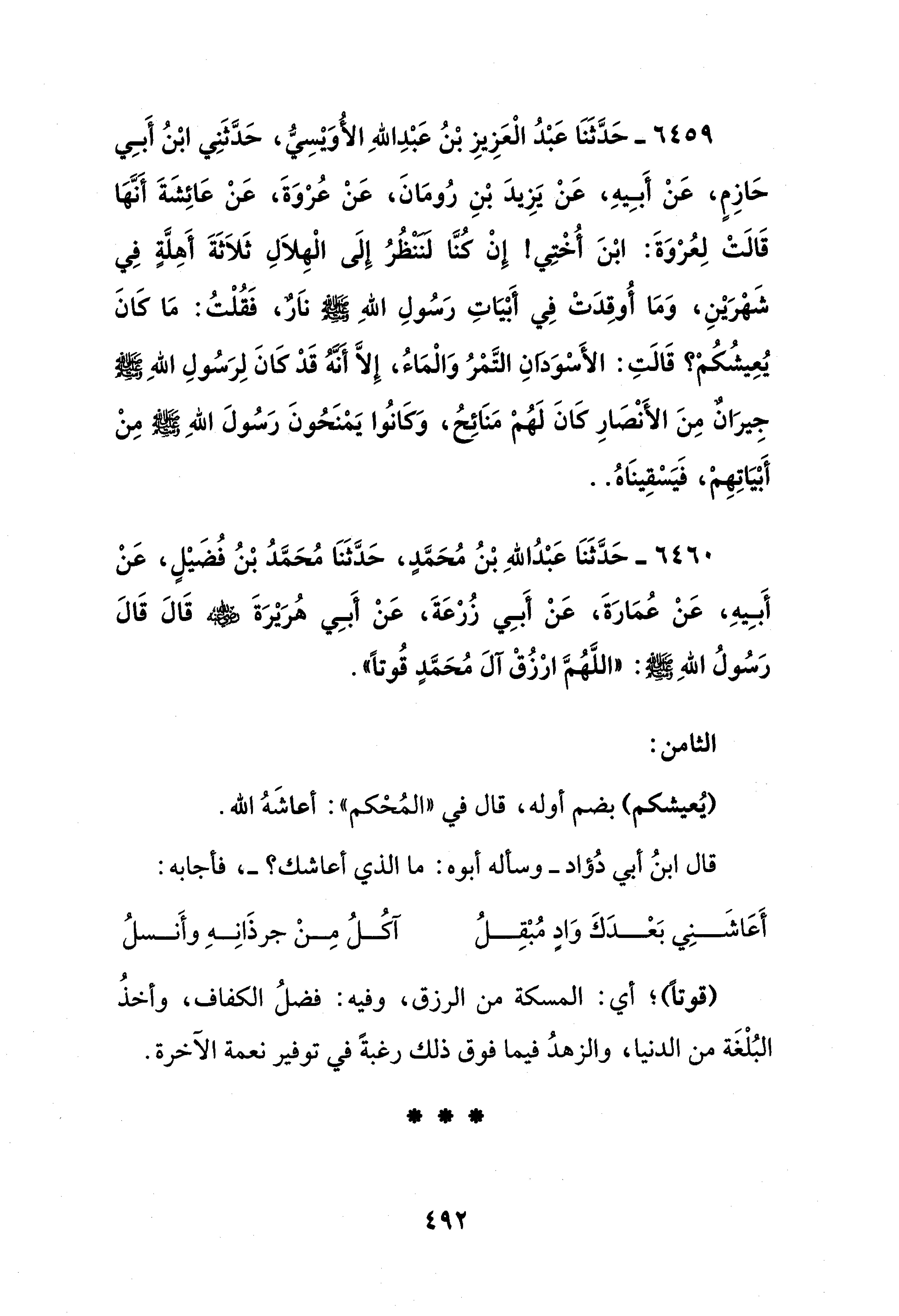 6460 - حَدَّثَنَا عَبْدُ اللهِ بْنُ مُحَمَّدٍ، حَدَّثَنَا مُحَمَّدُ بْنُ فُضَيْلٍ، عَنْ أَبِيهِ، عَنْ عُمَارَةَ، عَنْ أَبِي زُرْعَةَ، عَنْ أَبِي هُرَيْرَةَ - رضي الله عنه - قَالَ قَالَ رَسُولُ اللهِ - صلى الله عليه وسلم -: "اللَّهُمَّ ارْزُقْ آلَ مُحَمَّدٍ قُوتًا".