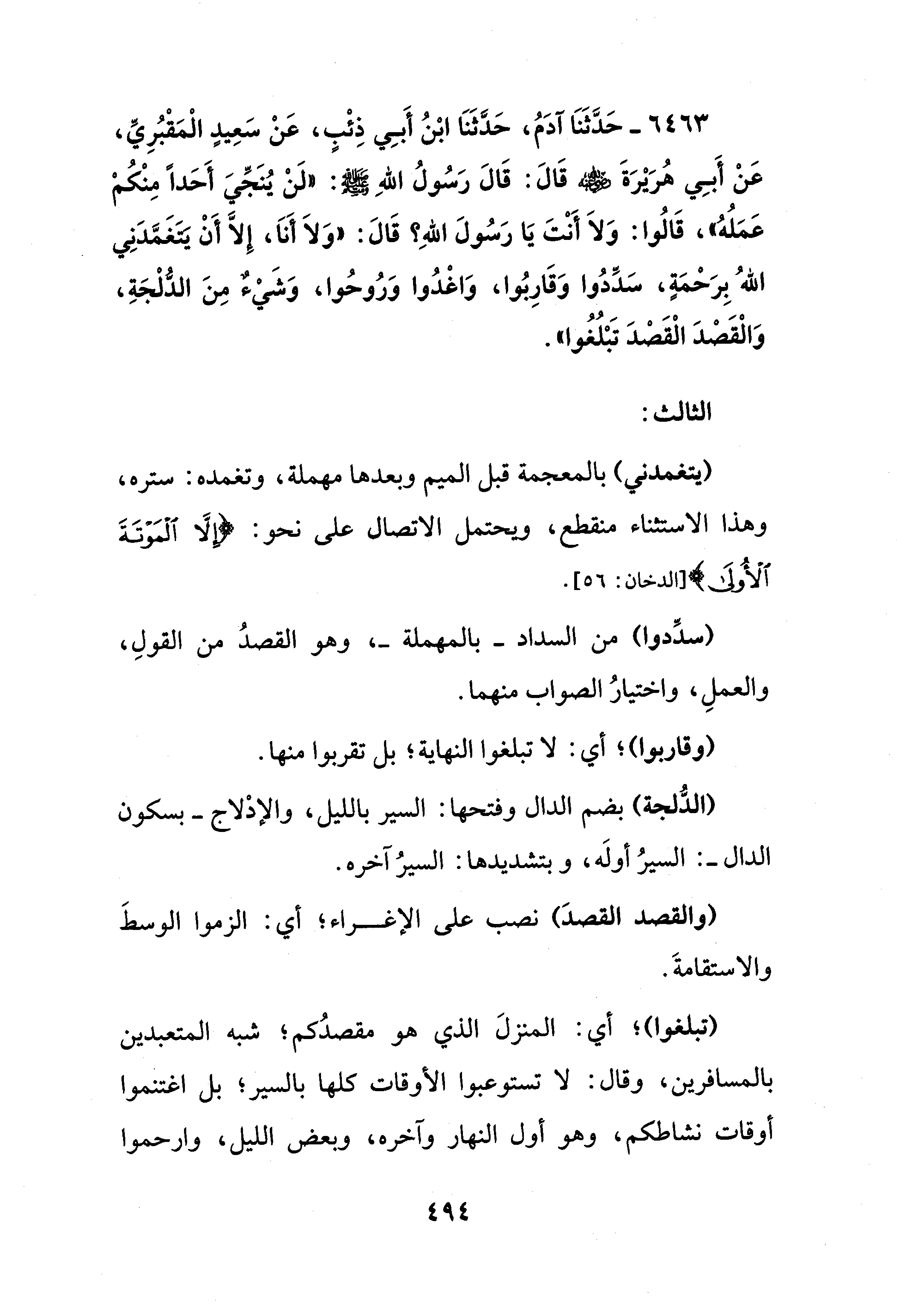 6463 - حَدَّثَنَا آدَمُ، حَدَّثَنَا ابْنُ أَبِي ذِئْبٍ، عَنْ سَعِيدٍ الْمَقْبُرِيِّ، عَنْ أَبِي هُرَيْرَةَ - رضي الله عنه - قَالَ: قَالَ رَسُولُ اللهِ - صلى الله عليه وسلم -: "لَنْ يُنَجِّيَ أَحَدًا مِنْكُمْ عَمَلُهُ"، قَالُوا: وَلَا أَنْتَ يَا رَسُولَ اللهِ؟ قَالَ: "وَلَا أَنَا، إلا أَنْ يَتَغَمَّدَنِي اللهُ بِرَحْمَةٍ، سَدِّدُوا وَقَارِبُوا، وَاغْدُوا وَرُوحُوا، وَشَيْءٌ مِنَ الدُّلْجَةِ، وَالْقَصْدَ الْقَصْدَ تَبْلُغُوا".