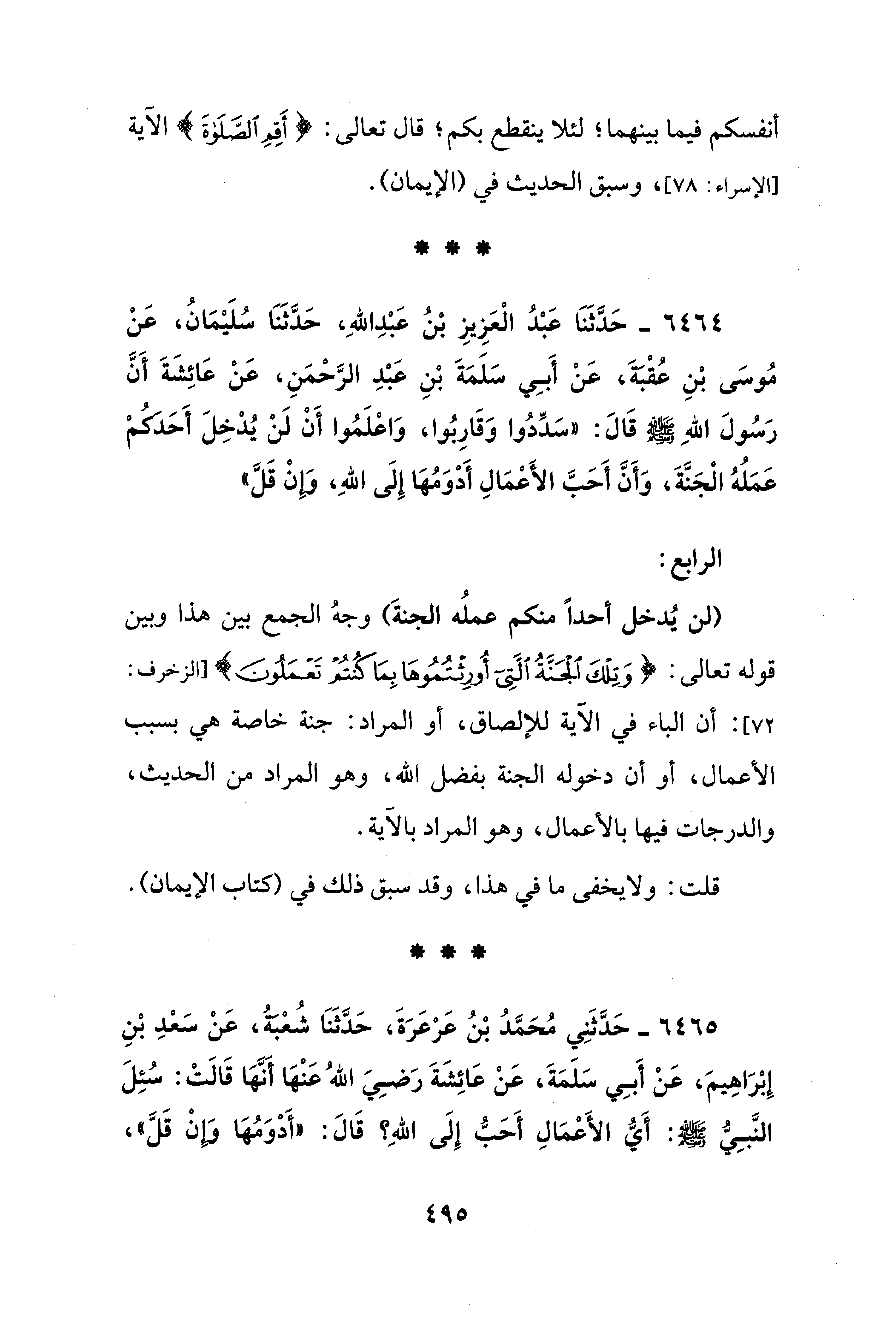 6464 - حَدَّثَنَا عَبْدُ الْعَزِيزِ بْنُ عَبْدِ اللهِ، حَدَّثَنَا سُلَيْمَانُ، عَنْ مُوسَى بْنِ عُقْبةَ، عَنْ أَبِي سَلَمَةَ بْنِ عَبْدِ الرَّحْمَنِ، عَنْ عَائِشَةَ أَنَّ رَسُولَ اللهِ - صلى الله عليه وسلم - قَالَ: "سَدِّدُوا وَقَارِبُوا، وَاعْلَمُوا أَنْ لَنْ يُدْخِلَ أَحَدَكُمْ عَمَلُهُ الْجَنَّةَ، وَأَنَّ أَحَبَّ الأَعْمَالِ أَدْوَمُهَا إِلَى اللهِ، وَإِنْ قَلَّ".