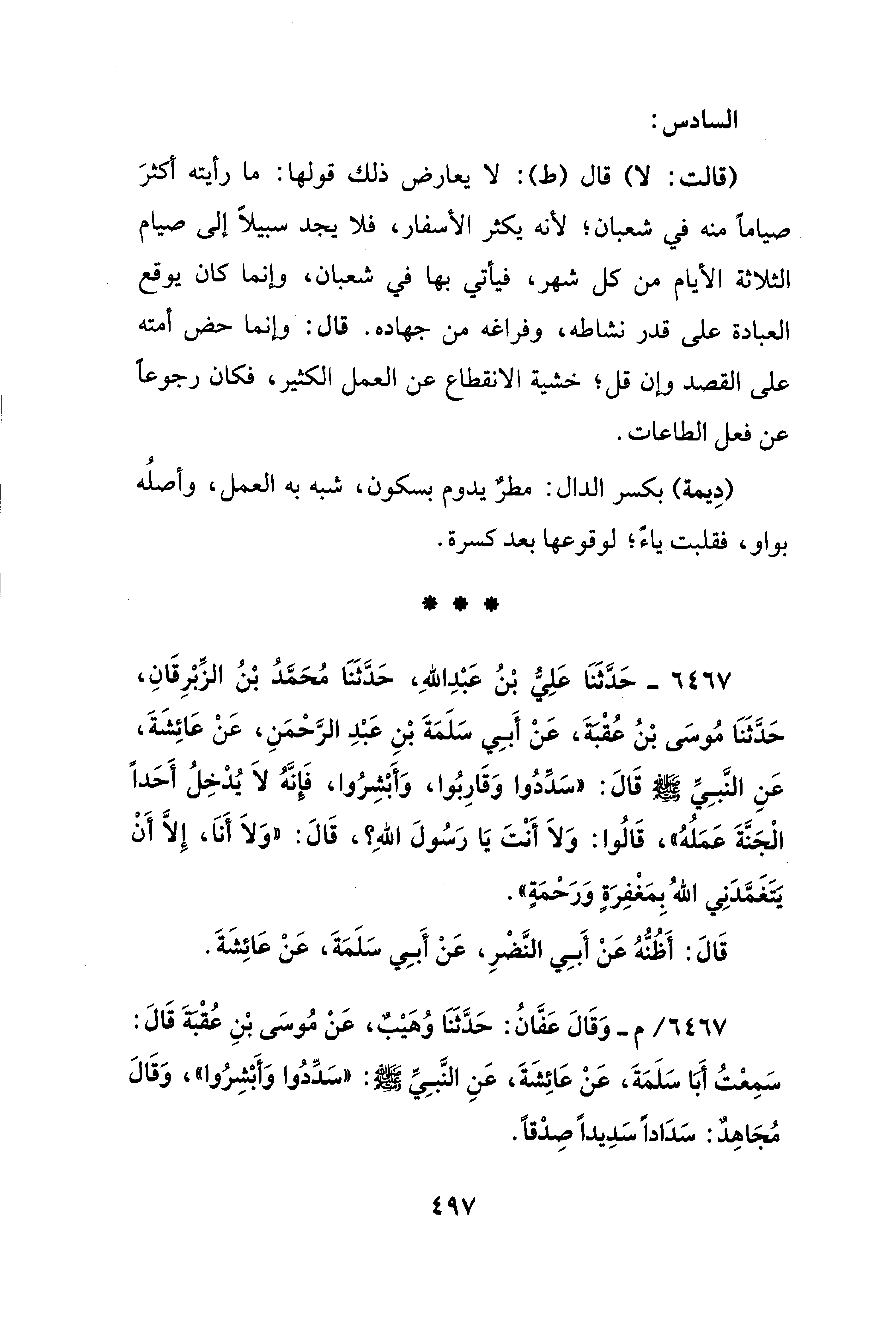 (قالت: لا) قال (ط): لا يعارض ذلك قولها: ما رأيته أكثرَ صيامًا منه في شعبان؛ لأنه يكثر الأسفار، فلا يجد سبيلًا إلى صيام الثّلاثة الأيَّام من كلّ شهر، فيأتي بها في شعبان، وإنّما كان يوقع العبادة على قدر نشاطه، وفراغه من جهاده. قال: وإنّما حض أمته على القصد وإن قل؛ خشية الانقطاع عن العمل الكثير، فكان رجوعًا عن فعل الطاعات.