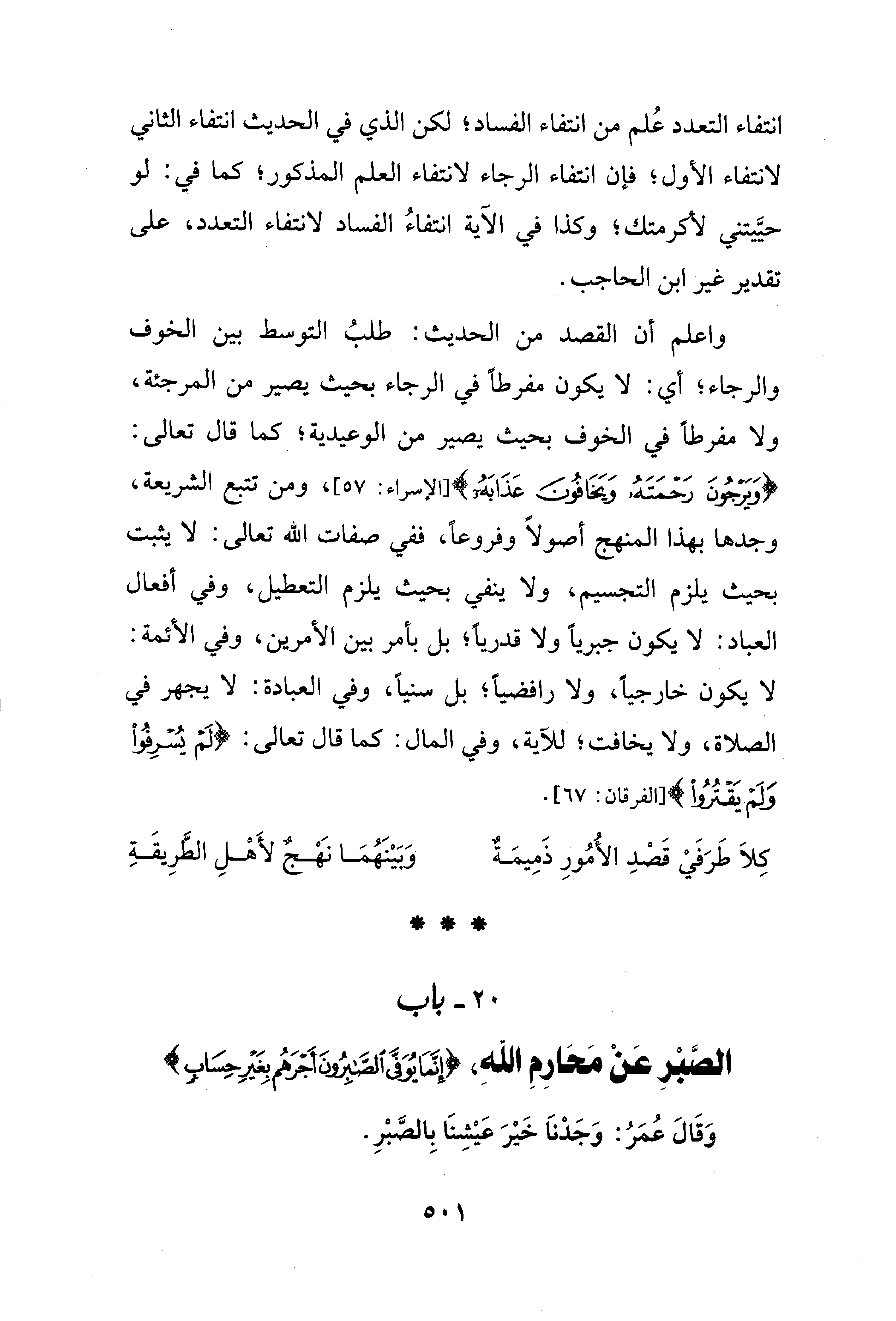 واعلم أن القصد من الحديث: طلبُ التوسط بين الخوف والرجاء؛ أي: لا يكون مفرطًا في الرجاء بحيث يصير من المرجئة، ولا مفرطًا في الخوف بحيث يصير من الوعيدية؛ كما قال تعالى: {وَيَرْجُونَ رَحْمَتَهُ وَيَخَافُونَ عَذَابَهُ} [الإسراء: 57]، ومن تتبع الشّريعة، وجدها بهذا المنهج أصولًا وفروعًا، ففي صفات الله تعالى: لا يثبت بحيث يلزم التجسيم، ولا ينفي بحيث يلزم التعطيل، وفي أفعال العباد: لا يكون جبريًّا ولا قدريًّا؛ بل بأمر بين الأمرين، وفي الأئمة: لا يكون خارجيًّا، ولا رافضيًّا؛ بل سنيًّا، وفي العبادة: لا يجهر في الصّلاة، ولا يخافت؛ للآية، وفي المال: كما قال تعالى: {لَمْ يُسْرِفُوا وَلَمْ يَقْتُرُوا} [الفرقان: 67].