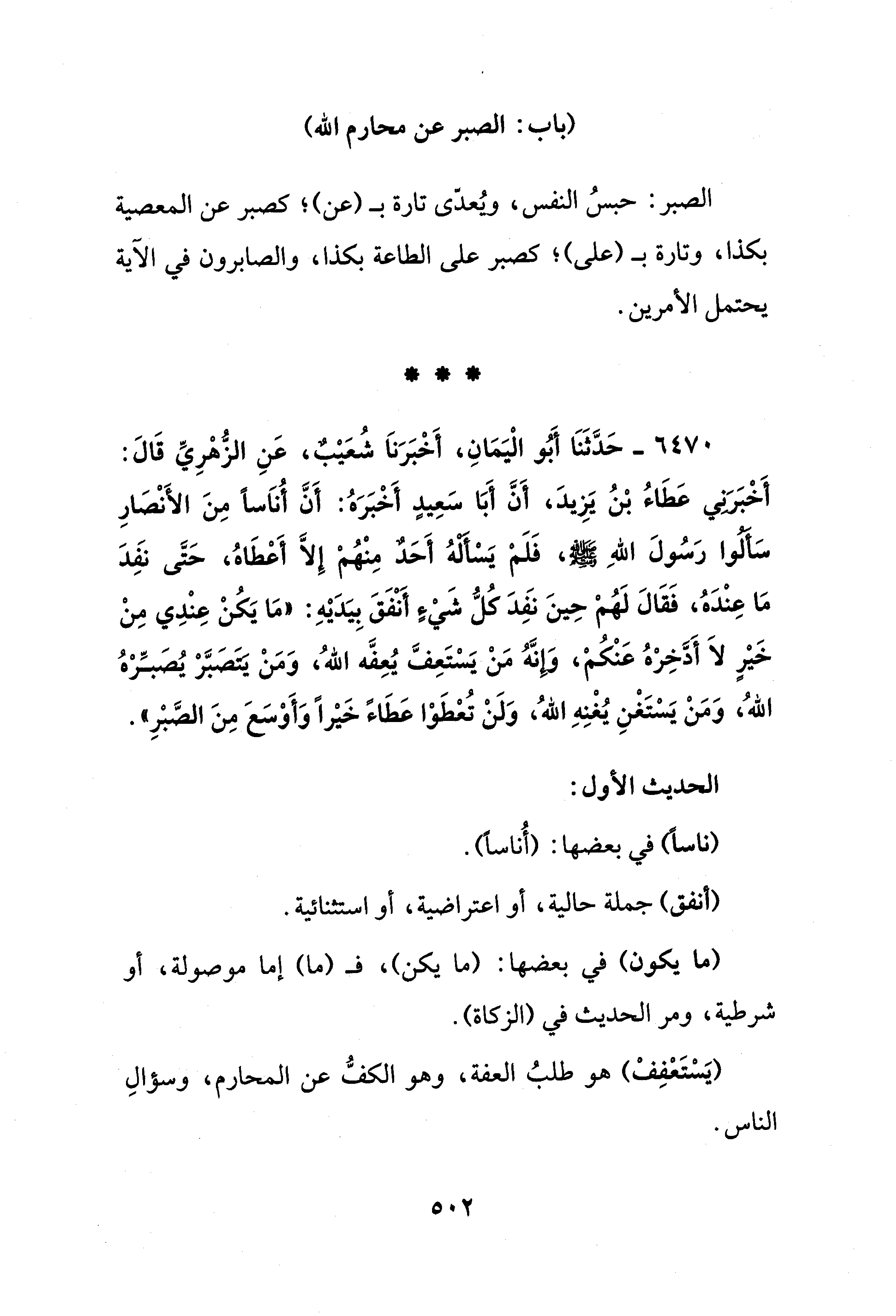6470 - حَدَّثَنَا أَبُو الْيَمَانِ، أَخْبَرَنَا شُعَيْبٌ، عَنِ الزُّهْرِيِّ قَالَ: أَخْبَرَنِي عَطَاءُ بْنُ يَزِيدَ، أَنَّ أَبَا سَعِيدٍ أَخْبَرَهُ: أَنَّ أُنَاسًا مِنَ الأَنْصَارِ سَأَلُوا رَسُولَ اللهِ - صلى الله عليه وسلم -، فَلَمْ يَسْأَلْهُ أَحَدٌ مِنْهُمْ إلا أَعْطَاهُ، حَتَّى نِفَدَ مَا عِنْدَهُ، فَقَالَ لَهُمْ حِينَ نَفِدَ كُلُّ شَيْءٍ أَنْفَقَ بِيَدَيْهِ: "مَا يَكُنْ عِنْدِي مِنْ خَيْرٍ لَا أَدَّخِرْهُ عَنْكُمْ، وَإِنَّهُ مَنْ يَسْتَعِفَّ يُعِفَّه اللهُ، وَمَنْ يَتَصَبَّرْ يُصَبِّرْهُ اللهُ، وَمَنْ يَسْتَغْنِ يُغْنِهِ اللهُ، وَلَنْ تُعْطَوْا عَطَاءً خَيْرًا وَأَوْسَعَ مِنَ الصَّبْرِ".