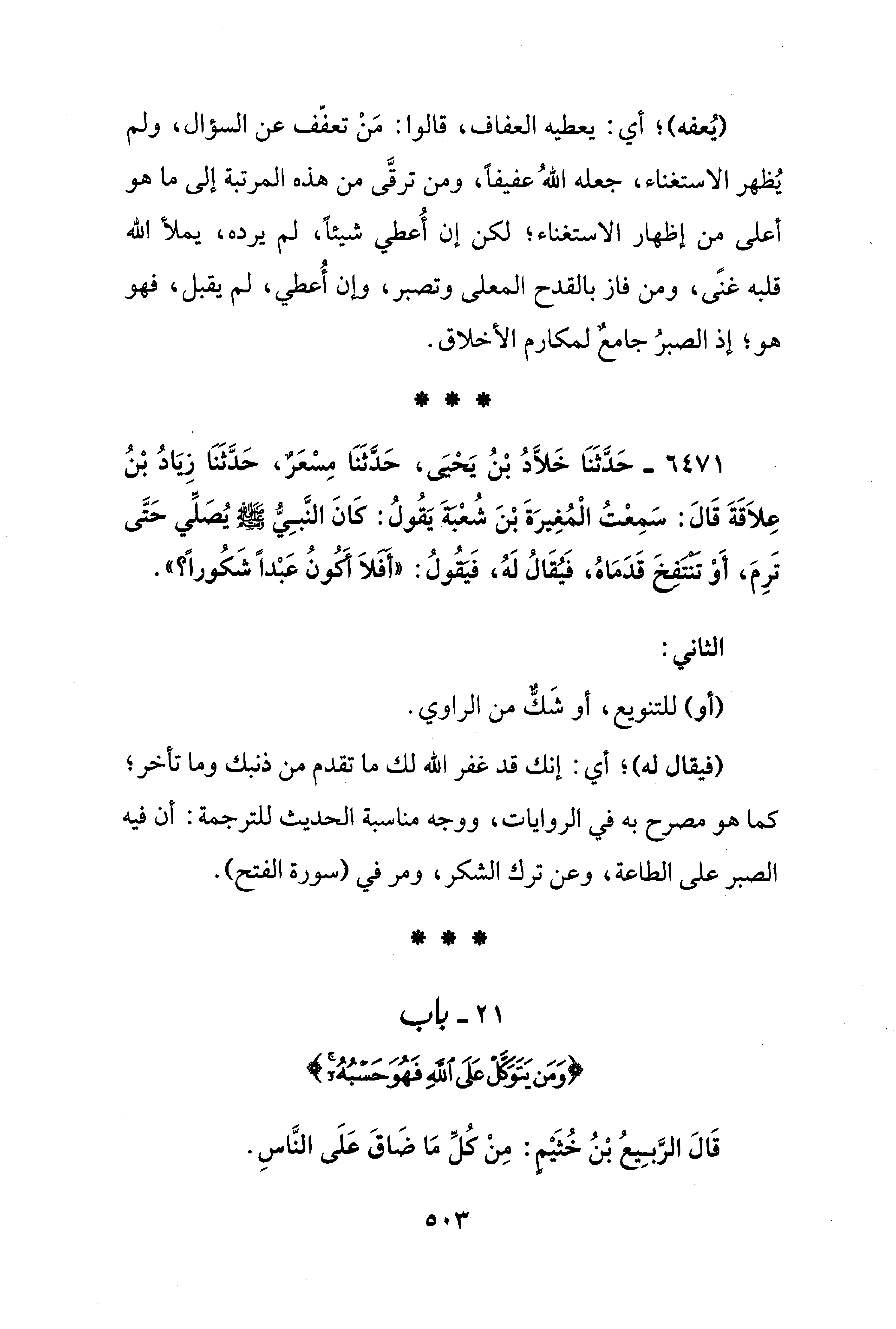 6471 - حَدَّثَنَا خَلَّادُ بْنُ يَحْيَى، حَدَّثَنَا مِسْعَرٌ، حَدَّثَنَا زِيَادُ بْنُ عِلَاقَةَ قَالَ: سَمِعْتُ الْمُغِيرَةَ بْنَ شُعْبَةَ يَقُولُ: كَانَ النَّبِيّ - صلى الله عليه وسلم - يُصَلِّي حَتَّى تَرِمَ، أَوْ تنتَفِخَ قَدَمَاهُ، فَيُقَالُ لَهُ، فَيَقُولُ: "أَفَلَا أَكُونُ عَبْدًا شَكُورًا؟ ".