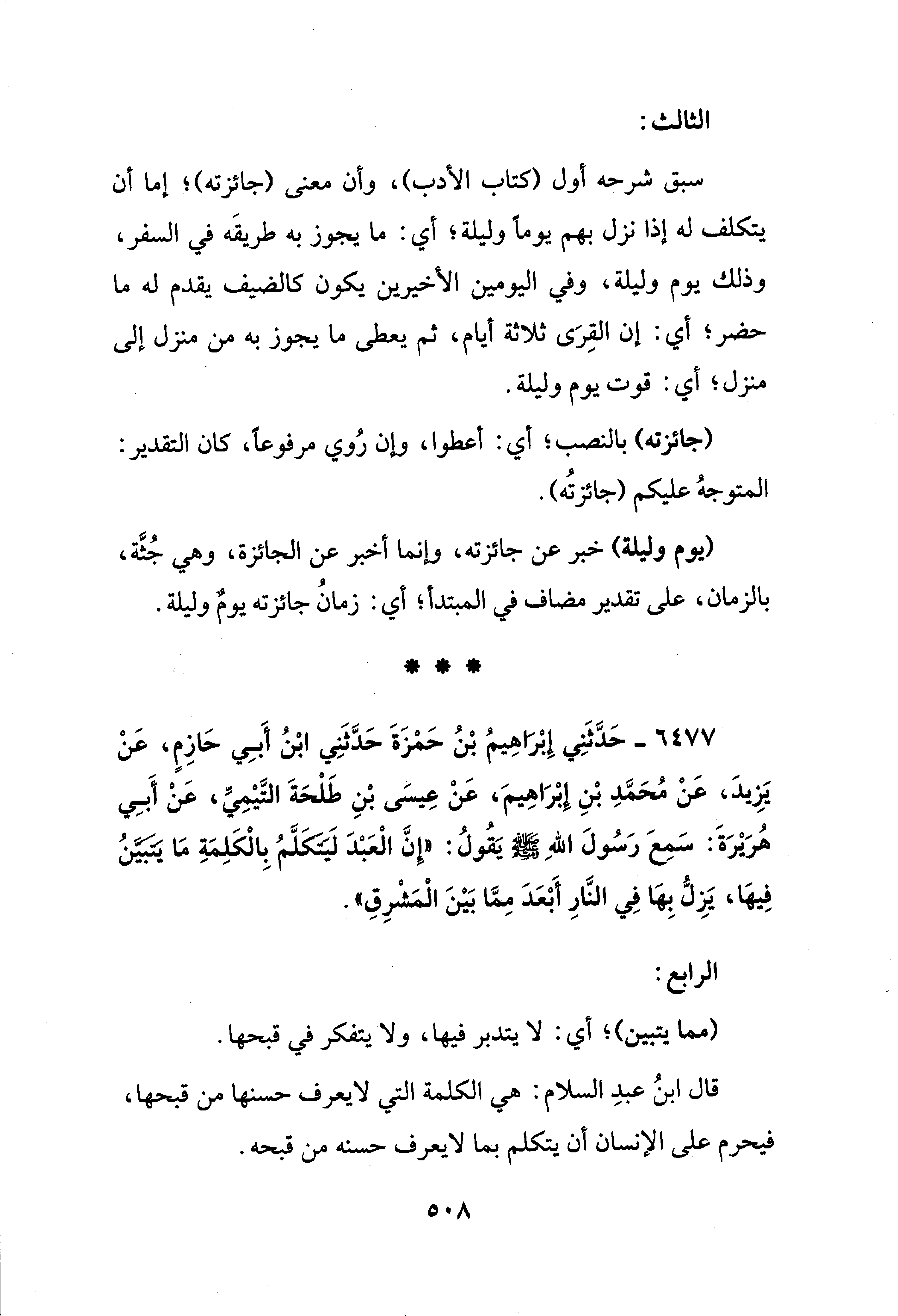 6477 - حَدَّثَنِي إِبْرَاهِيمُ بْنُ حَمْزَةَ حَدَّثَنِي ابْنُ أَبِي حَازِمٍ، عَنْ يَزِيدَ، عَنْ مُحَمَّدِ بْنِ إِبْرَاهِيمَ، عَنْ عِيسَى بْنِ طَلْحَةَ التَّيْمِيِّ، عَنْ أَبِي هُرَيْرَةَ: سَمِعَ رَسُولَ اللهِ - صلى الله عليه وسلم - يَقُولُ: "إِنَّ الْعَبْدَ لَيَتَكَلَّمُ بِالْكَلِمَةِ مَا يَتَبَيَّنُ فِيهَا، يَزِلُّ بِهَا فِي النَّارِ أَبْعَدَ مِمَّا بَيْنَ الْمَشْرِقِ".