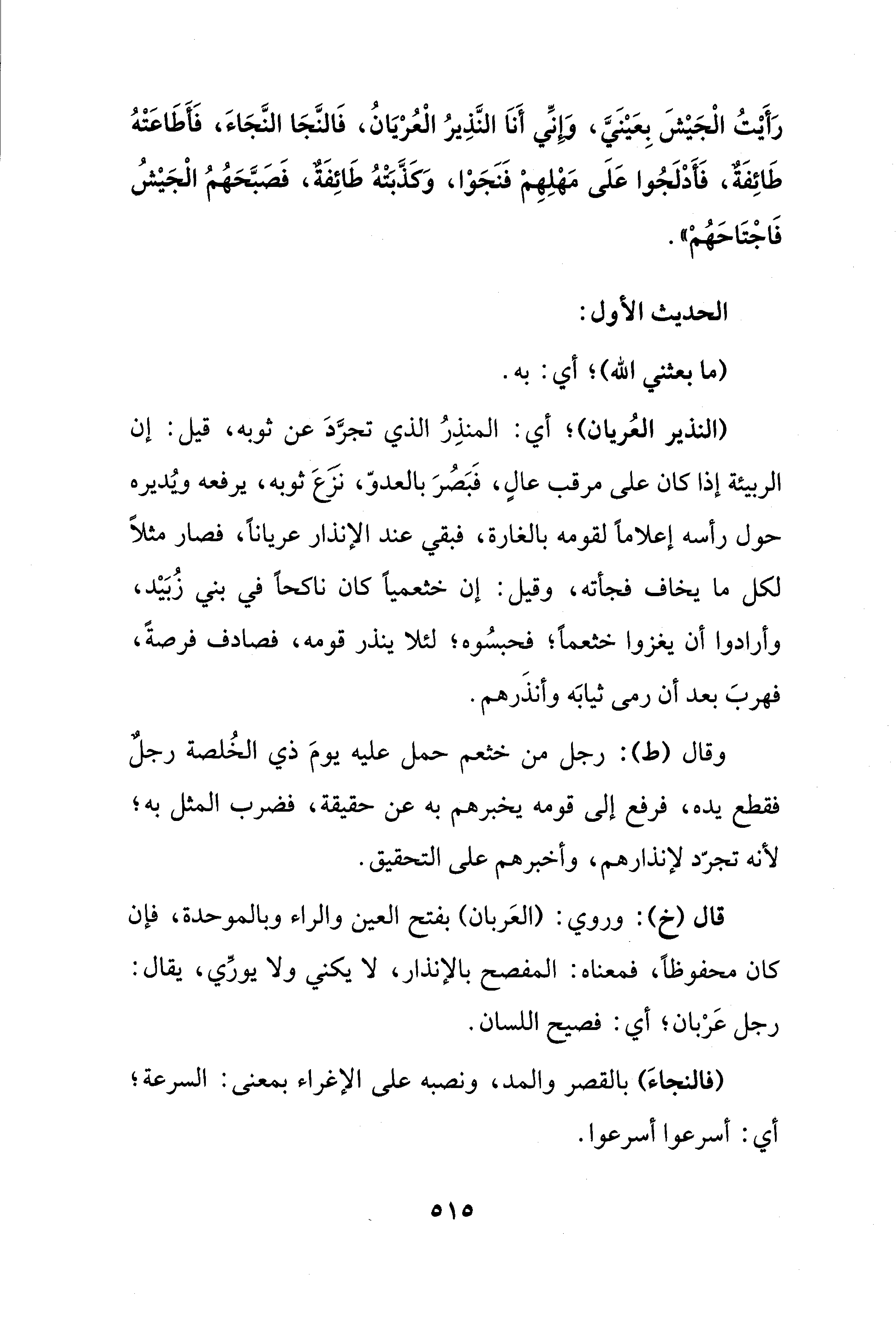 رَأَيْتُ الْجَيْشَ بِعَيْنَيَّ، وَإِنِّي أَنَا النَّذِيرُ الْعُرْيَانُ، فَالنَّجَا النَّجَاءَ، فَأَطَاعَتْهُ طَائِفَةٌ، فَأَدْلَجُوا عَلَى مَهْلِهِمْ فَنَجَوْا، وَكَذَّبَتْهُ طَائِفَةٌ، فَصَبَّحَهُمُ الْجَيْشُ فَاجْتَاحَهُمْ".