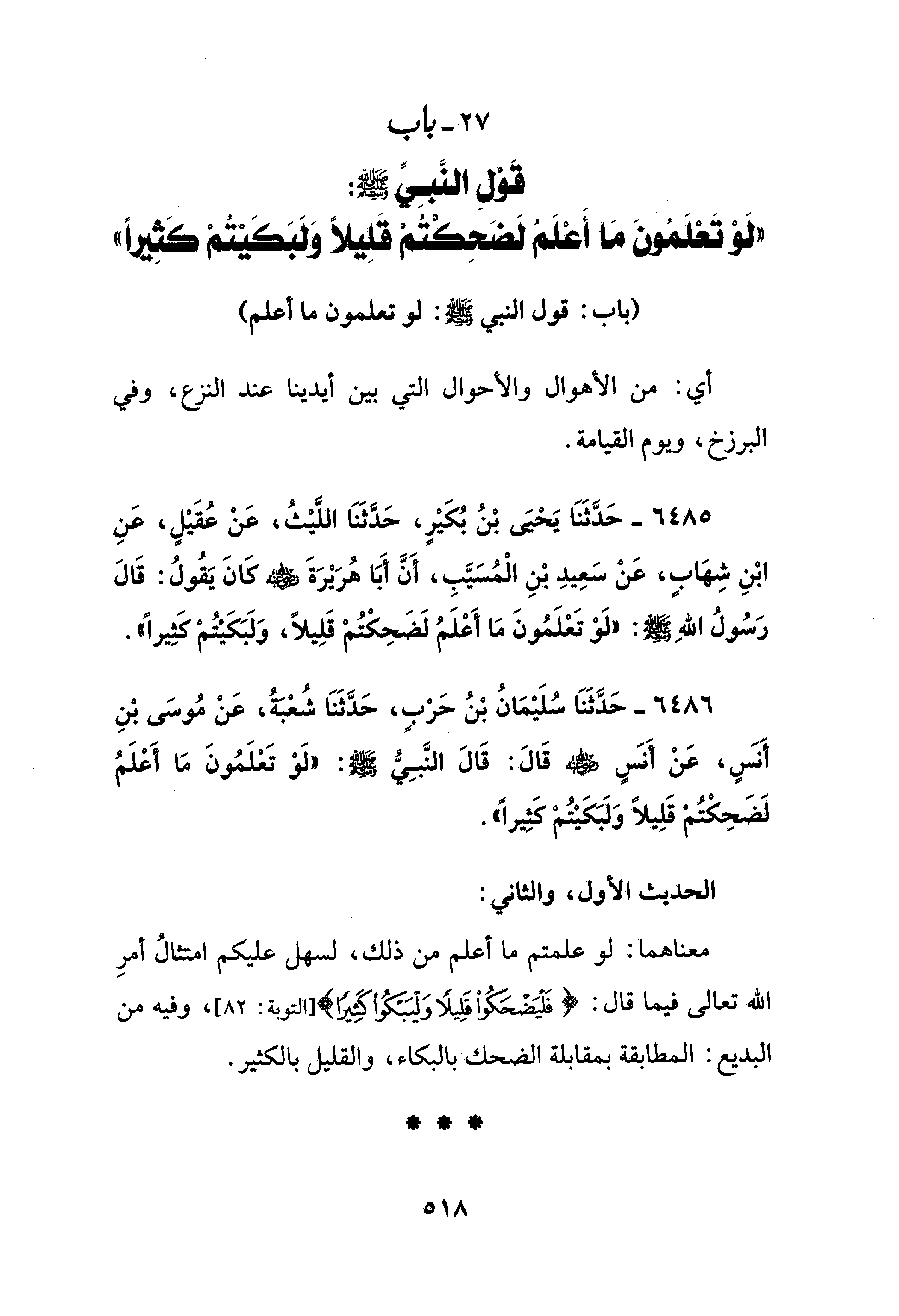 6486 - حَدَّثَنَا سُلَيْمَانُ بْنُ حَرْبٍ، حَدَّثَنَا شُعْبَةُ، عَنْ مُوسَى بْنِ أَنسٍ، عَنْ أَنسٍ - رضي الله عنه - قَالَ: قَالَ النَّبِيُّ - صلى الله عليه وسلم -: "لَوْ تَعْلَمُونَ مَا أَعْلَمُ لَضَحِكْتُمْ قَلِيلًا وَلَبَكَيْتُمْ كَثِيرًا".