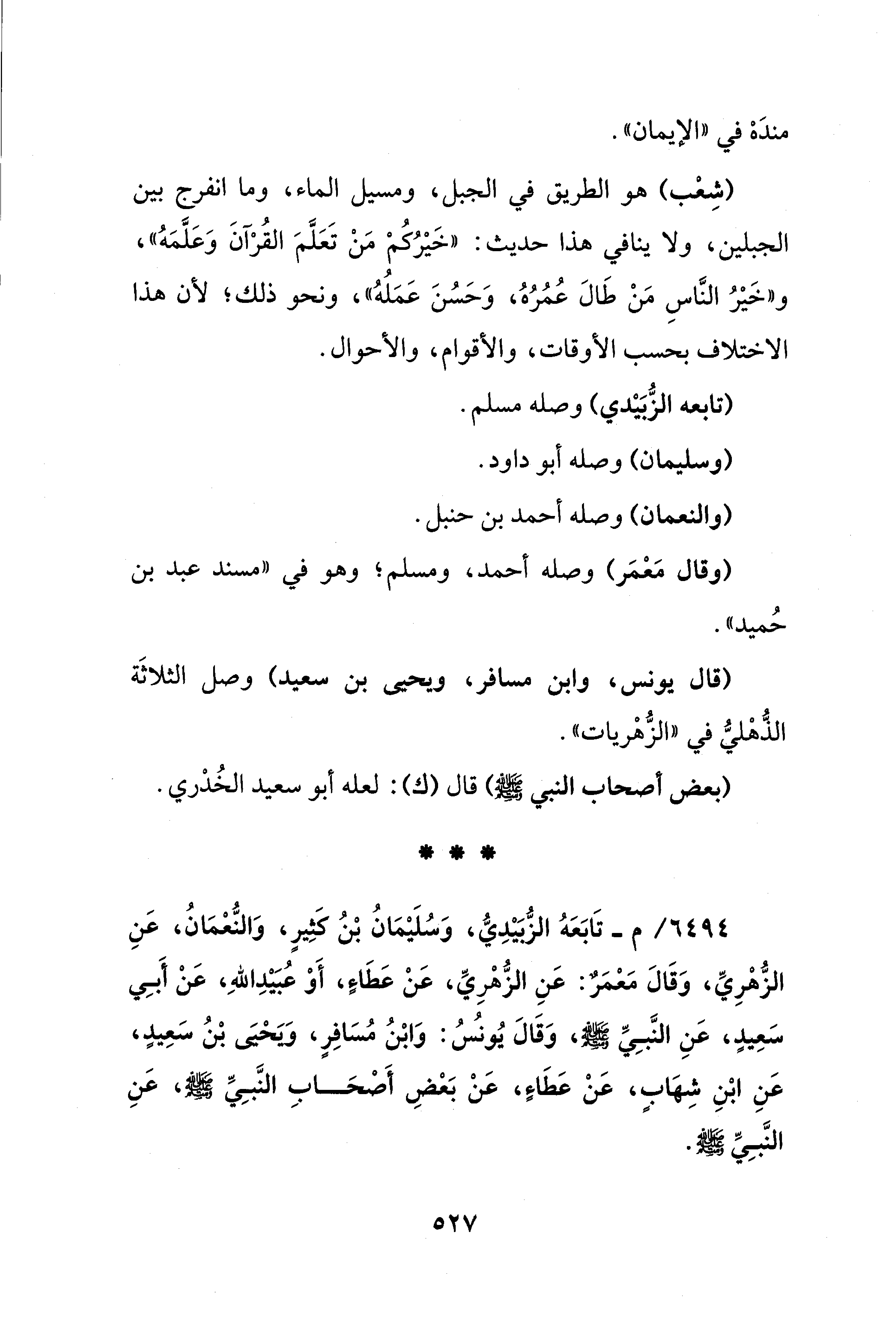 6494 / -م - تَابَعَهُ الزُّبَيْدِيُّ، وَسُلَيْمَانُ بْنُ كَثِيرٍ، وَالنُّعْمَانُ، عَنِ الزُّهْرِيِّ، وَقَالَ مَعْمَرٌ: عَنِ الزُّهْرِيِّ، عَنْ عَطَاءٍ، أَوْ عُبَيْدِ اللهِ، عَنْ أَبِي سَعِيدٍ، عَنِ النَّبِيِّ - صلى الله عليه وسلم -، وَقَالَ يُونُسُ: وَابْنُ مُسَافِرٍ، وَيَحْيَىَ بْنُ سَعِيدٍ، عَنِ ابْنِ شِهَابٍ، عَنْ عَطَاءٍ، عَنْ بَعْضِ أَصْحَابِ النَّبِيِّ - صلى الله عليه وسلم -، عَنِ النَّبِيِّ - صلى الله عليه وسلم -.