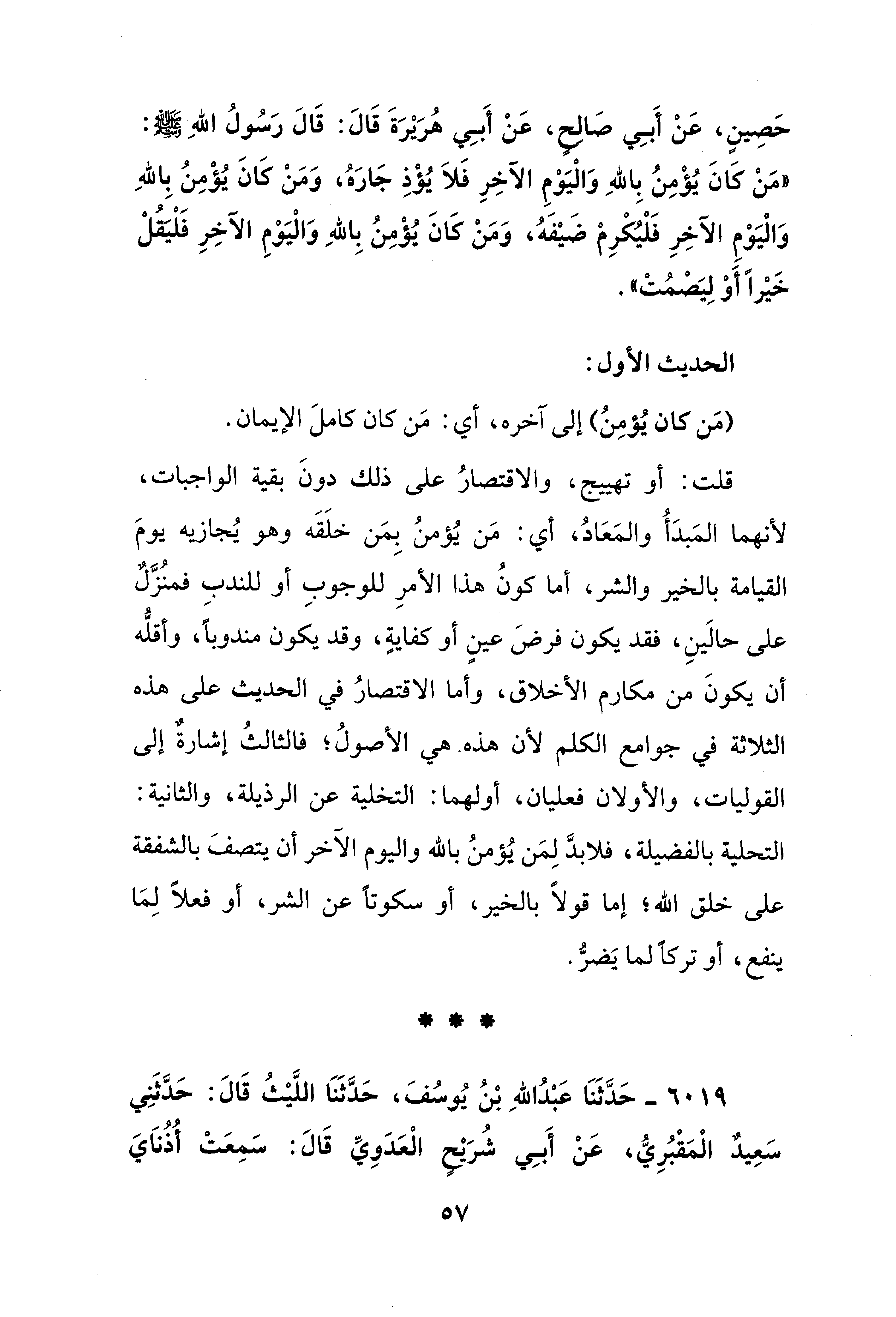 حَصِينٍ، عَنْ أَبِي صَالِحٍ، عَنْ أَبِي هُرَيرَةَ قَالَ: قَالَ رَسُولُ اللهِ - صلى الله عليه وسلم -: "مَنْ كَانَ يُؤْمِنُ بِاللهِ وَالْيَوْمِ الآخِرِ فَلَا يُؤْذِ جَارَهُ، وَمَنْ كَانَ يُؤْمِنُ بِاللهِ وَالْيَوْمِ الآخِرِ فَلْيُكْرِمْ ضَيْفَهُ، وَمَنْ كَانَ يُؤْمِنُ بِاللهِ وَالْيَوْمِ الآخِرِ فَلْيقُلْ خَيْرًا أَوْ لِيَصْمُتْ".
