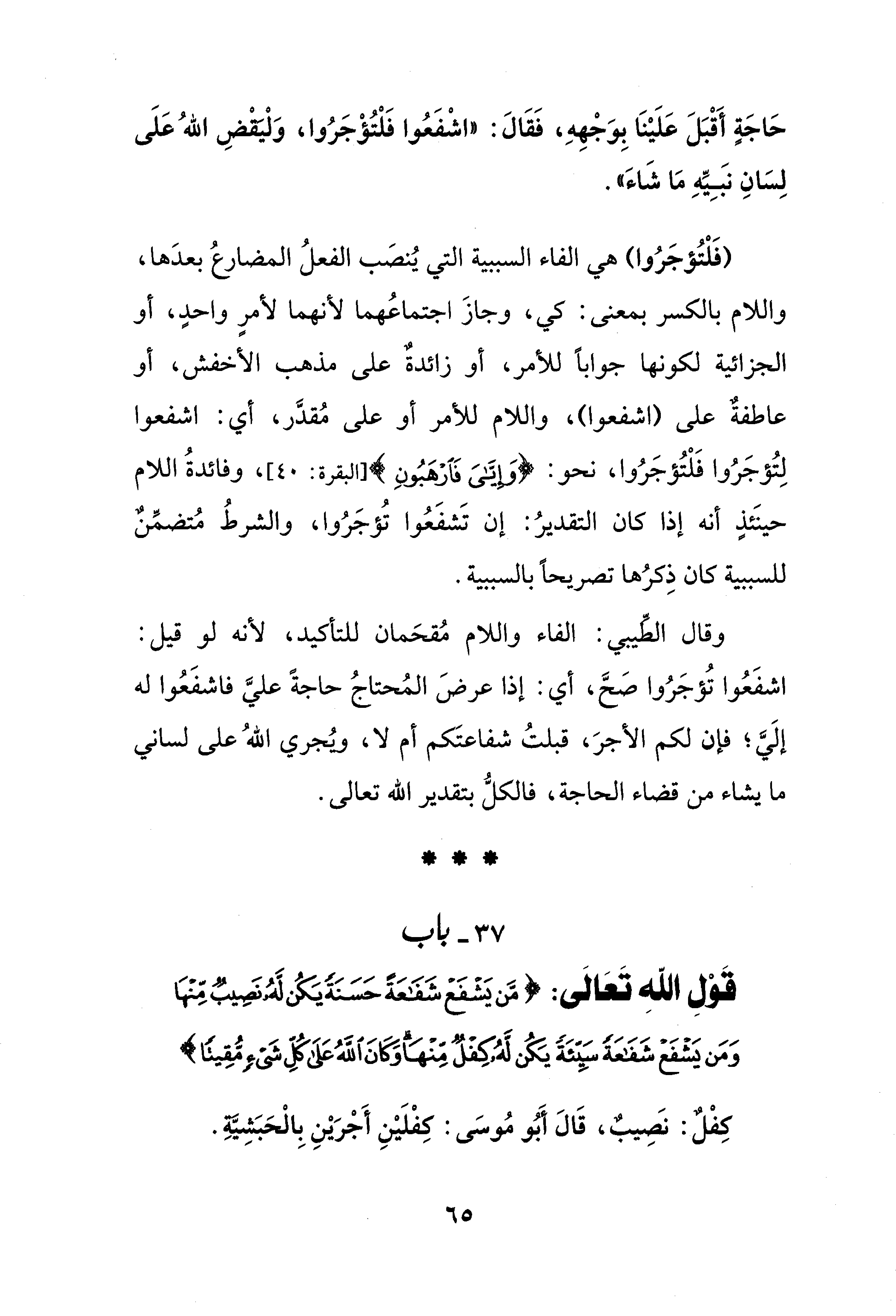 وقال الطِّيبي: الفاء واللام مُقحَمان للتأكيد، لأنه لو قيل: اشفَعُوا تُؤجَرُوا صَحَّ، أي: إذا عرضَ المُحتاجُ حاجةً عليَّ فاشفَعُوا له إلَيَّ؛ فإن لكم الأجرَ، قبلتُ شفاعتَكم أم لا، ويُجري اللهُ على لساني ما يشاء من قضاء الحاجة، فالكلُّ بتقدير الله تعالى.