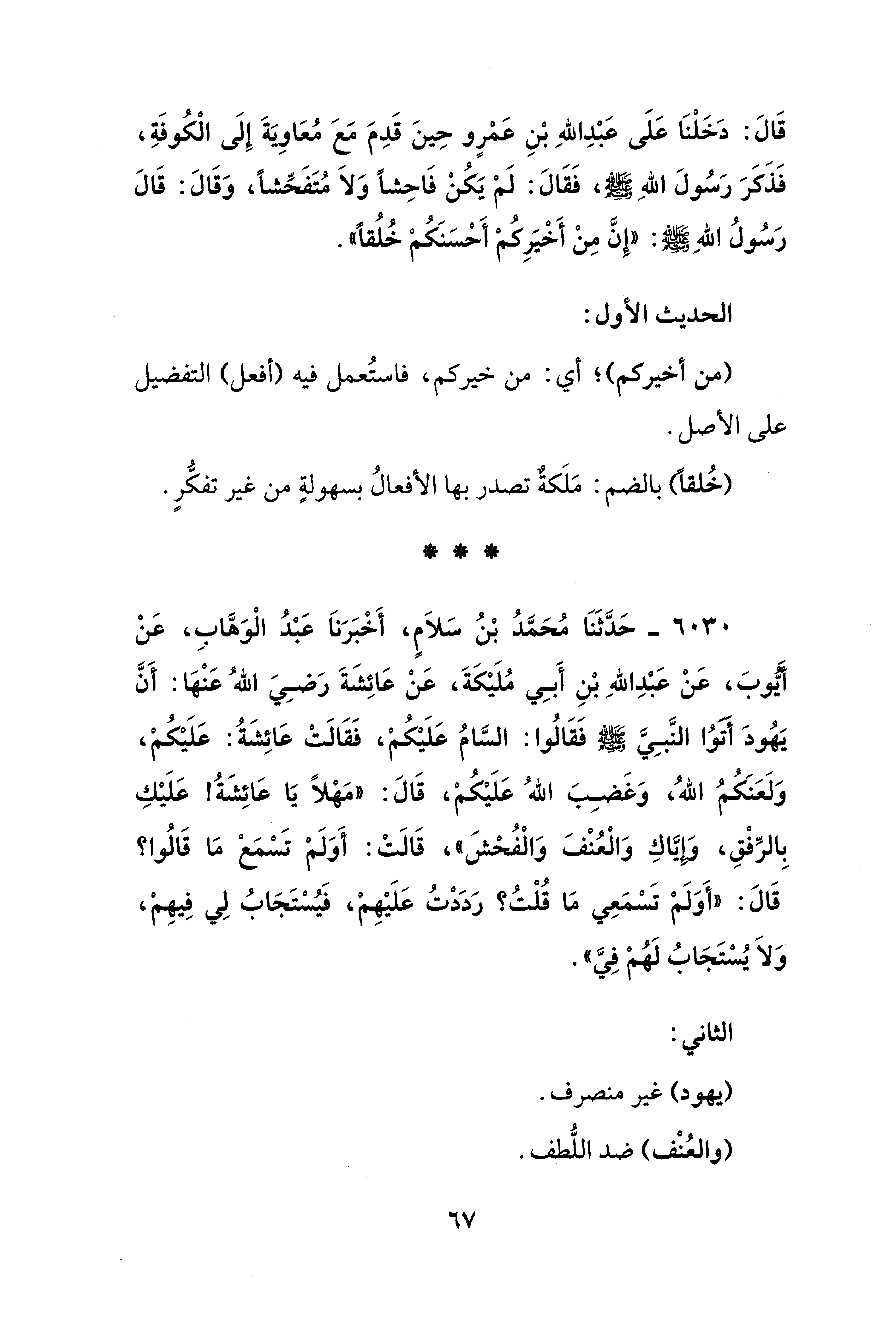 قَالَ: دَخَلْنَا عَلَى عَبْدِ اللهِ بْنِ عَمْرٍو حِينَ قَدِمَ مَعَ مُعَاوِيَةَ إِلَى الْكُوفَةِ، فَذَكَرَ رَسُولَ اللهِ - صلى الله عليه وسلم -، فَقَالَ: لَمْ يَكُنْ فَاحِشًا وَلاَ مُتَفَحِّشًا، وَقَالَ: قَالَ رَسُولُ اللهِ - صلى الله عليه وسلم -: "إِنَّ مِنْ أَخْيَرِكُمْ أَحْسَنَكُمْ خُلُقًا".