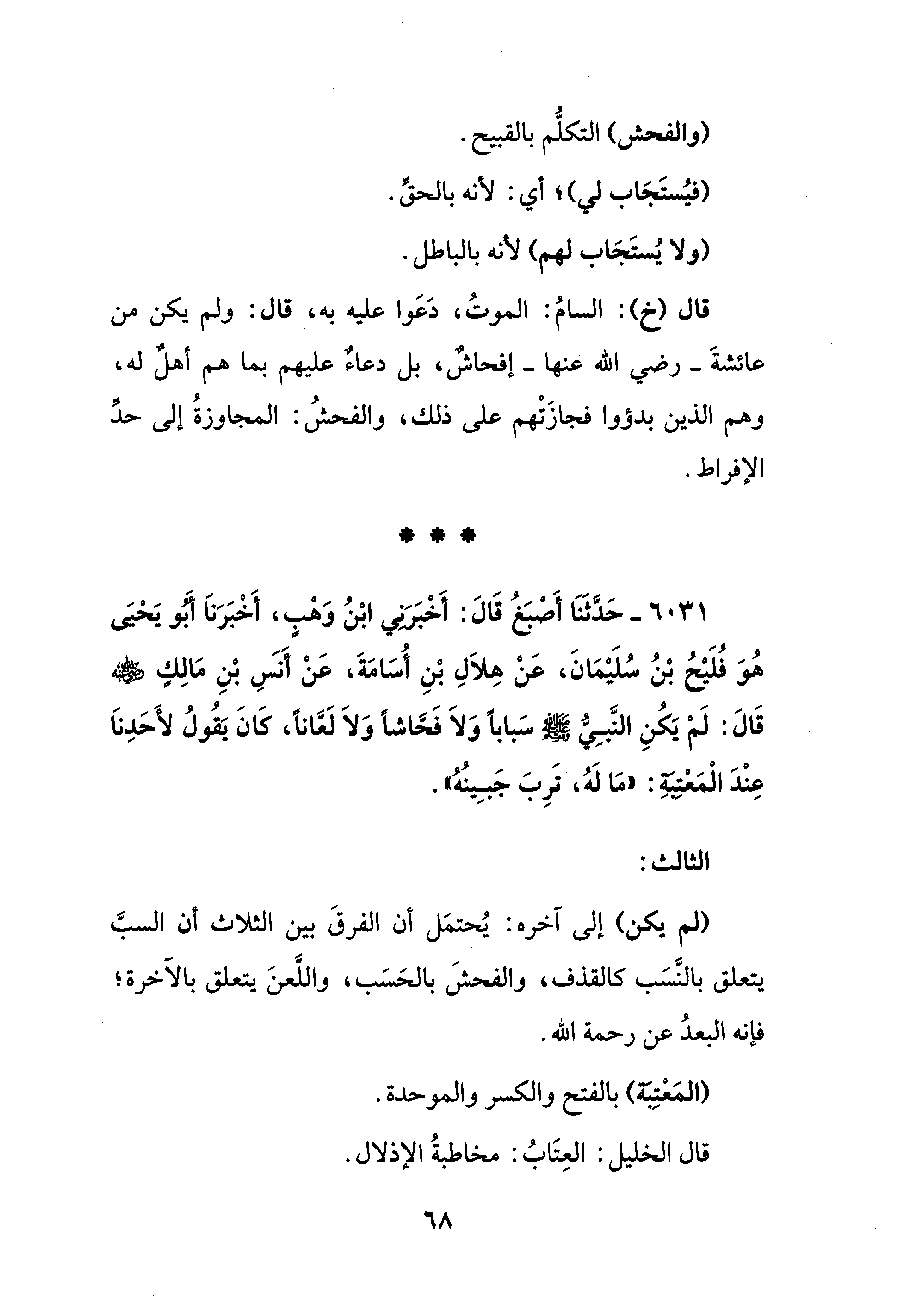 6031 - حَدَّثَنَا أَصْبَغُ قَالَ: أَخْبَرَنِي ابْنُ وَهْبٍ، أَخْبَرَنَا أَبُو يَحْيَى هُوَ فُلَيْحُ بْنُ سُلَيْمَانَ، عَنْ هِلاَلِ بْنِ أُسَامَةَ، عَنْ أَنس بْنِ مَالِكٍ - رضي الله عنه - قَالَ: لَمْ يَكُنِ النَّبِيُّ - صلى الله عليه وسلم - سَبابًا وَلاَ فَحَّاشًا وَلاَ لَعَّانًا، كَانَ يَقُولُ لأَحَدِناَ عِنْدَ الْمَعْتِبةِ: "مَا لَهُ، تَرِبَ جَبِينُهُ".