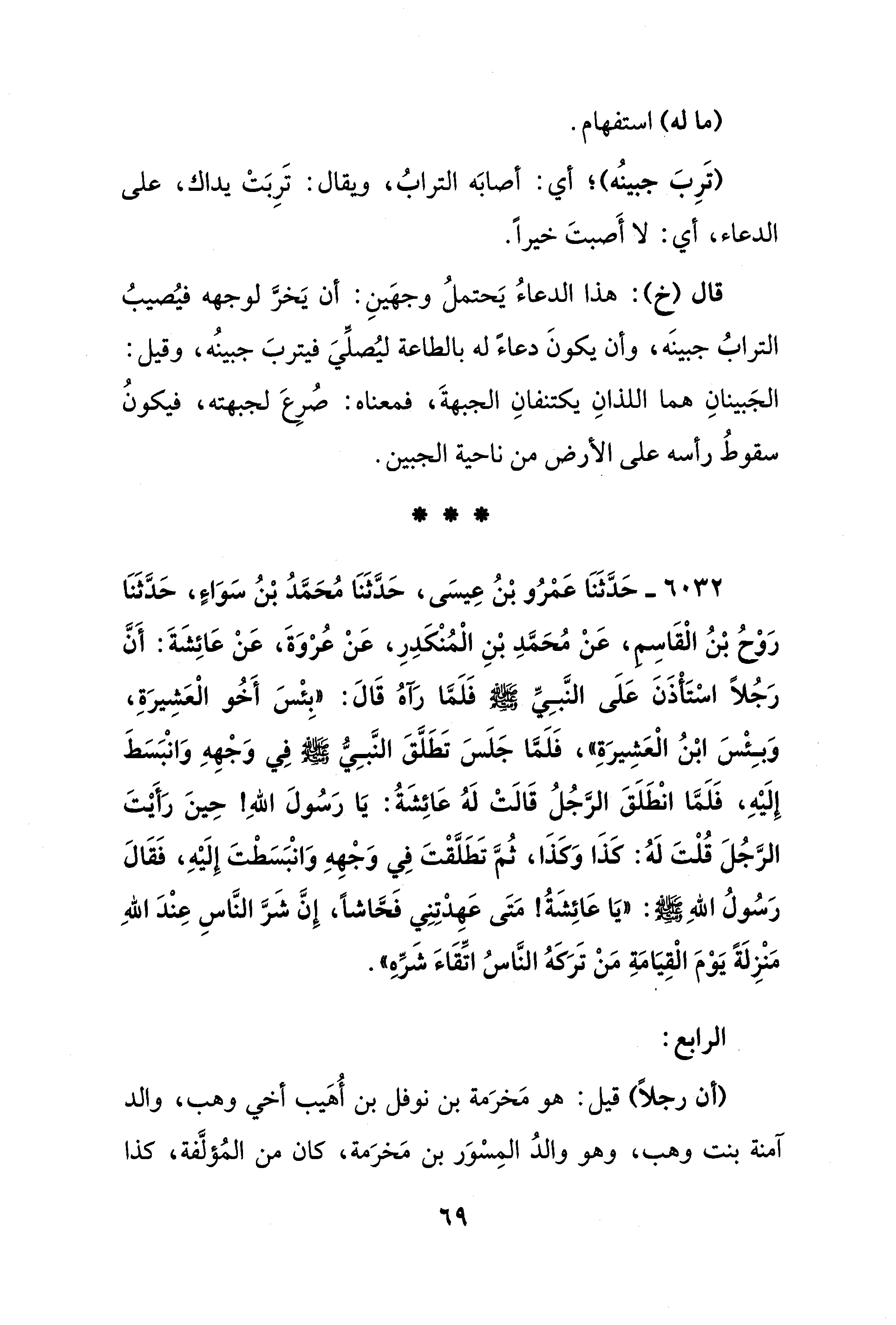 6032 - حَدَّثَنَا عَمْرُو بْنُ عِيسَى، حَدَّثَنَا مُحَمَّدُ بْنُ سَوَاءٍ، حَدَّثَنَا رَوْحُ بْنُ الْقَاسِمِ، عَنْ مُحَمَّدِ بْنِ الْمُنْكَدِرِ، عَنْ عُرْوَةَ، عَنْ عَائِشَةَ: أَنَّ رَجُلًا اسْتَأْذَنَ عَلَى النَّبِيِّ - صلى الله عليه وسلم - فَلَمَّا رَآهُ قَالَ: "بِئْسَ أَخُو الْعَشِيرَةِ، وَبِئْسَ ابْنُ الْعَشِيرَةِ"، فَلَمَّا جَلَسَ تَطَلَّقَ النَّبِيُّ - صلى الله عليه وسلم - فِي وَجْهِهِ وَانْبَسَطَ إِلَيْهِ، فَلَمَّا انْطَلَقَ الرَّجُلُ قَالَتْ لَهُ عَائِشَةُ: يَا رَسُولَ اللهِ! حِينَ رَأَيْتَ الرَّجُلَ قُلْتَ لَهُ: كَذَا وَكَذَا، ثُمَّ تَطَلَّقْتَ فِي وَجْهِهِ وَانْبَسَطْتَ إِلَيْهِ، فَقَالَ رَسُولُ اللهِ - صلى الله عليه وسلم -: "يَا عَائِشَةُ! مَتَى عَهِدْتِنِي فَحَّاشًا، إِنَّ شَرَّ النَّاسِ عِنْدَ اللهِ مَنْزِلَةً يَوْمَ الْقِيَامَةِ مَنْ تَرَكَهُ النَّاسُ اتِّقَاءَ شَرِّهِ".