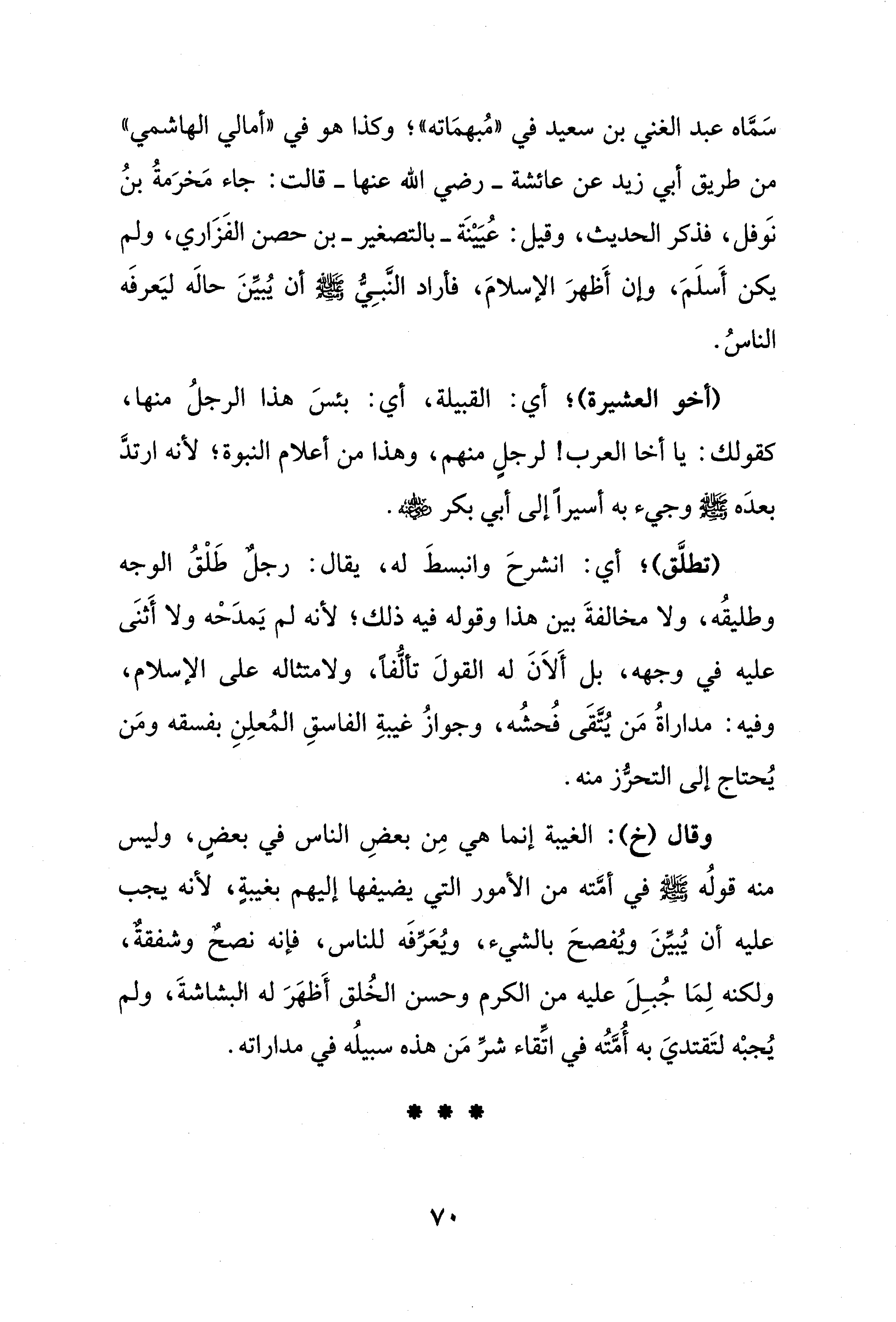 وقال (خ): الغيبة إنما هي مِن بعضِ الناس في بعضٍ، وليس منه قولُه - صلى الله عليه وسلم - في أمَّته من الأمور التي يضيفها إليهم بغيبةٍ، لأنه يجب عليه أن يُبيِّنَ ويُفصحَ بالشيء، ويُعَرِّفَه للناس، فإنه نصحٌ وشفقةٌ، ولكنه لِمَا جُبِلَ عليه من الكرم وحسن الخُلق أَظهَرَ له البشاشةَ، ولم يُجبْه لتَقتديَ به أُمَّتُه في اتِّقاء شرِّ مَن هذه سبيلُه في مداراته.