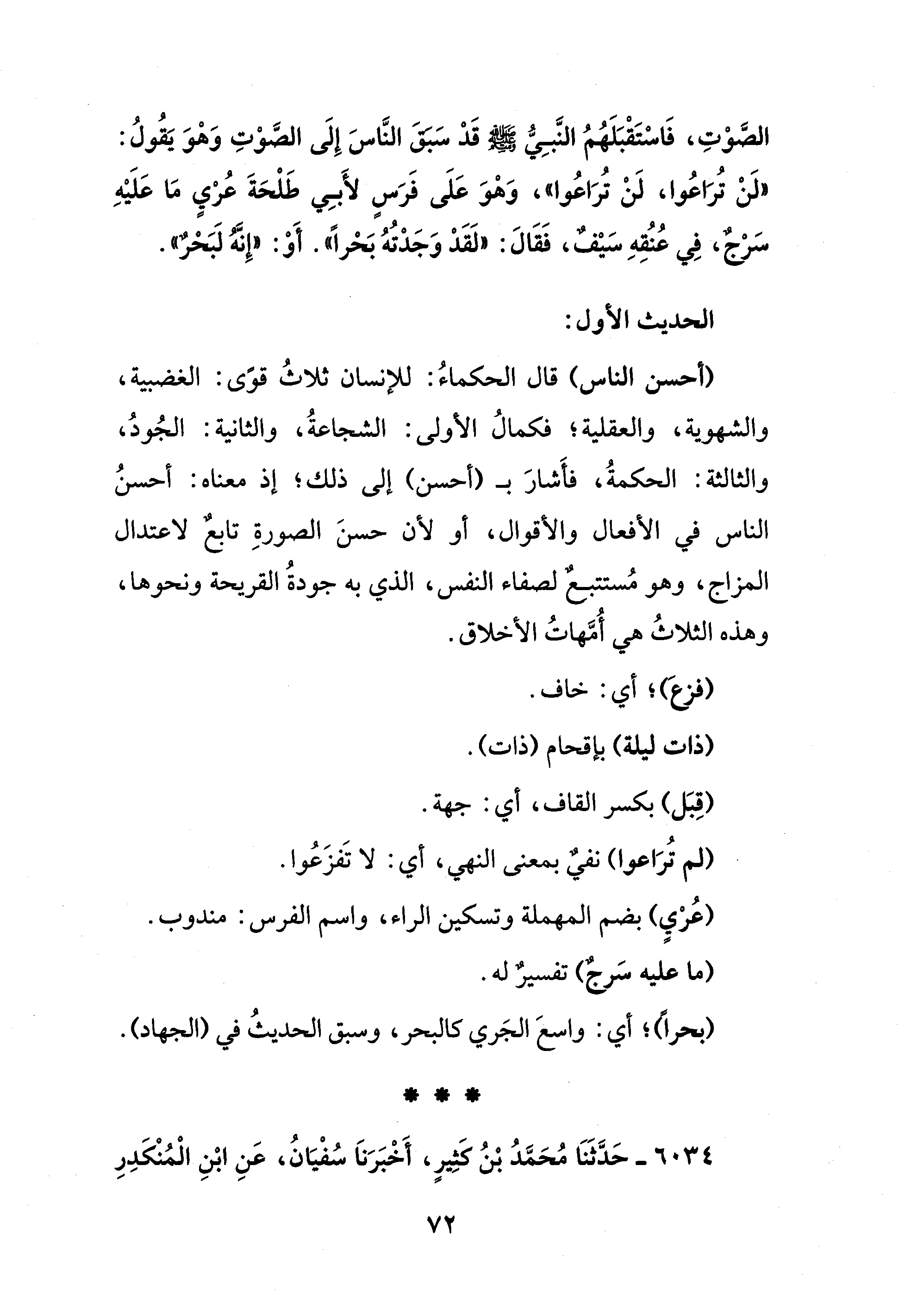 الصَّوْتِ، فَاسْتَقْبَلَهُمُ النَّبِيُّ - صلى الله عليه وسلم - قَدْ سَبَقَ النَّاسَ إِلَى الصَّوْتِ وَهْوَ يَقُولُ: "لَنْ تُرَاعُوا، لَنْ تُرَاعُوا"، وَهْوَ عَلَى فَرَسٍ لأَبِي طَلْحَةَ عُرْيٍ مَا عَلَيْهِ سَرْجٌ، فِي عُنُقِهِ سَيْفٌ، فَقَالَ: "لَقَدْ وَجَدْتُهُ بَحْرًا". أَوْ: "إِنَّهُ لَبَحْرٌ".