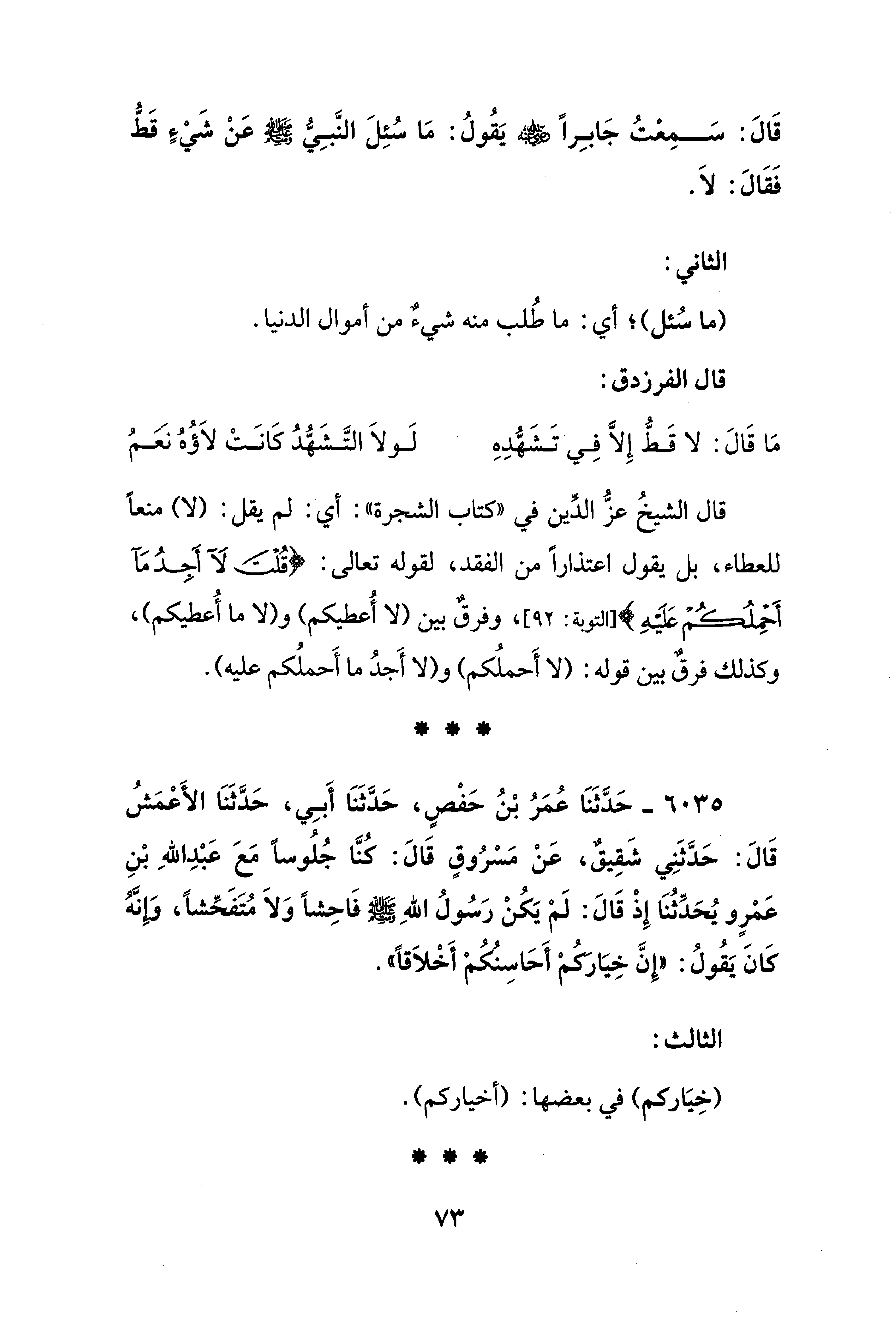 قَالَ: سَمِعْتُ جَابِرًا - رضي الله عنه - يَقُولُ: مَا سُئِلَ النَّبِيُّ - صلى الله عليه وسلم - عَنْ شَيْءٍ قَطُّ فَقَالَ: لاَ.