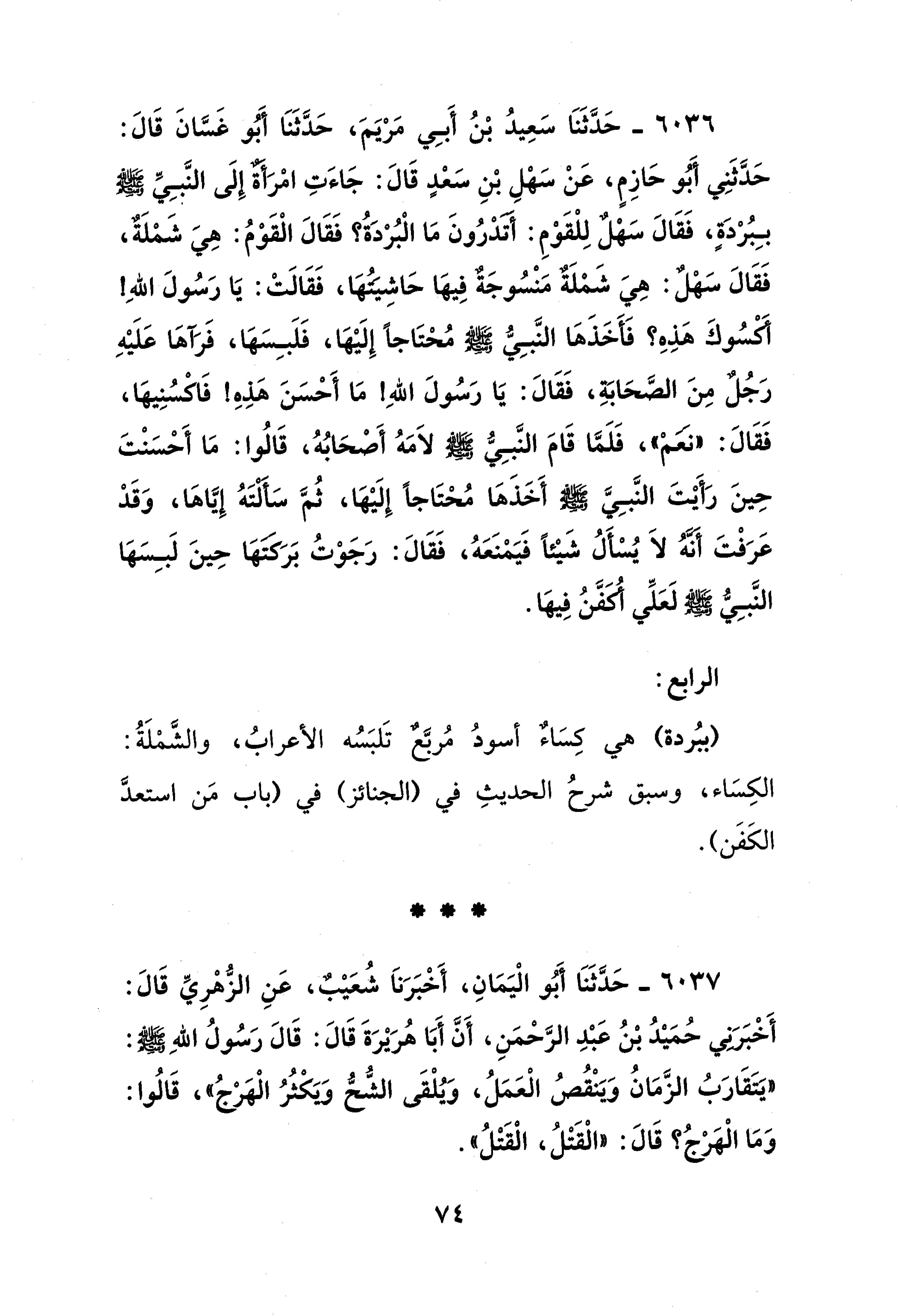 6036 - حَدَّثَنَا سَعِيدُ بْنُ أَبِي مَرْيَمَ، حَدَّثَنَا أَبُو غَسَّانَ قَالَ: حَدَّثَنِي أَبُو حَازِمٍ، عَنْ سَهْلِ بْنِ سَعْدٍ قَالَ: جَاءَتِ امْرَأَةٌ إِلَى النَّبِيِّ - صلى الله عليه وسلم - بِبُرْدَةٍ، فَقَالَ سَهْلٌ لِلْقَوْمِ: أَتَدْرُونَ مَا الْبُرْدَةُ؟ فَقَالَ الْقَوْمُ: هِيَ شَمْلَةٌ، فَقَالَ سَهْلٌ: هِيَ شَمْلَةٌ مَنْسُوجَةٌ فِيهَا حَاشِيِتُهَا، فَقَالَتْ: يَا رَسُولَ اللهِ! أَكْسُوكَ هَذِهِ؟ فَأَخَذَهَا النَّبِيُّ - صلى الله عليه وسلم - مُحْتَاجًا إِلَيْهَا، فَلَبِسَهَا، فَرَآهَا عَلَيْهِ رَجُلٌ مِنَ الصَّحَابَةِ، فَقَالَ: يَا رَسُولَ اللهِ! مَا أَحْسَنَ هَذِهِ! فَاكْسُنِيهَا، فَقَالَ: "نَعَمْ"، فَلَمَّا قَامَ النَّبِيُّ - صلى الله عليه وسلم - لاَمَهُ أَصْحَابُهُ، قَالُوا: مَا أَحْسَنْتَ حِينَ رَأَيْتَ النَّبِيَّ - صلى الله عليه وسلم - أَخَذَهَا مُحْتَاجًا إِلَيْهَا، ثُمَّ سَأَلْتَهُ إِيَّاهَا، وَقَدْ عَرَفْتَ أَنَّهُ لاَ يُسْأَلُ شَيْئًا فَيَمْنَعَهُ، فَقَالَ: رَجَوْتُ بَرَكَتَهَا حِينَ لَبِسَهَا النَّبِيُّ - صلى الله عليه وسلم - لَعَلِّي أُكَفَّنُ فِيهَا.