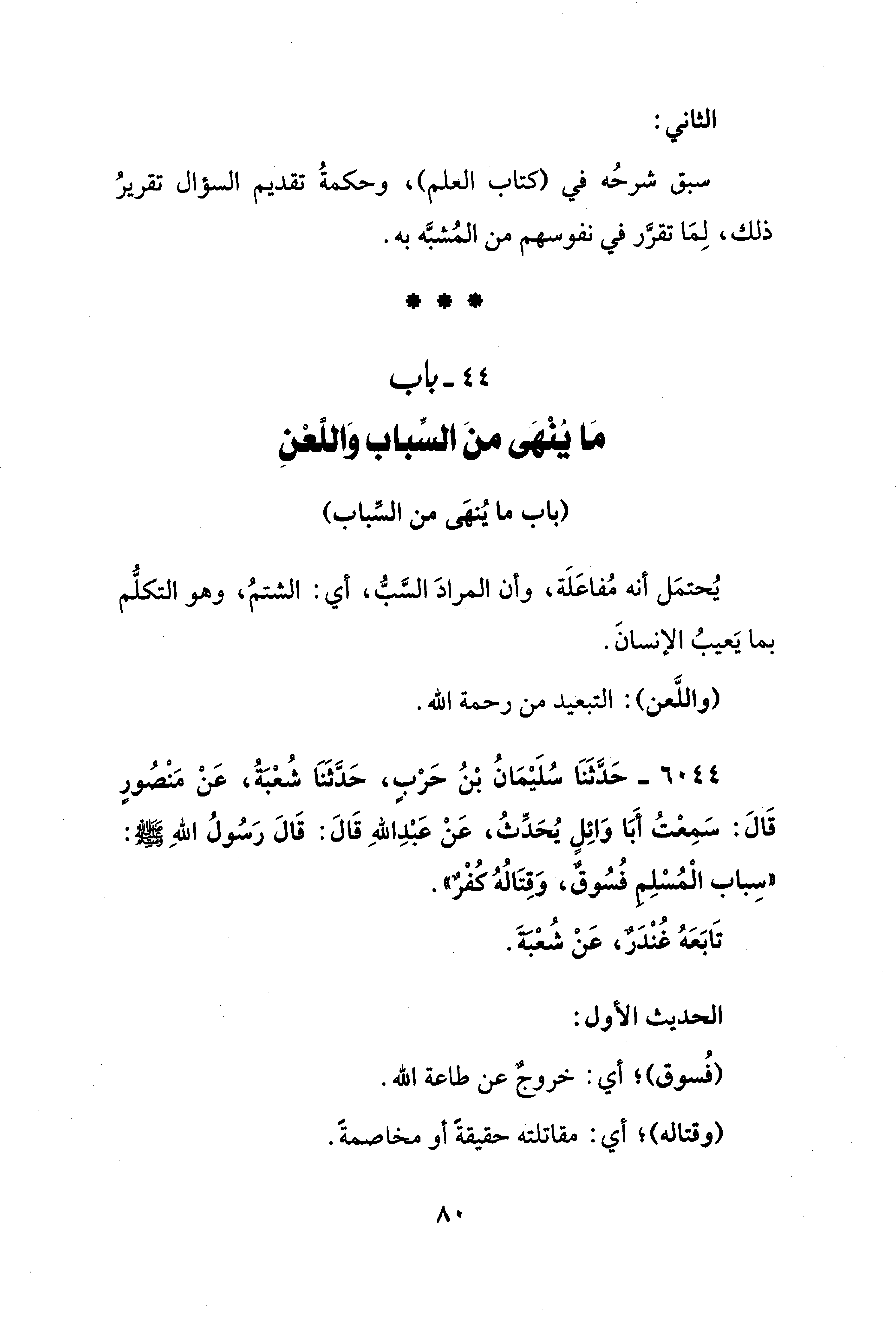 6044 - حَدَّثَنَا سُلَيْمَانُ بْنُ حَرْبٍ، حَدَّثَنَا شُعْبَةُ، عَنْ مَنْصُورٍ قَالَ: سَمِعْتُ أَبَا وَائِلٍ يُحَدِّثُ، عَنْ عَبْدِ اللهِ قَالَ: قَالَ رَسُولُ اللهِ - صلى الله عليه وسلم -: "سِبابُ الْمُسْلِمِ فُسُوقٌ، وَقِتَالُهُ كفْرٌ".
